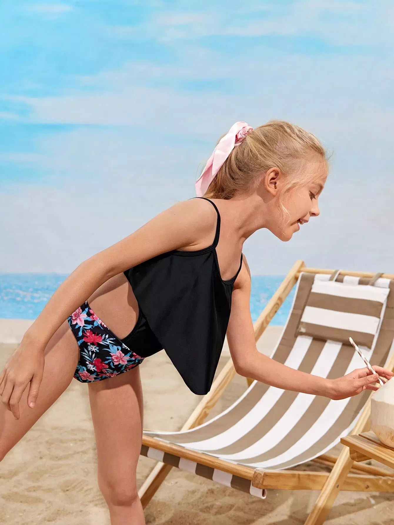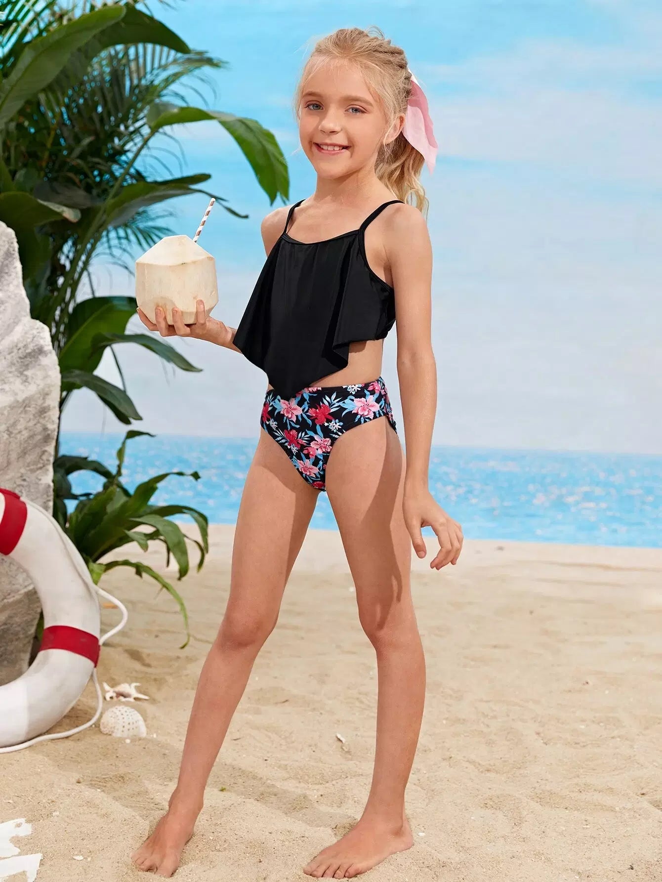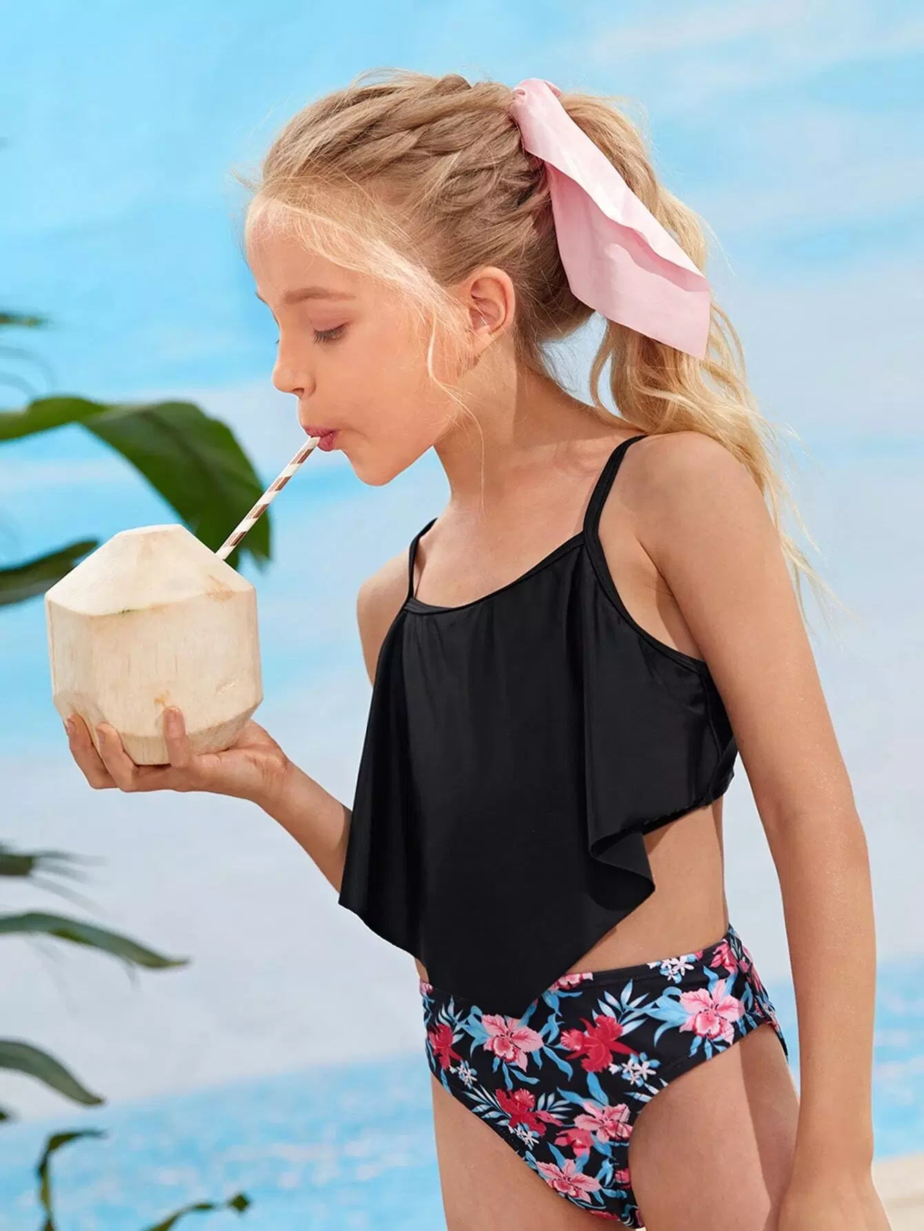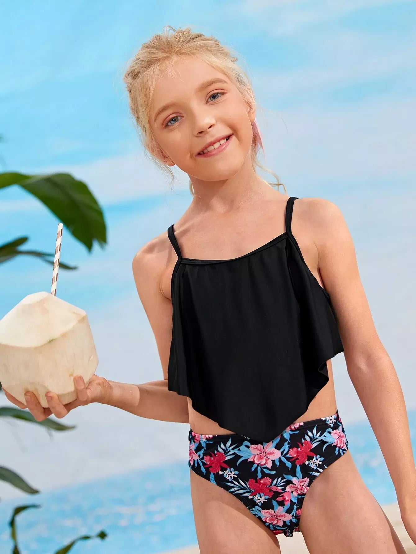 Girls Floral Print Hanky Hem One Piece Swimsuit