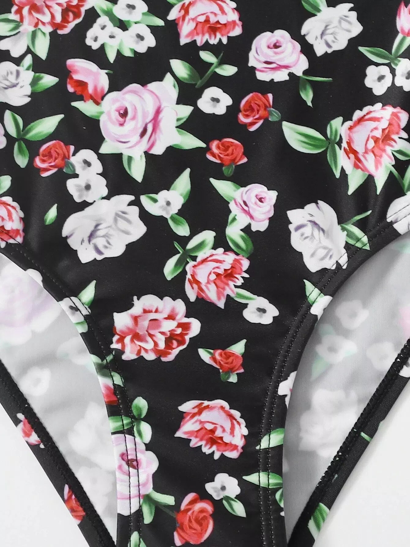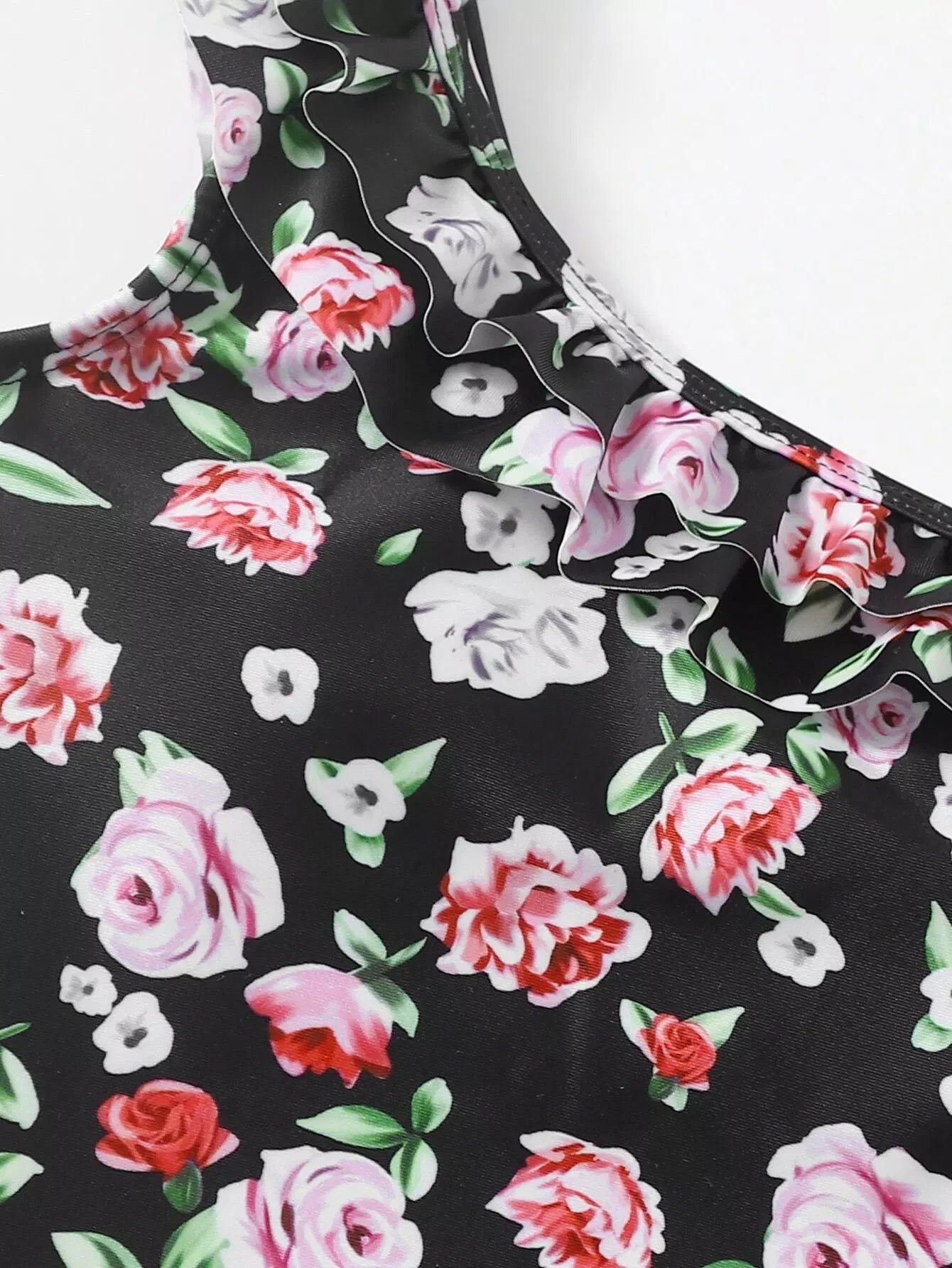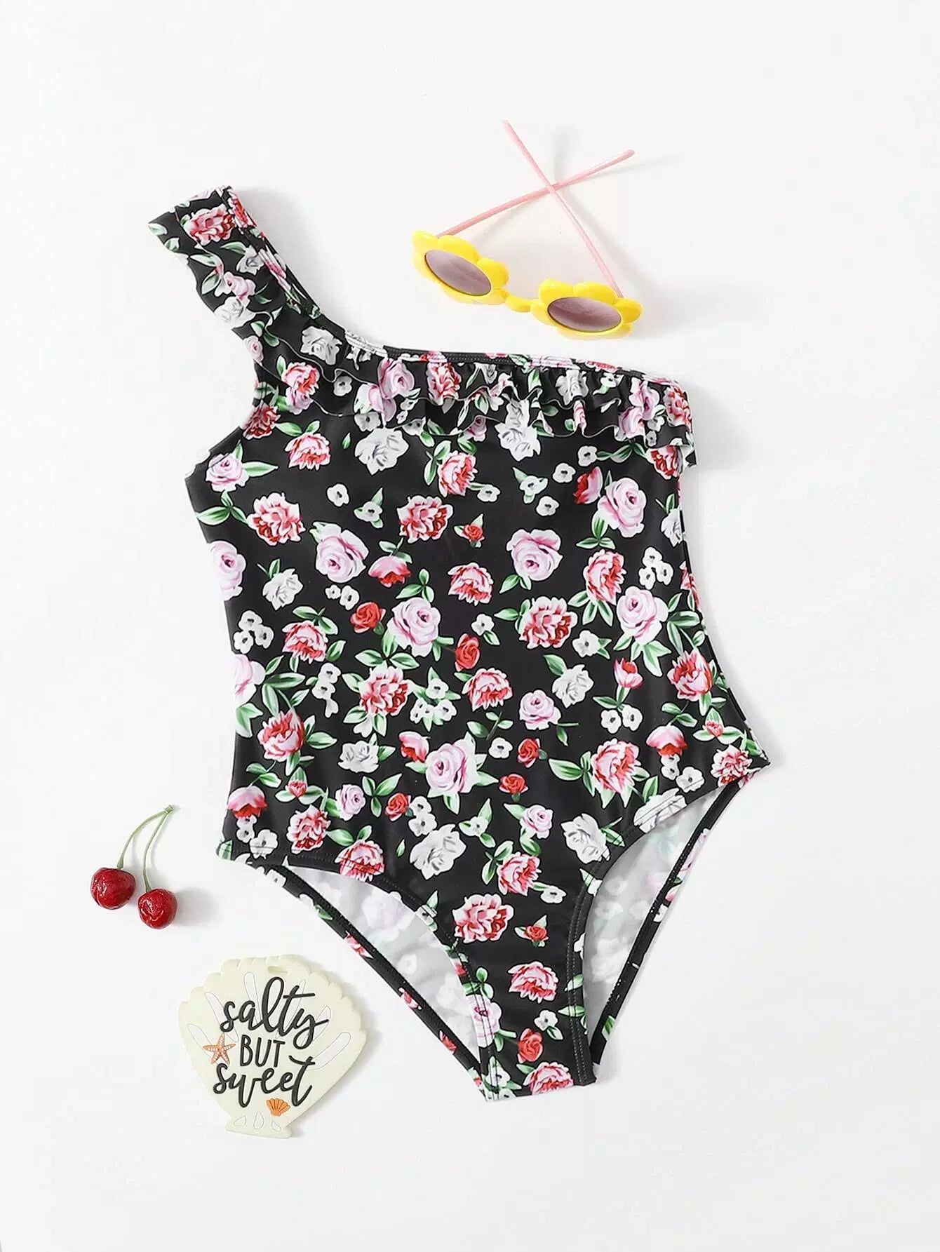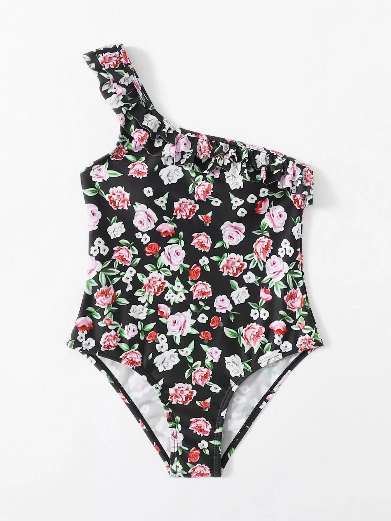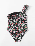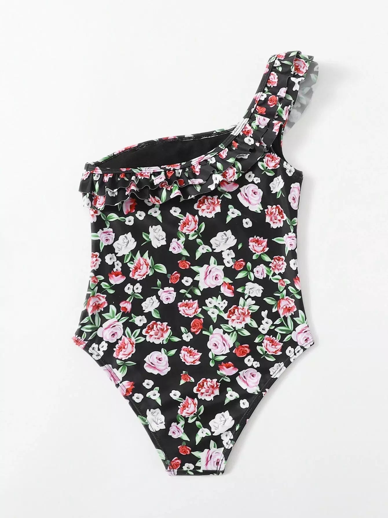 Girls Floral Ruffle One Shoulder One Piece Swimsuit