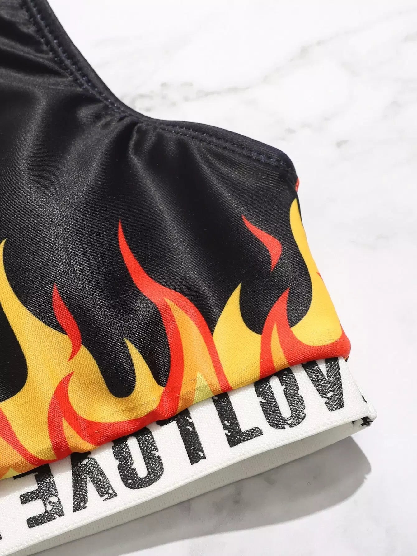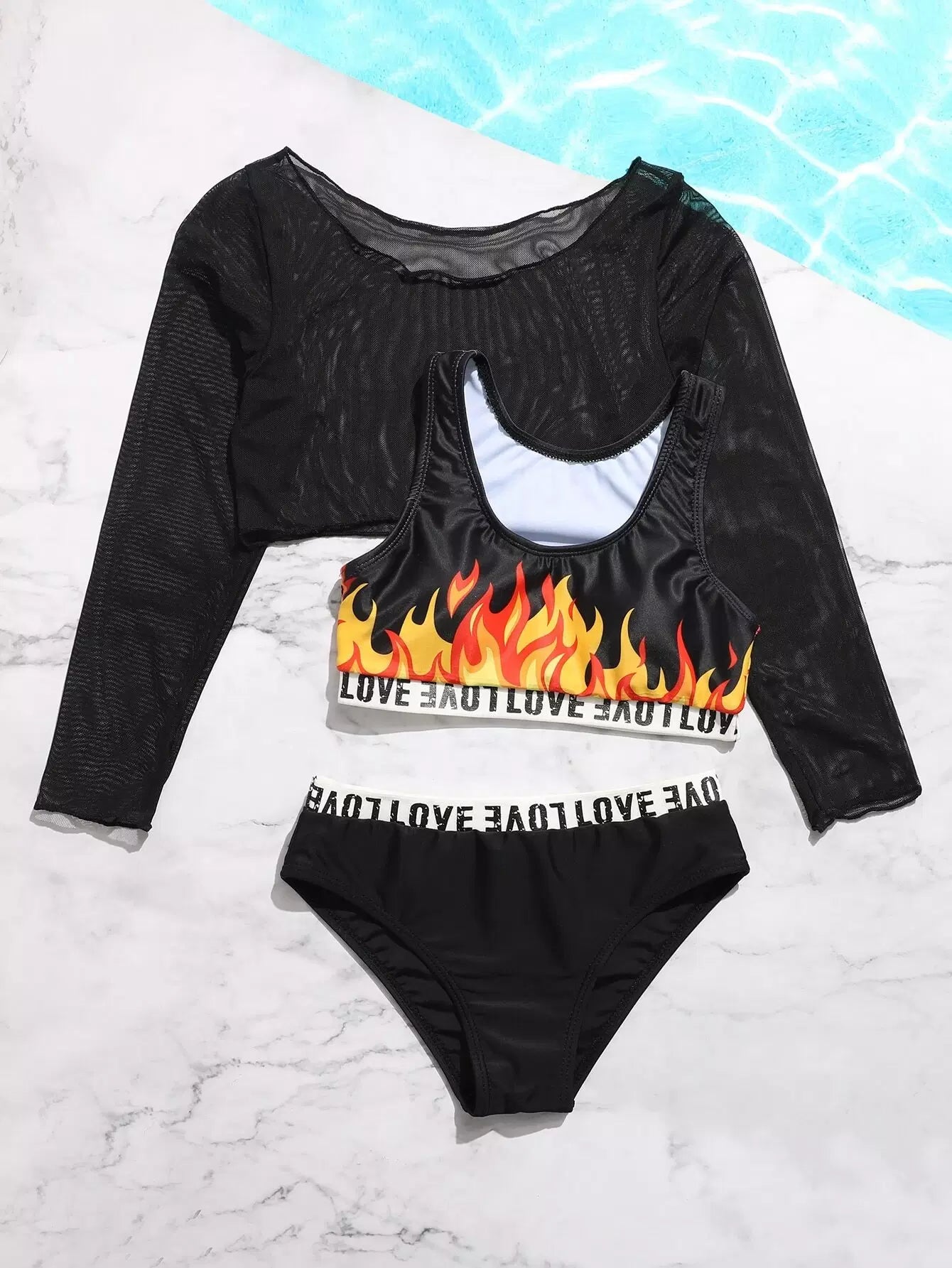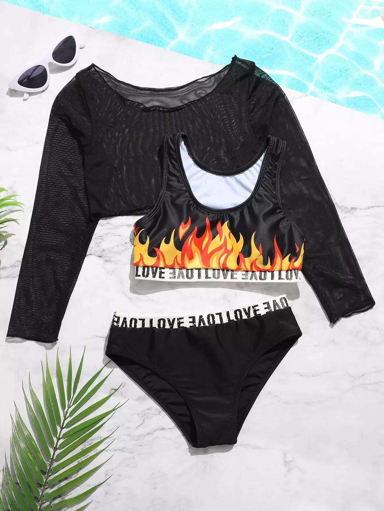 3pack Girls Fire Print Letter Tape Bikini Swimsuit