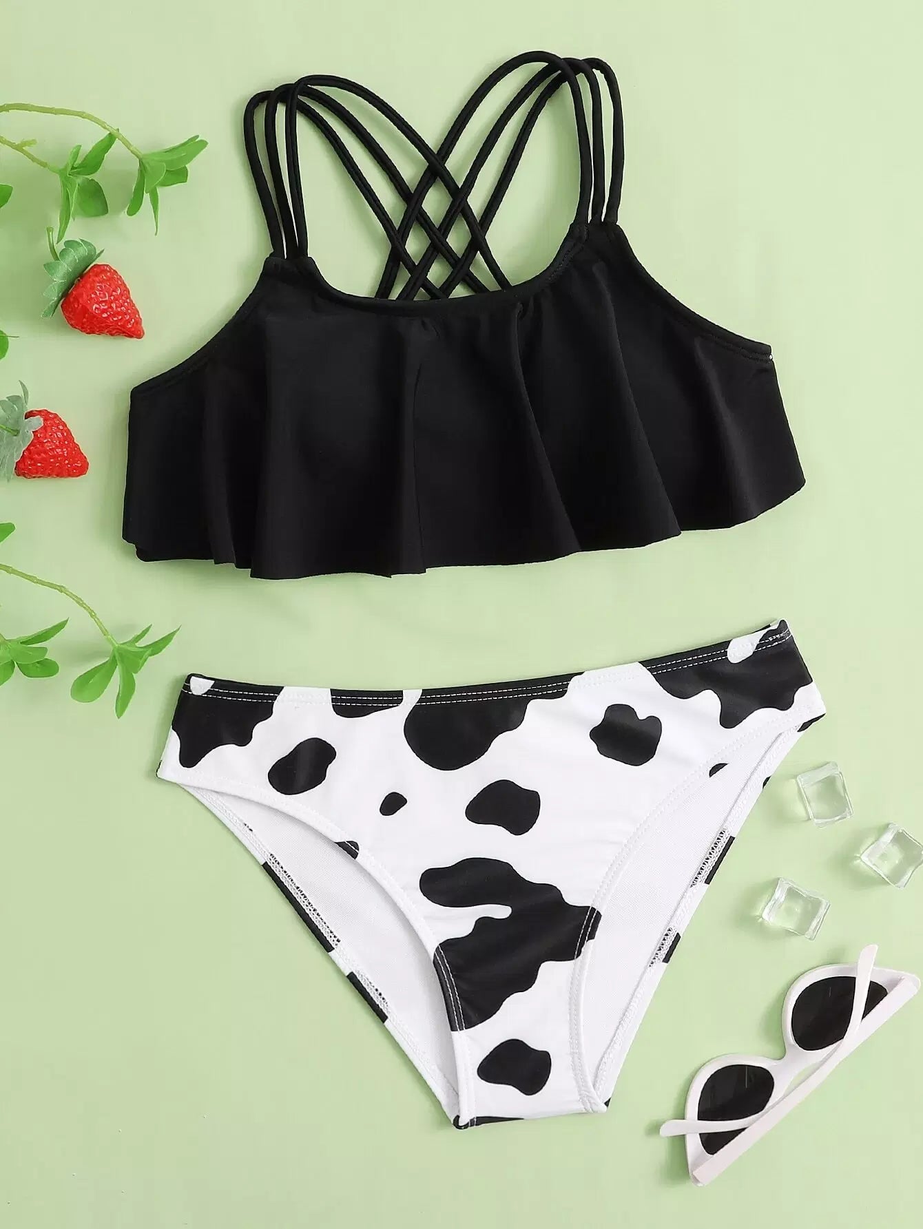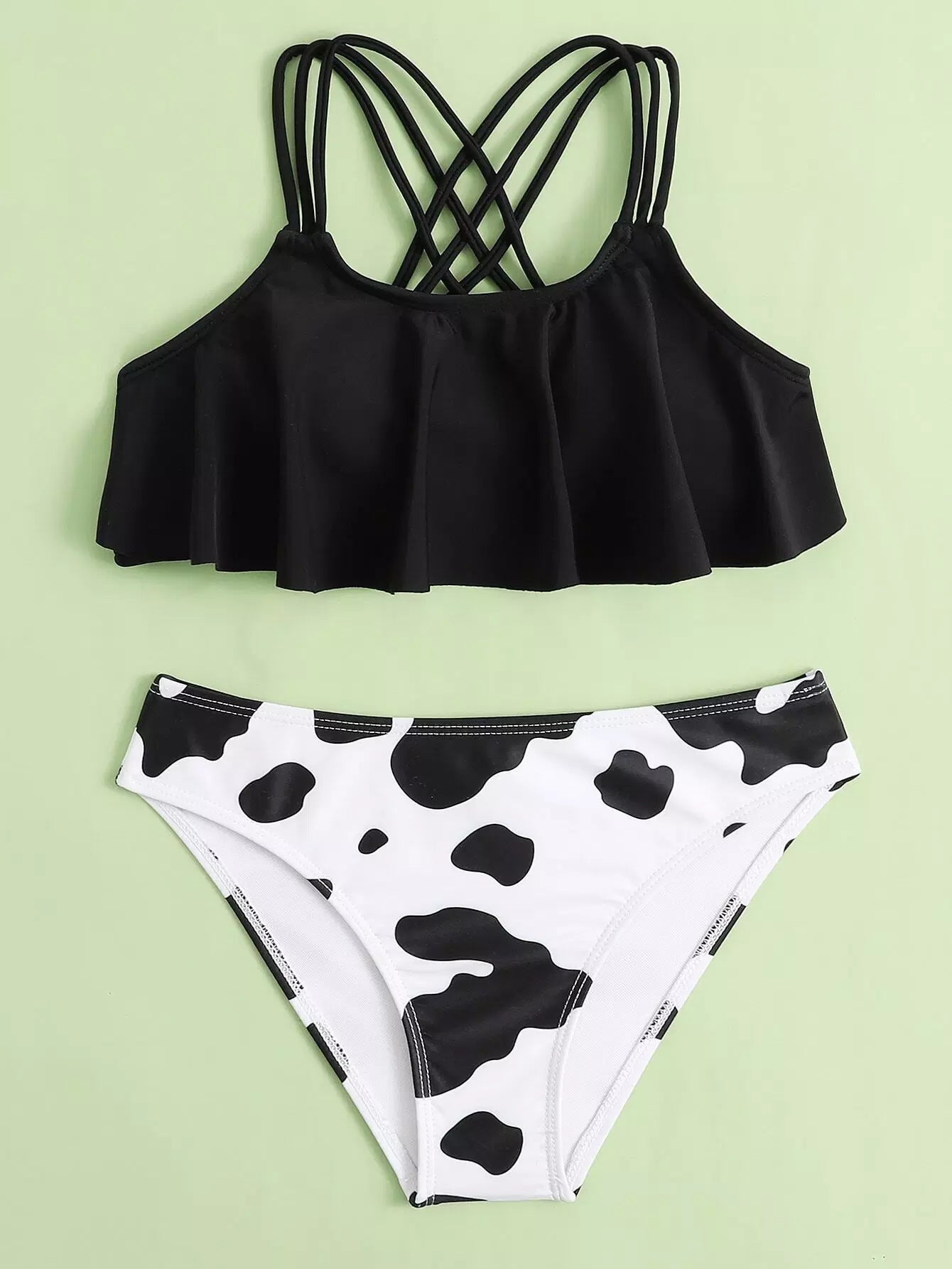 Girls Cow Print Ruffle Hem Bikini Swimsuit