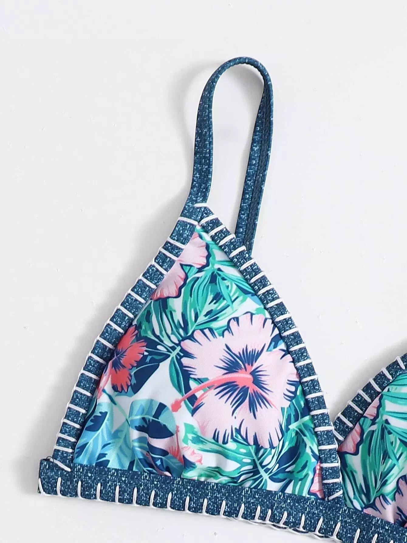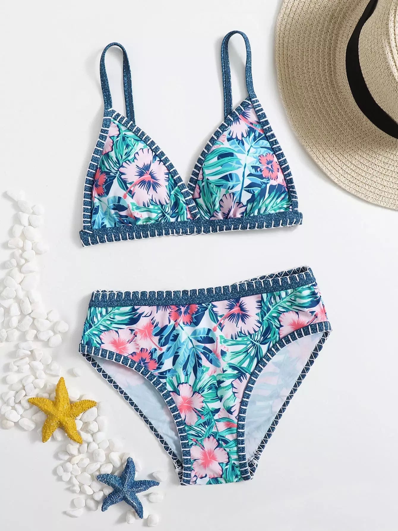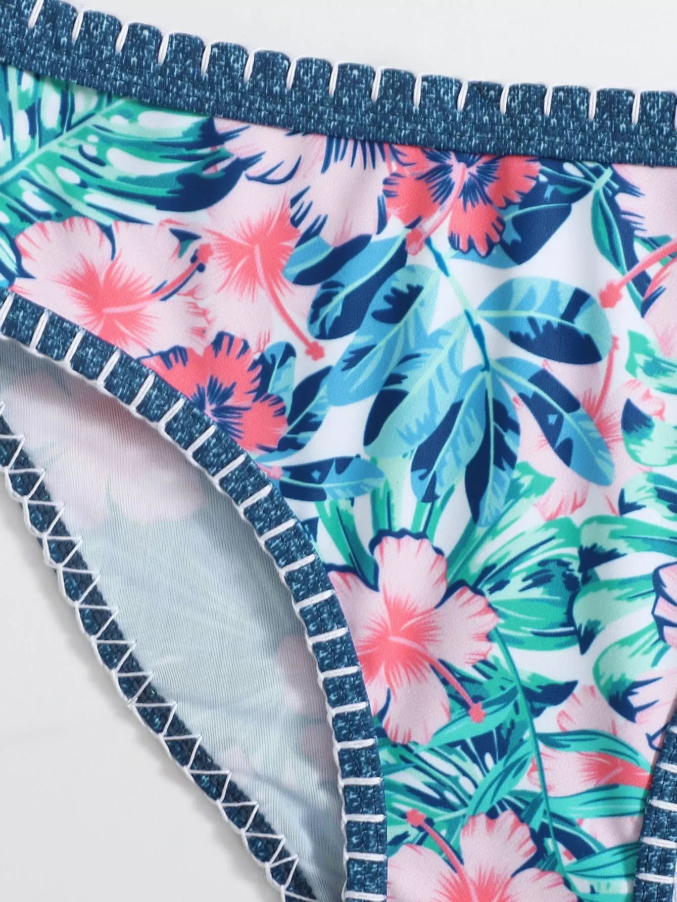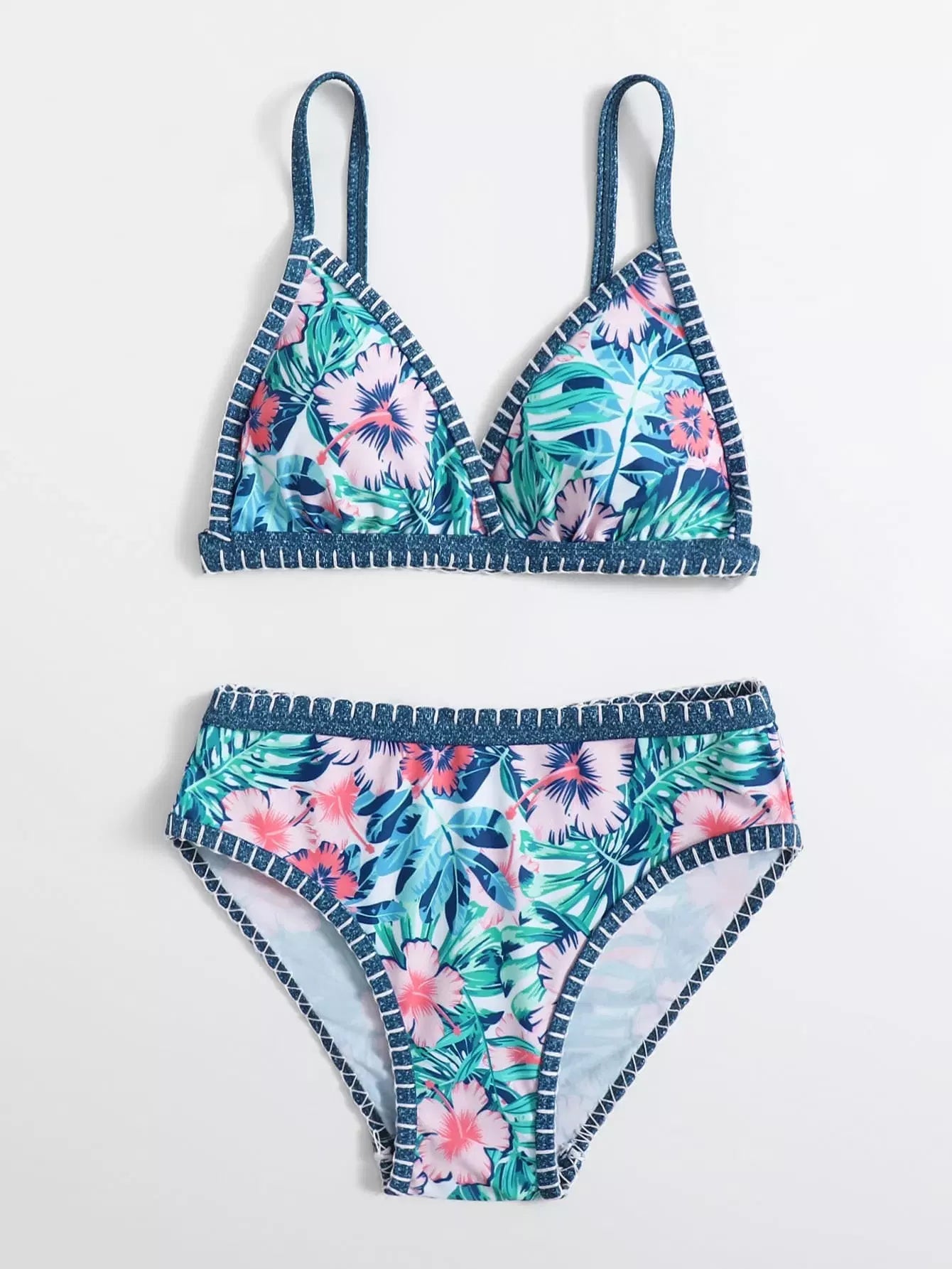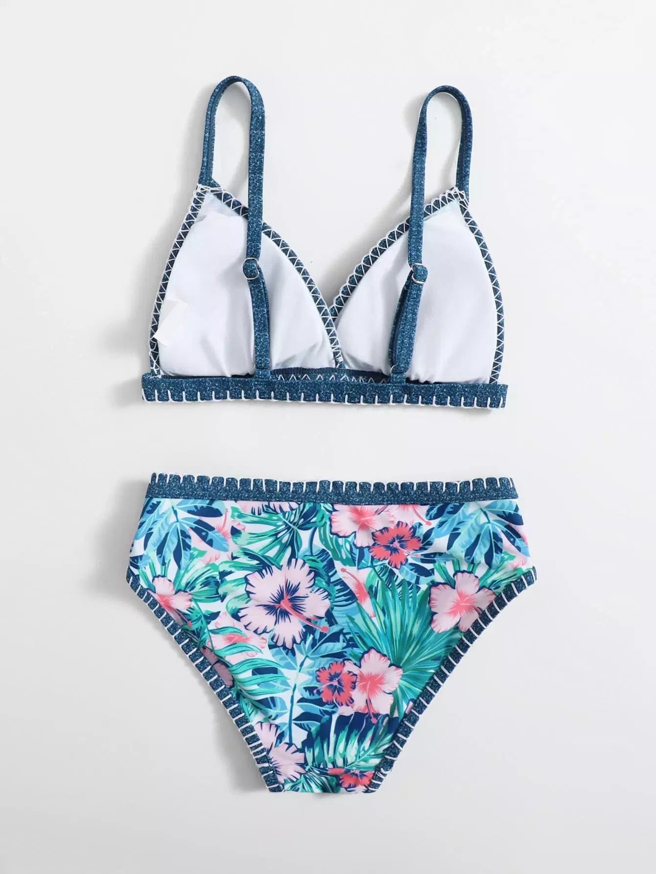 Girls Tropical Random Print Whip Stitch Bikini Swimsuit