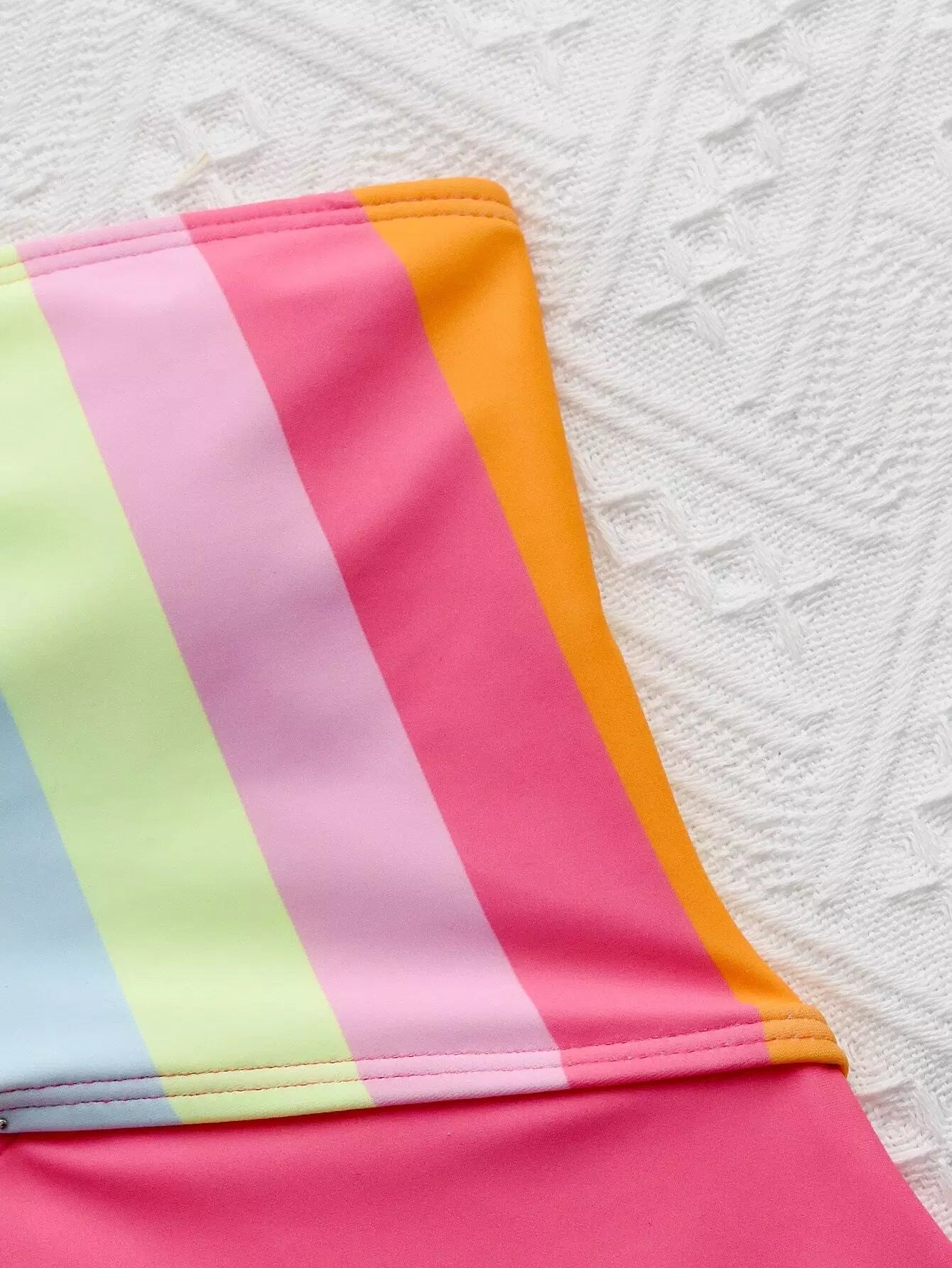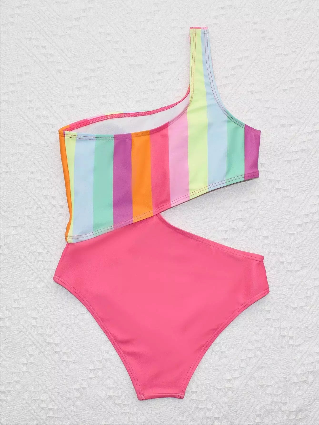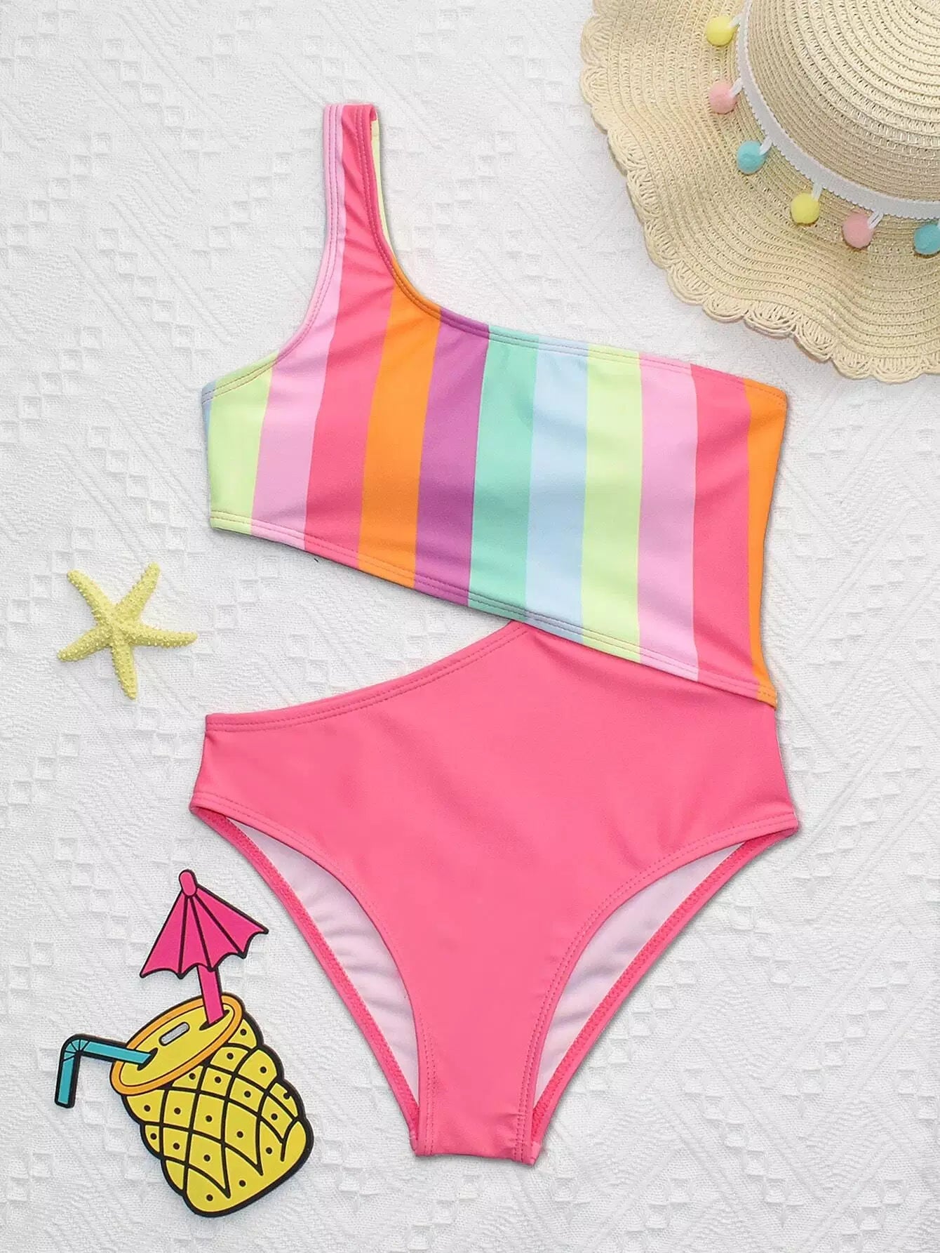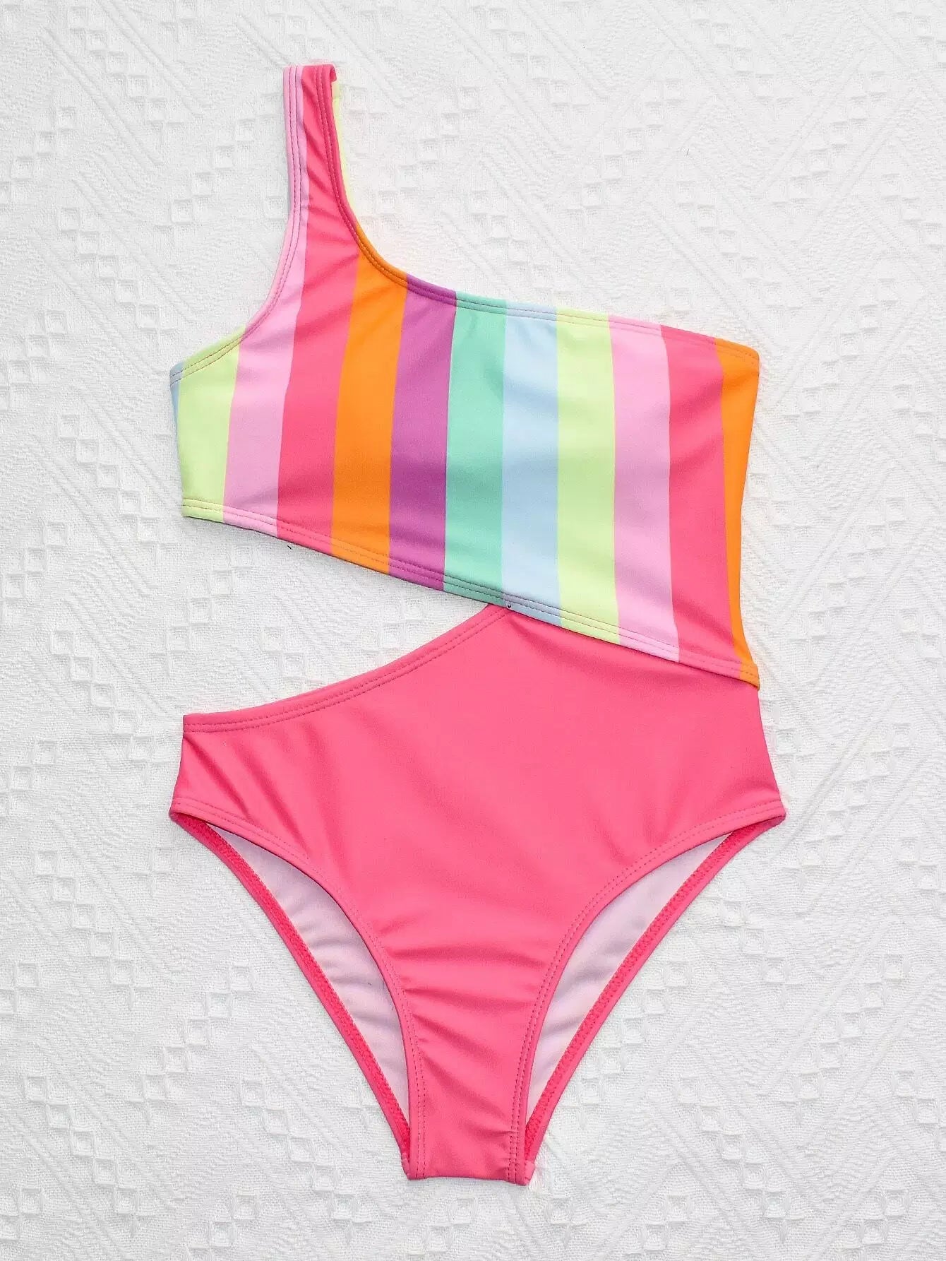 Girls Striped Cut-out One Shoulder One Piece Swimsuit