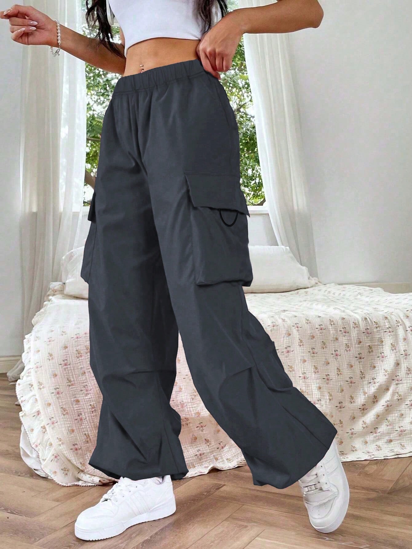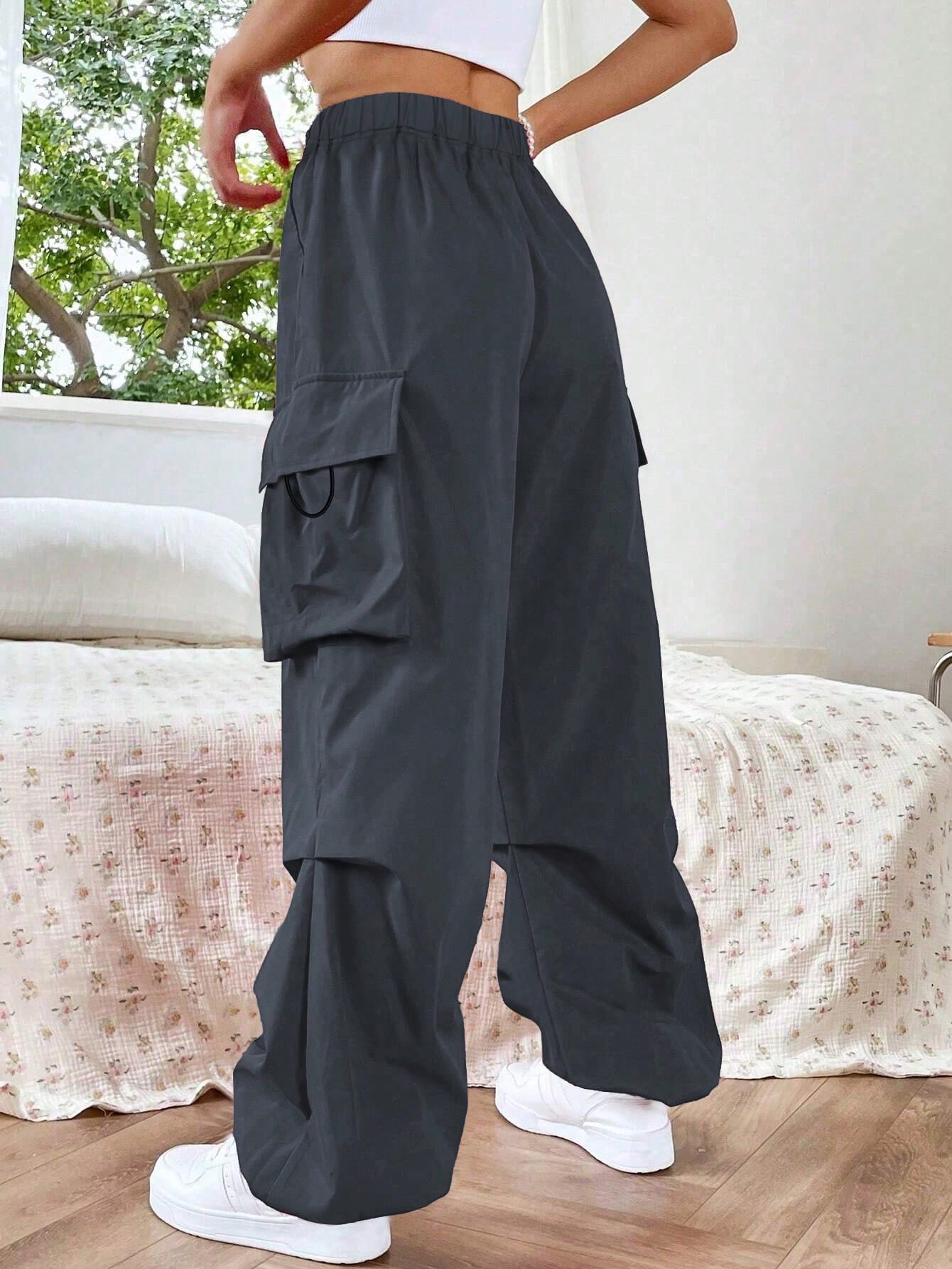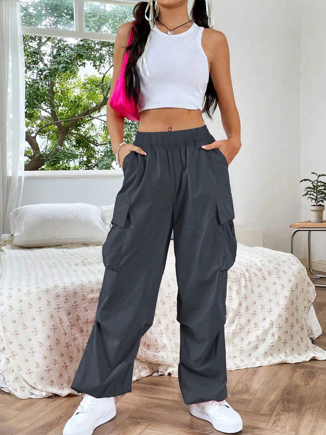 1pc Teen Girl Loose Versatile Fold-Over Pocket Drawstring Side Cargo Style Dress Pants, Outdoor Jumpsuit,