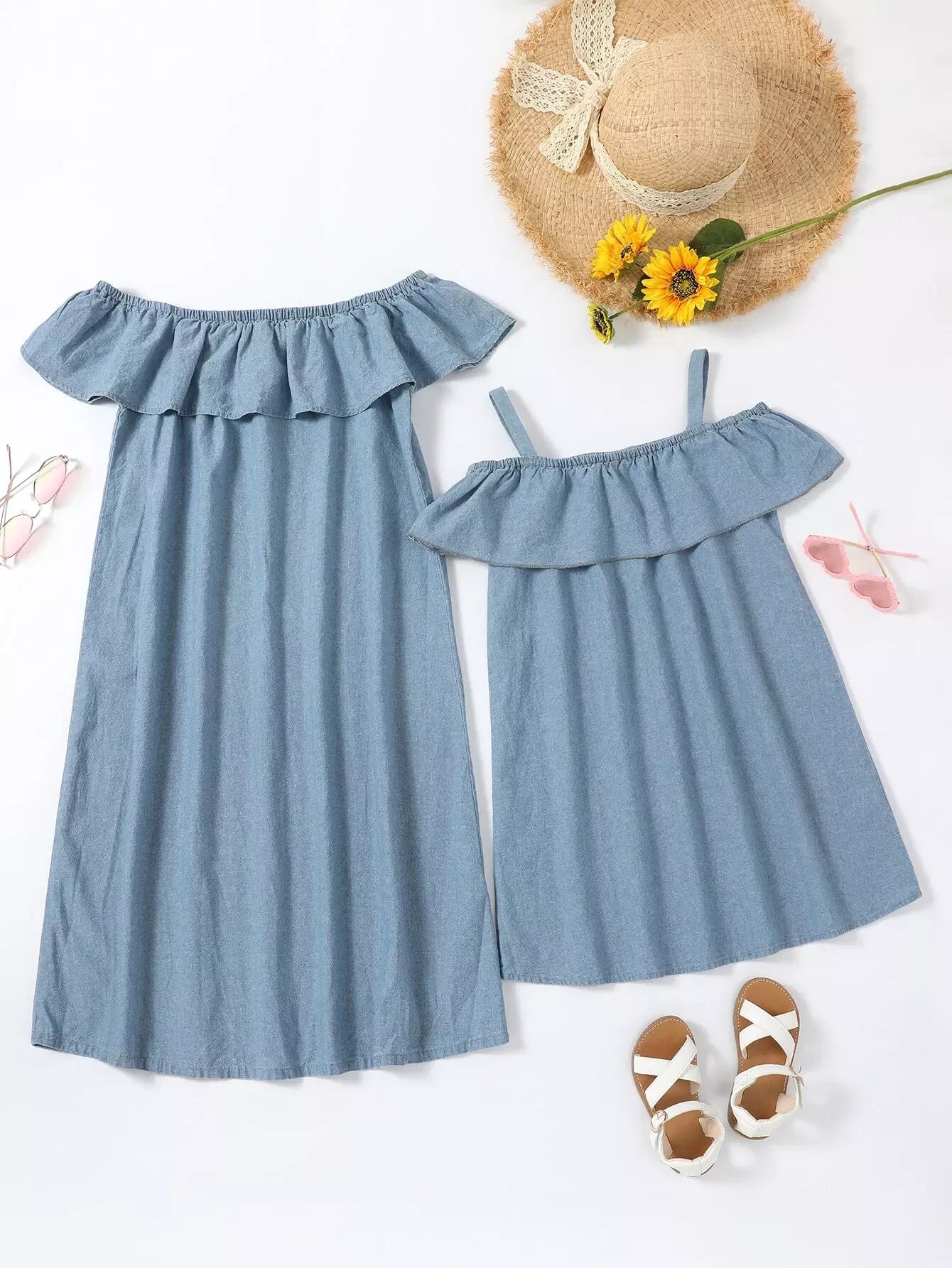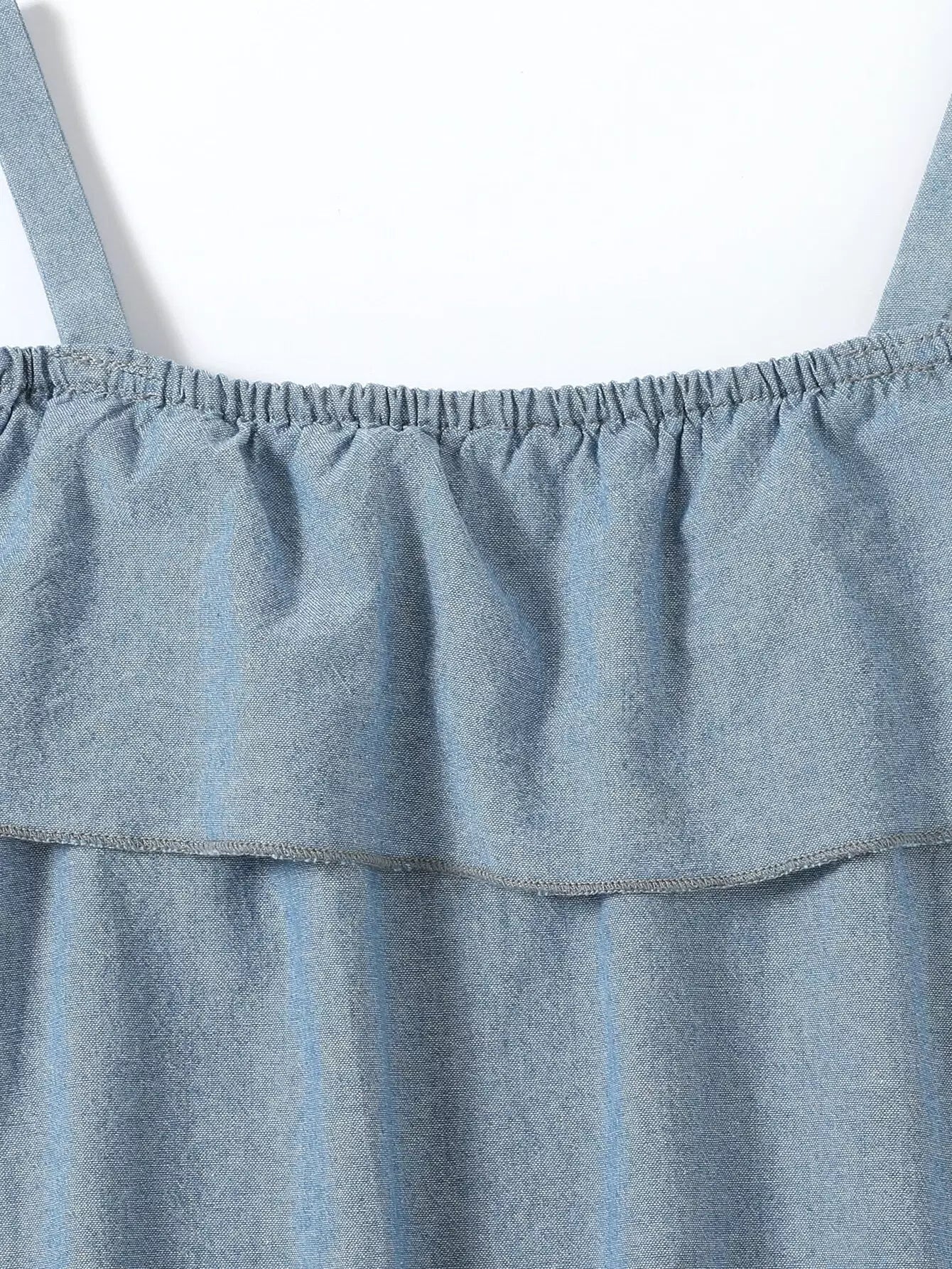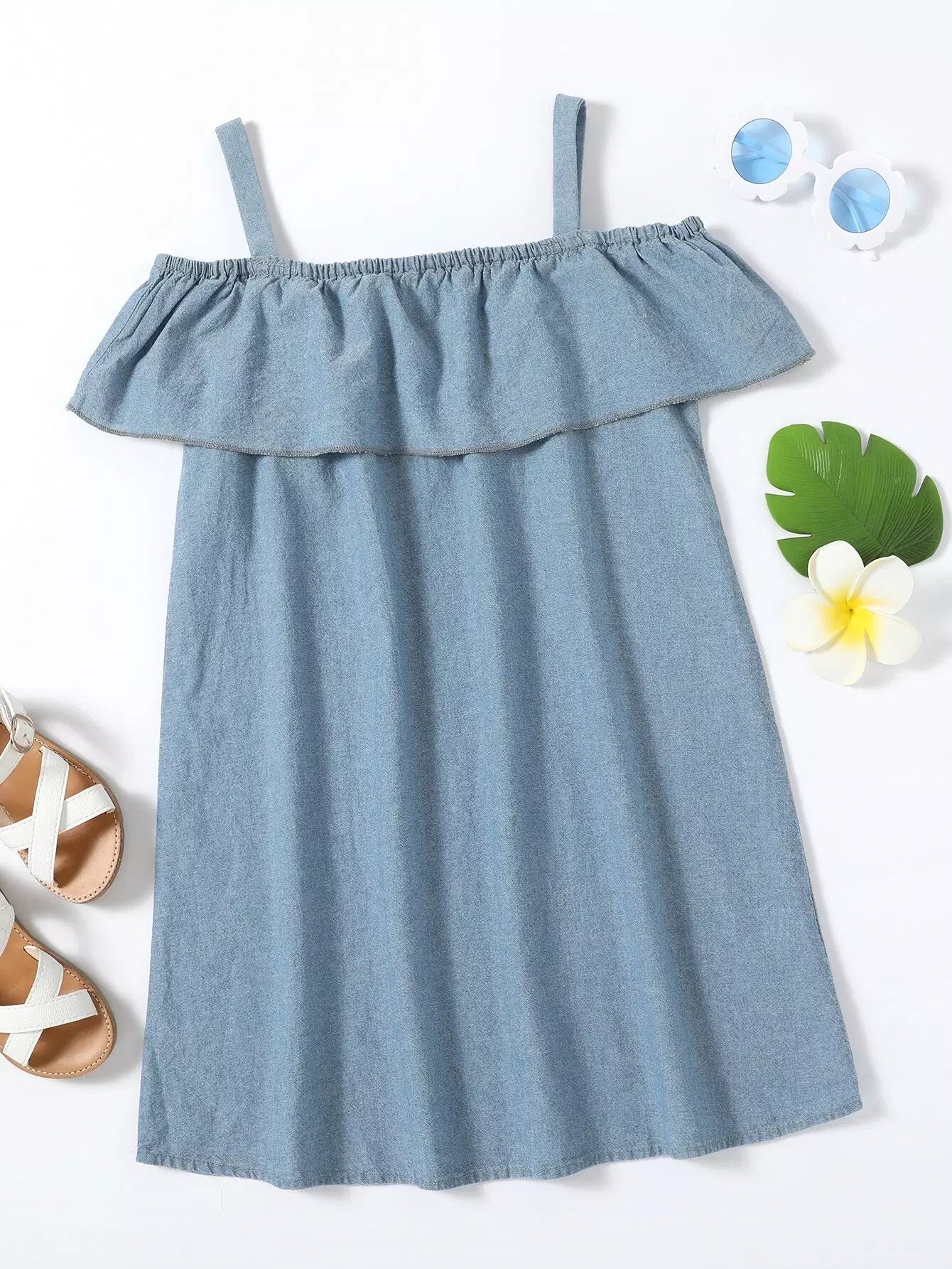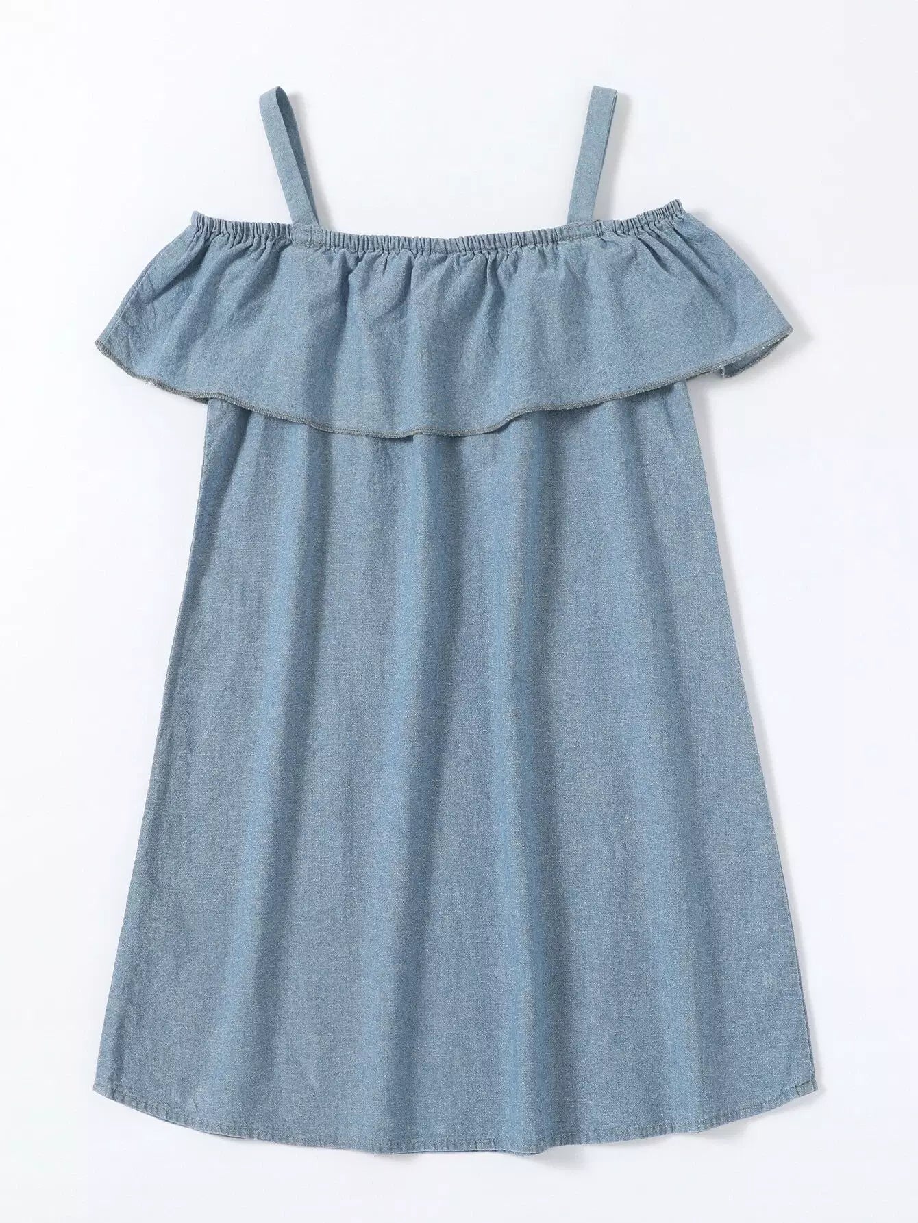 Girls 1pc Cold Shoulder Ruffle Denim Dress
