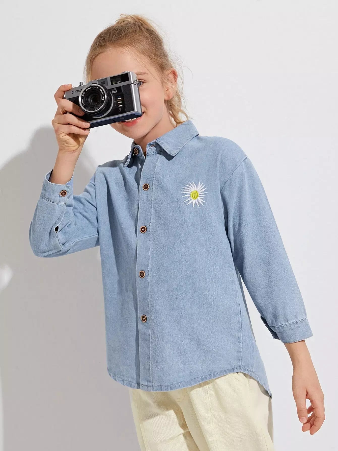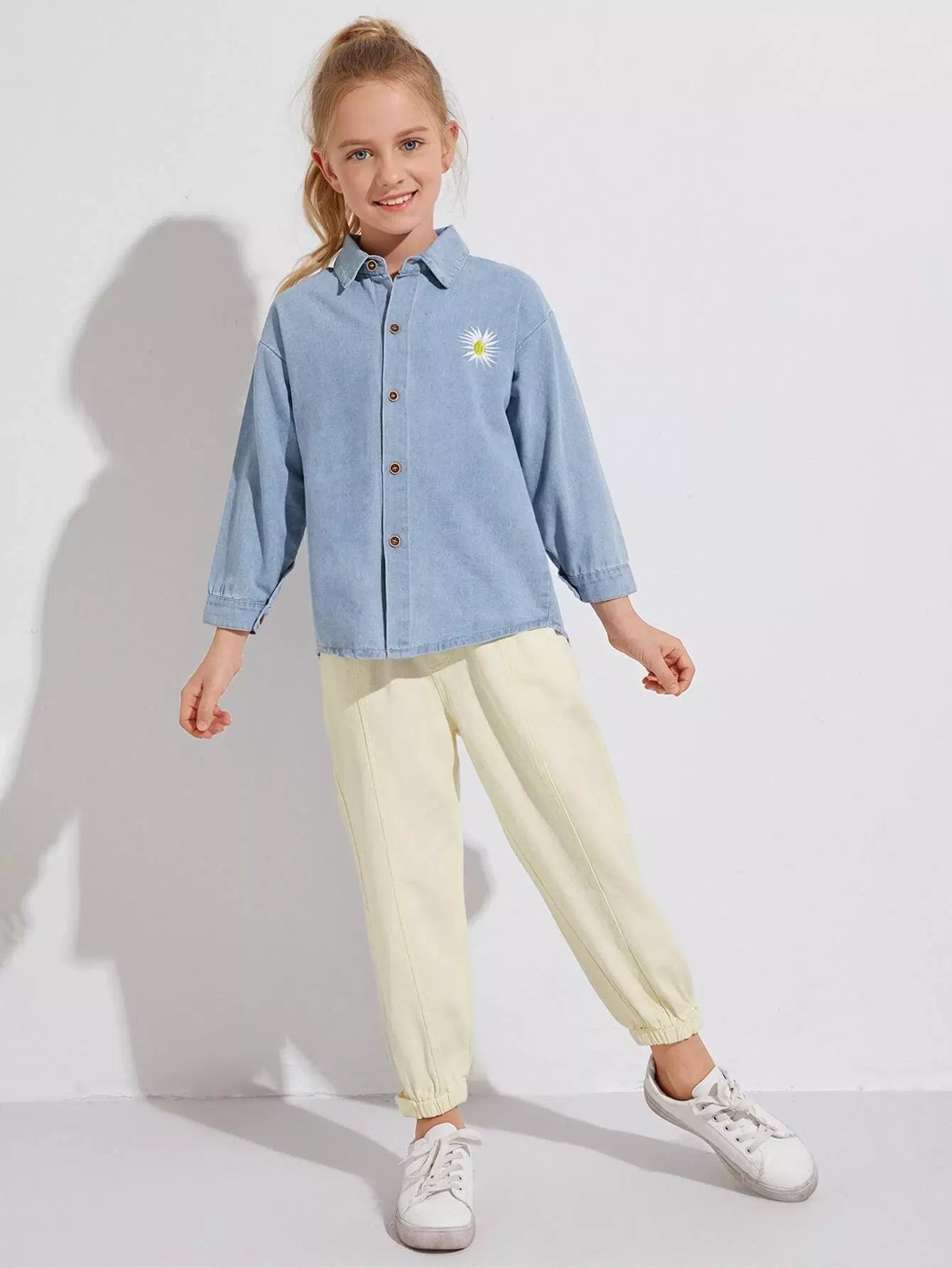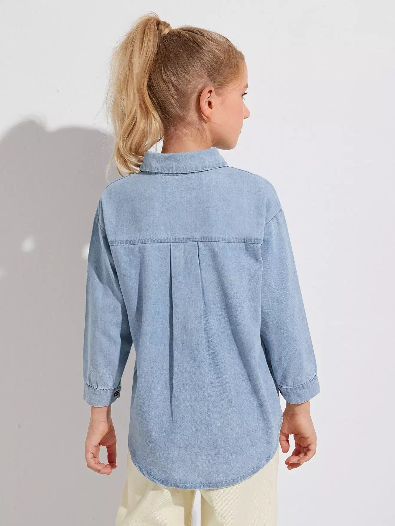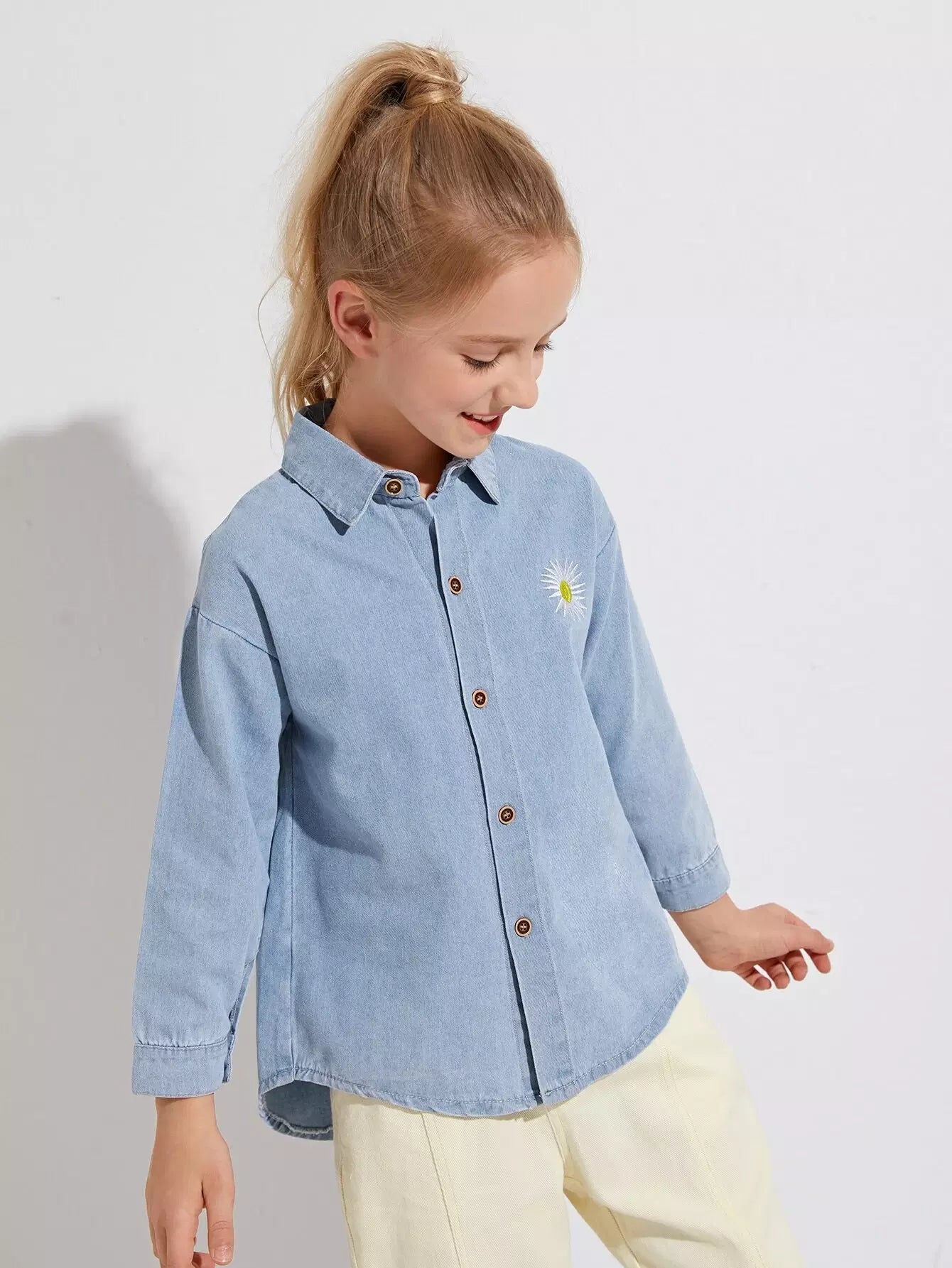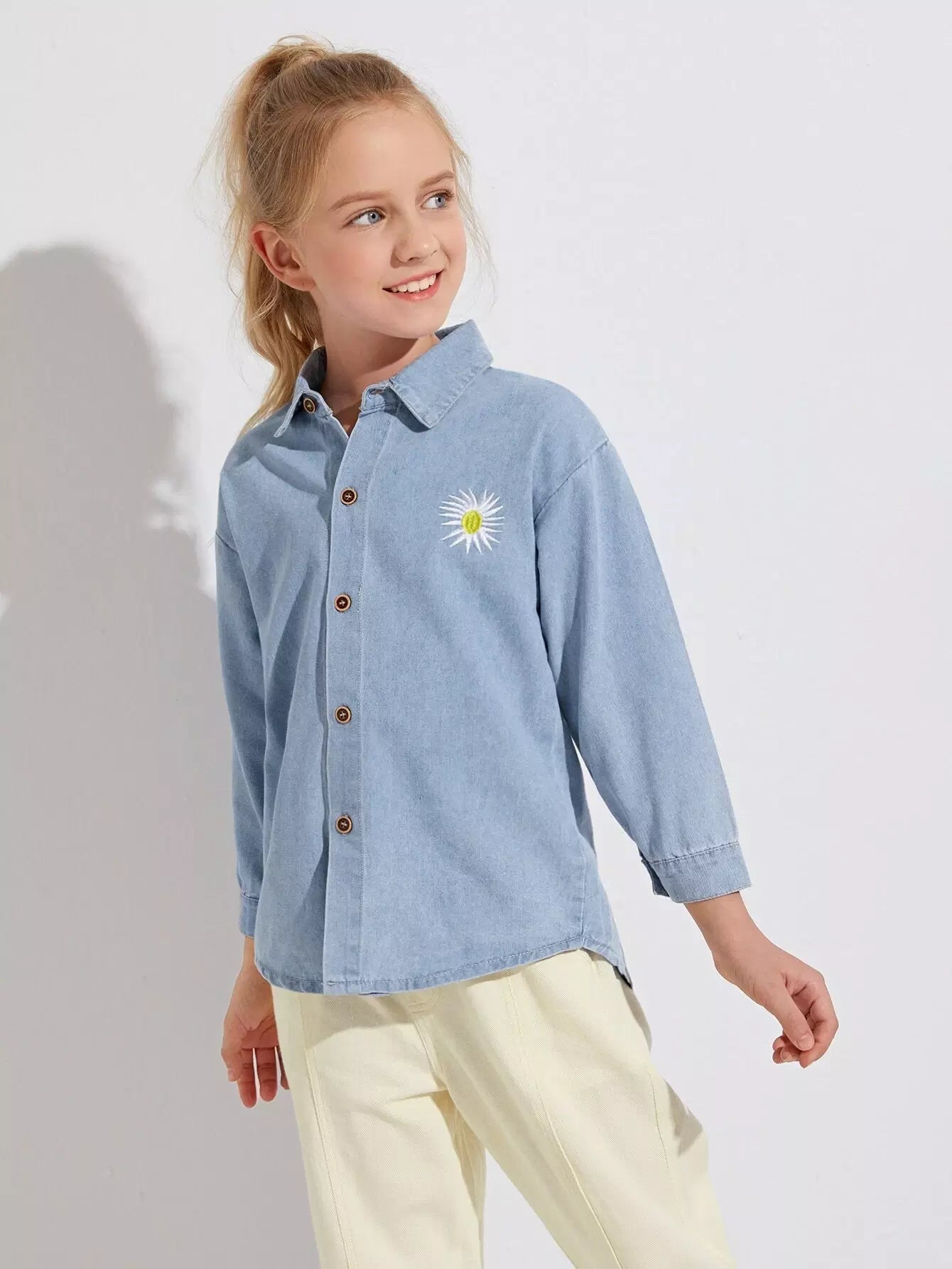 Girls Embroidered Drop Shoulder Denim Shirt