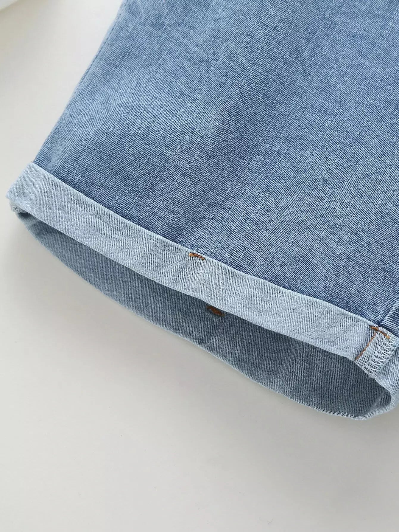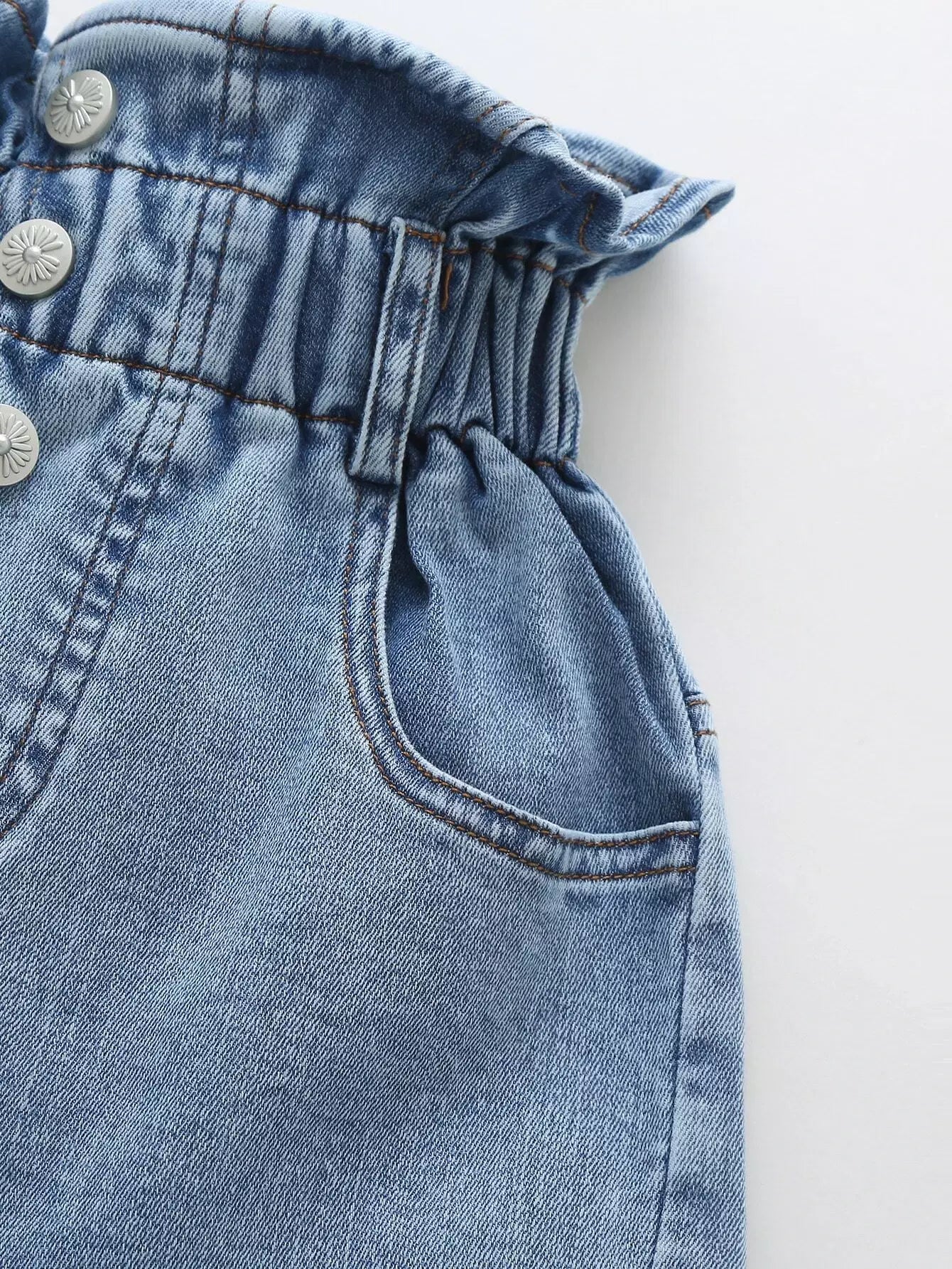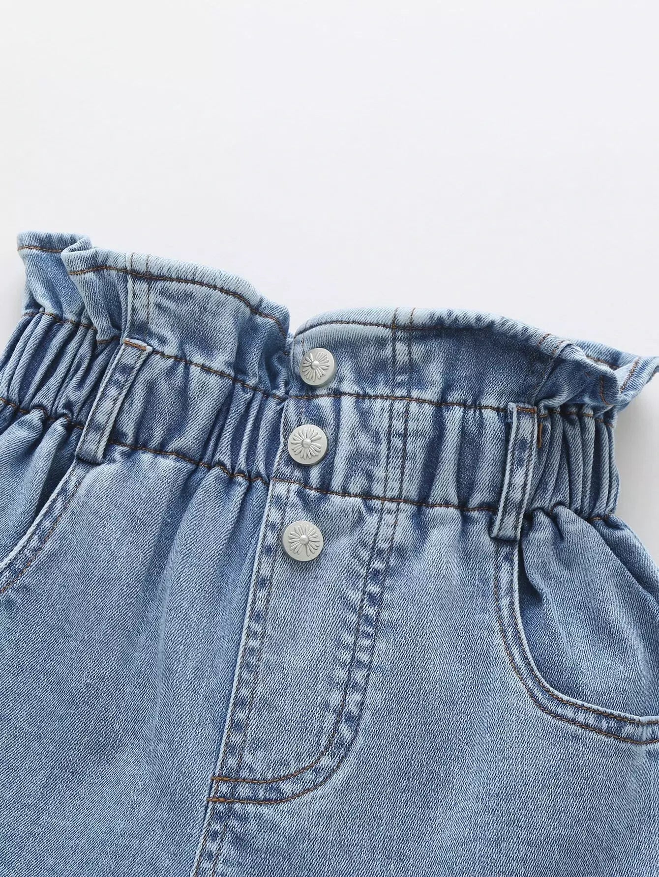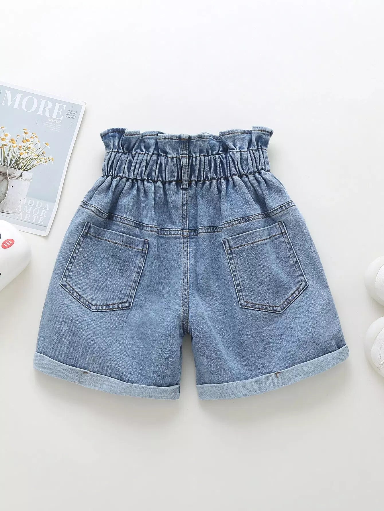 Kids - Girls Solid Paper Bag Waist Denim Shorts