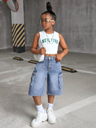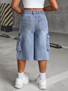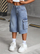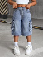 SLAYR KIDS Tween Girls Y2K Fashion Retro Stonewashed Flap Pocket Baggy Denim Cargo Jeans Long Shorts,
