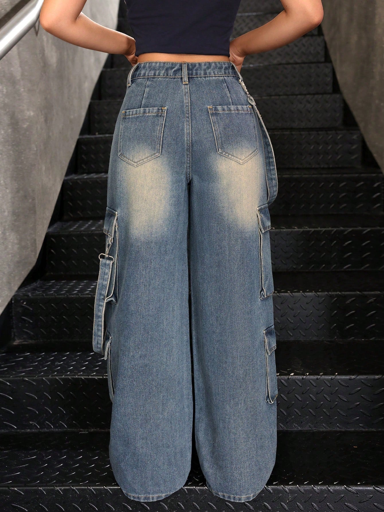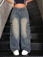 Retro Blue Denim Wide Leg Cargo Pants For Teenage Girls