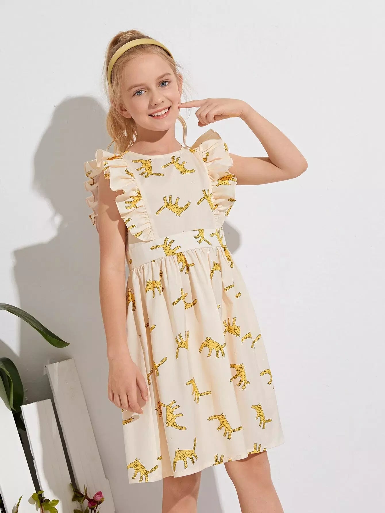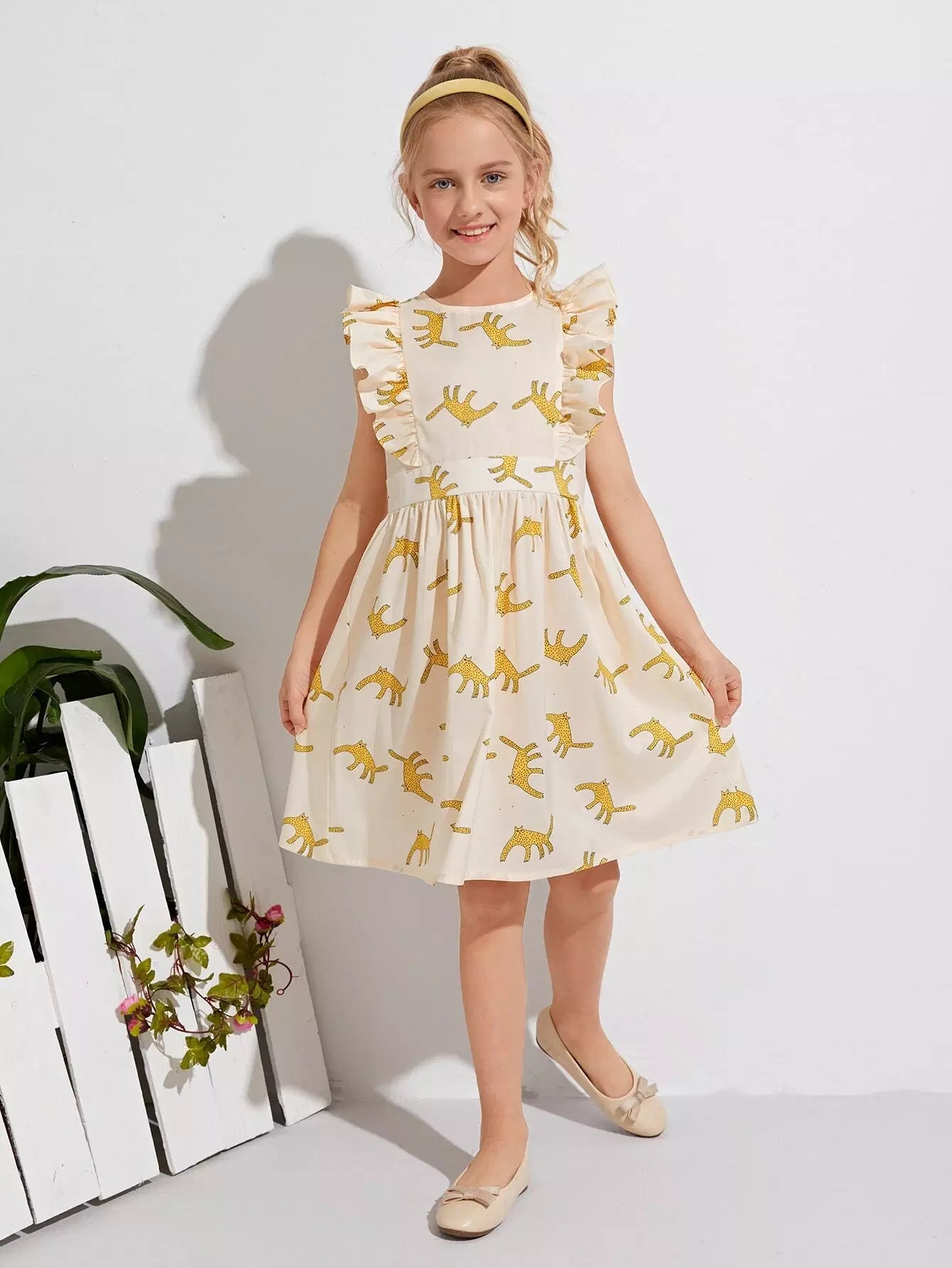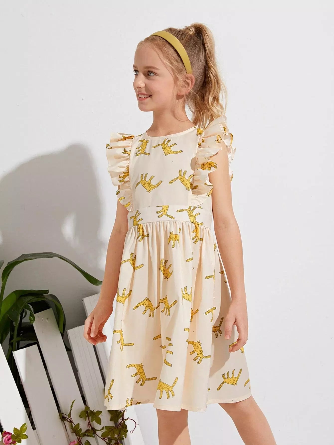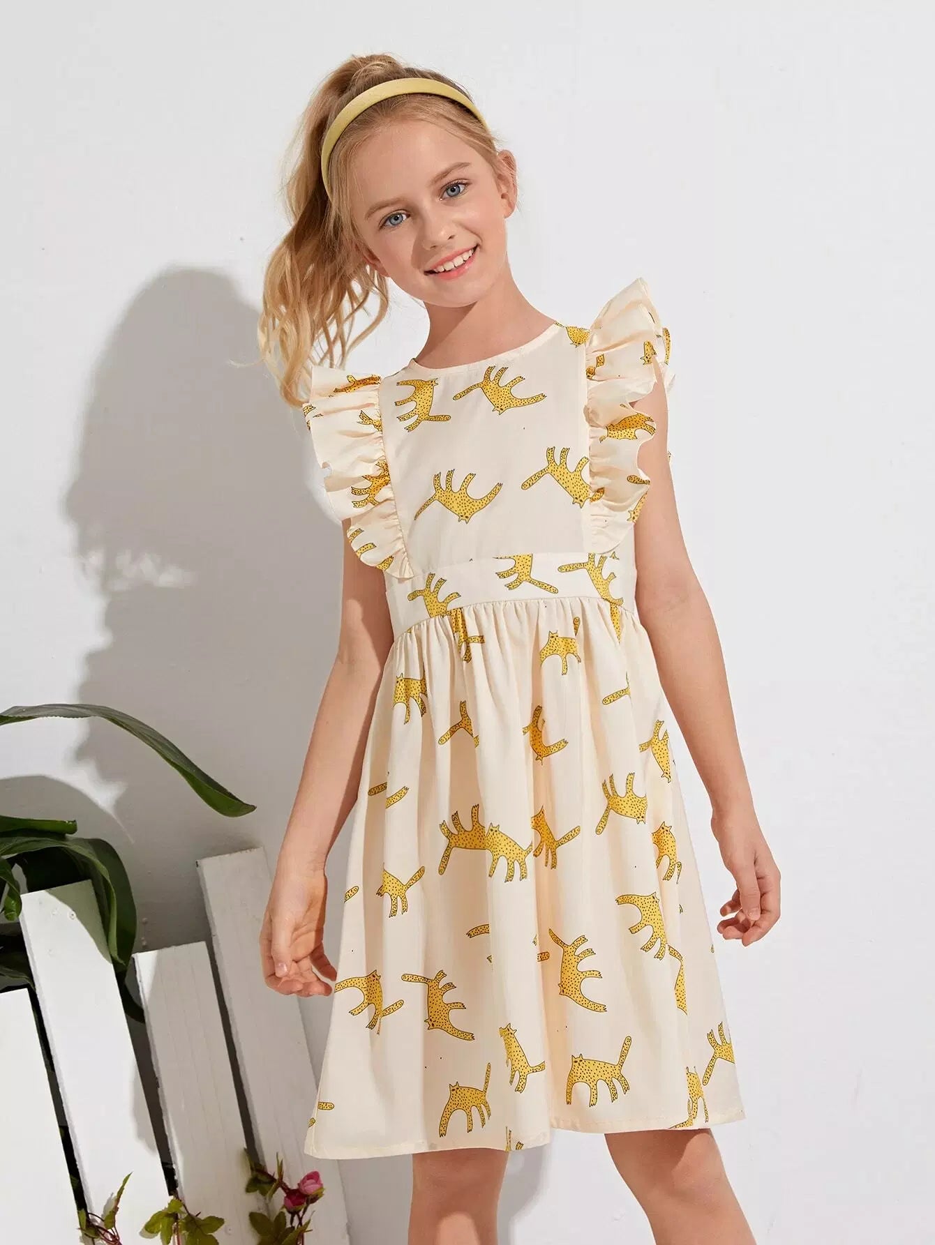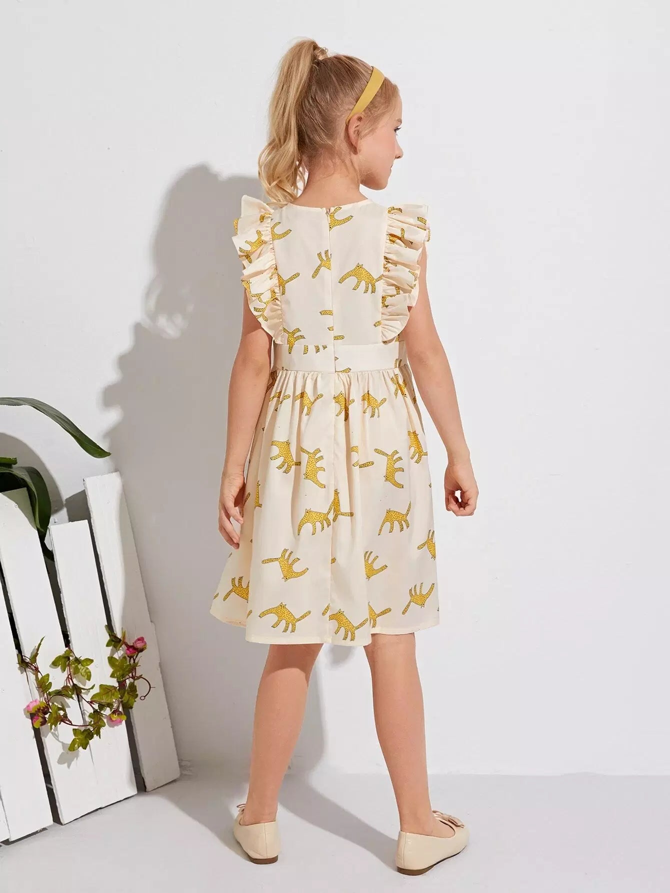 Girls Allover Cartoon Graphic Ruffle Trim Dress