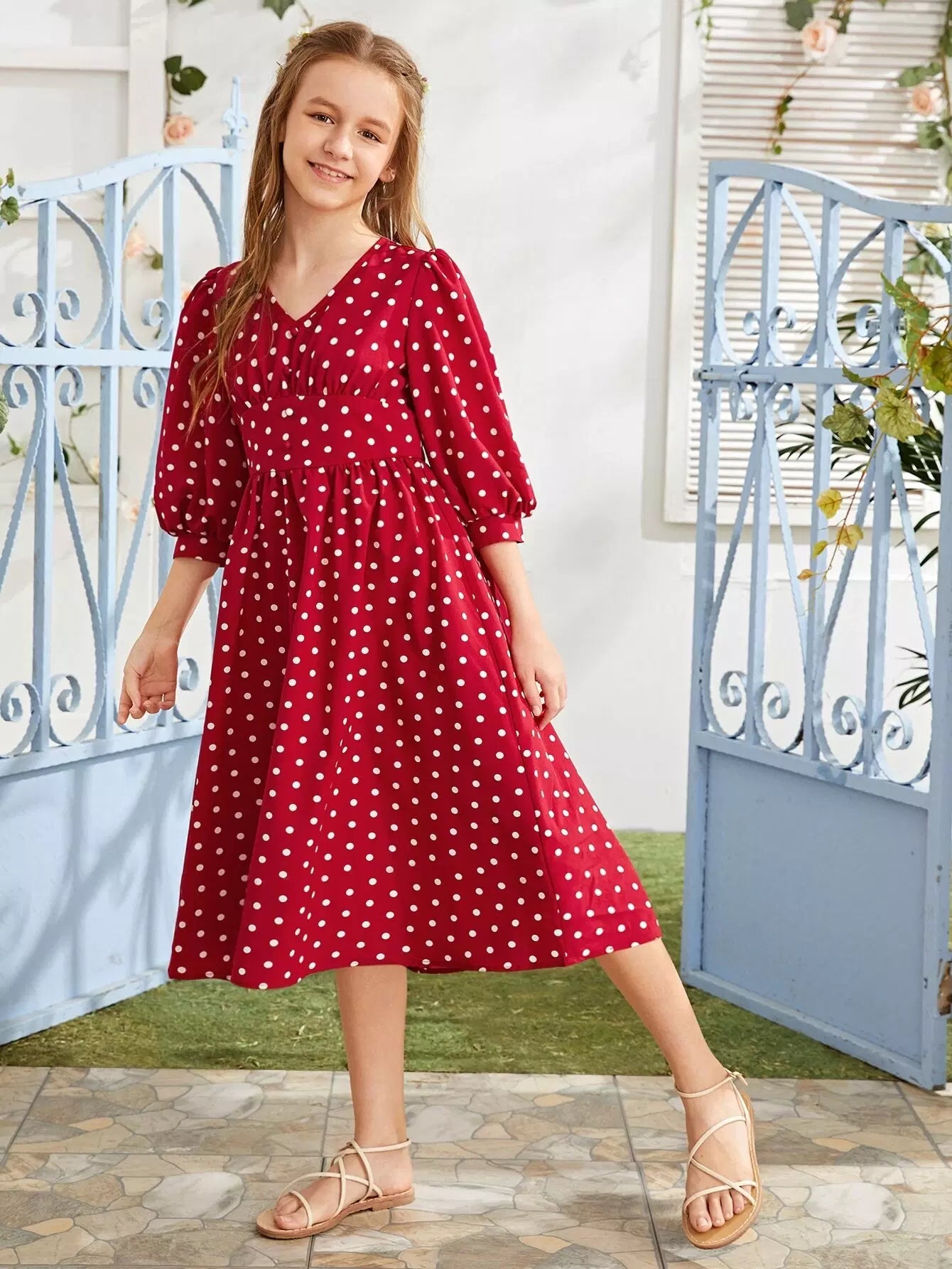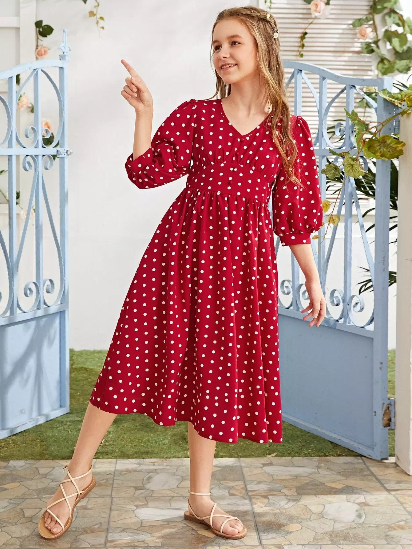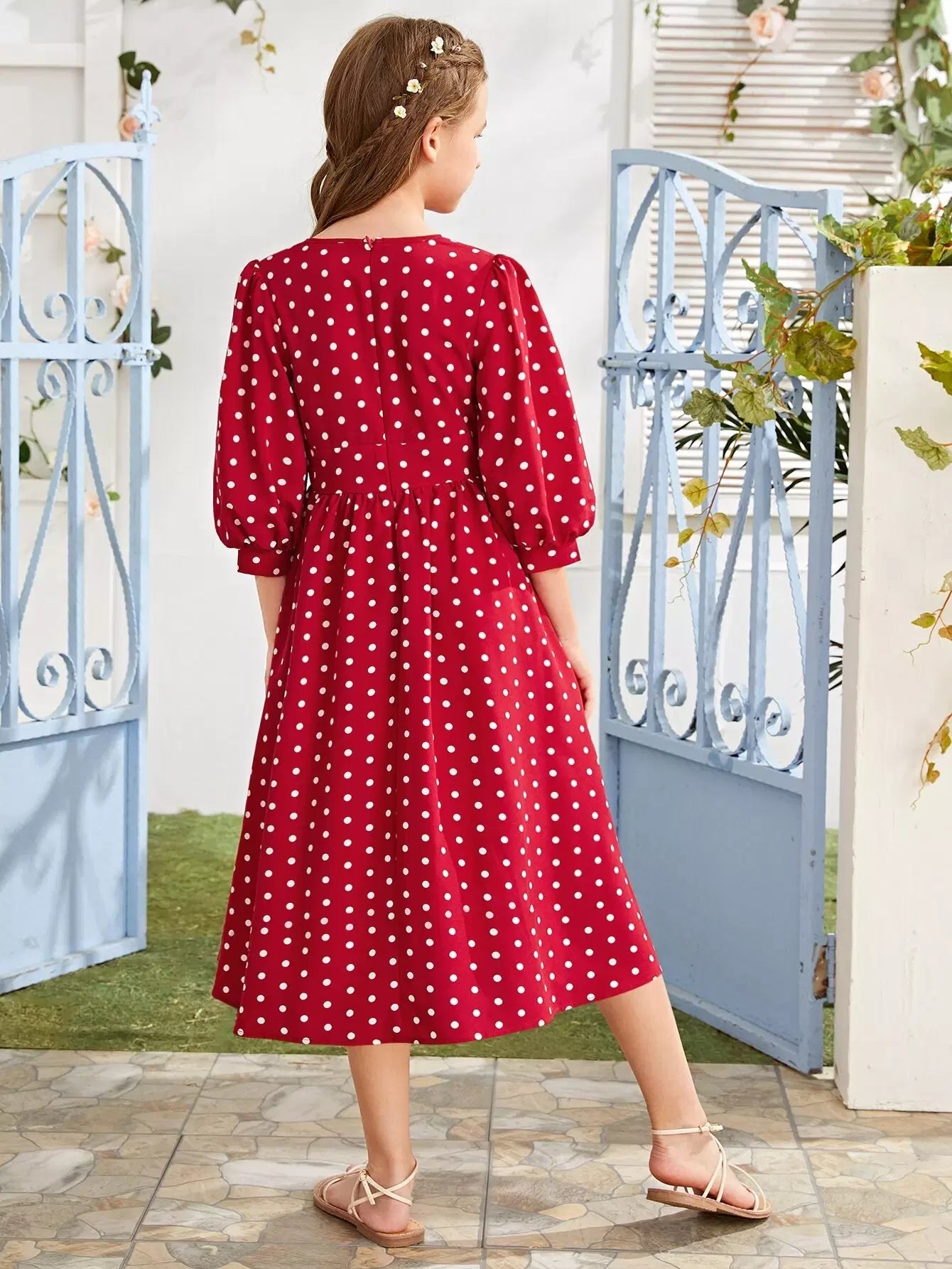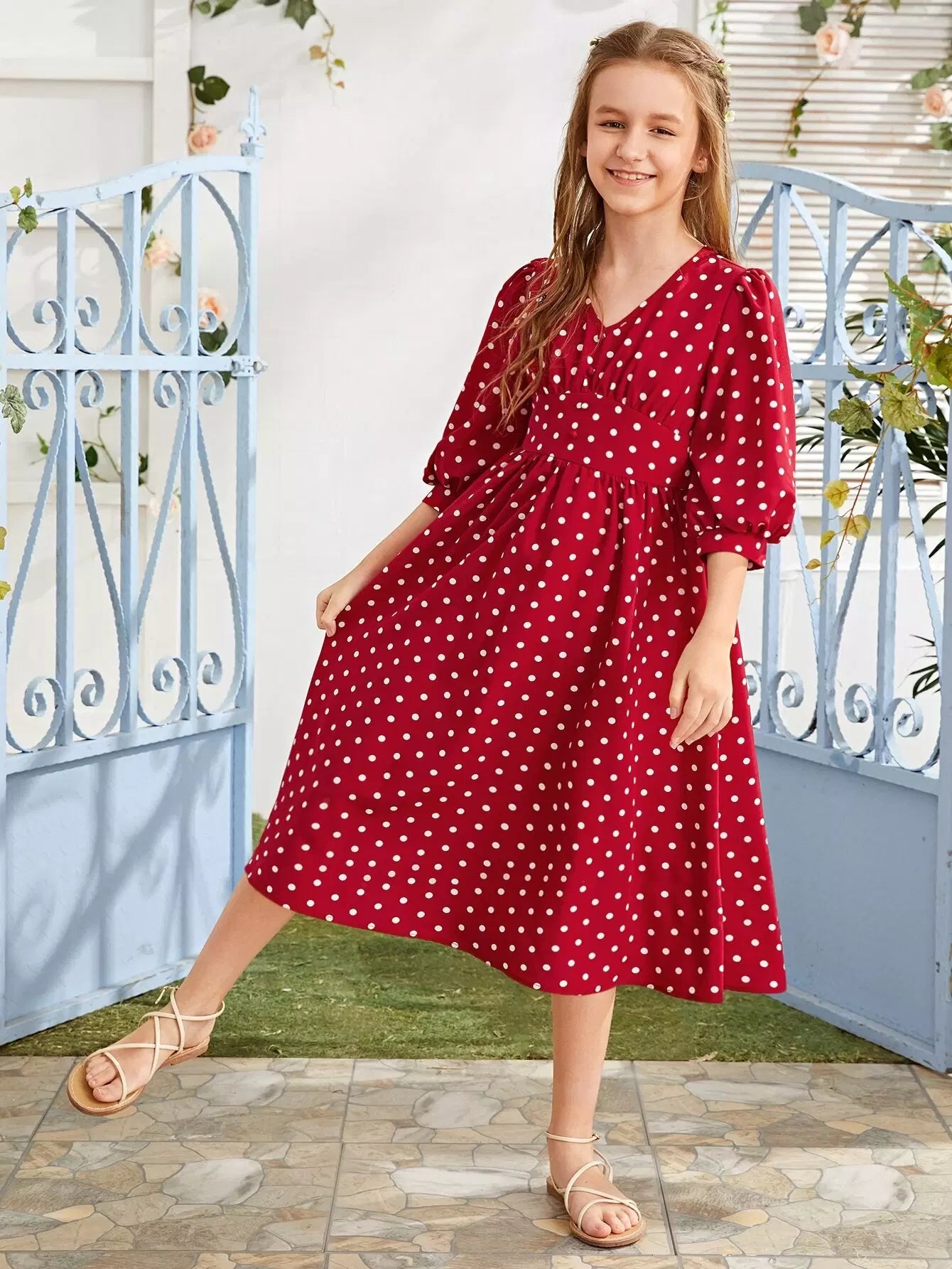 Girls Bishop Sleeve Wide Waistband Polka Dot Dress