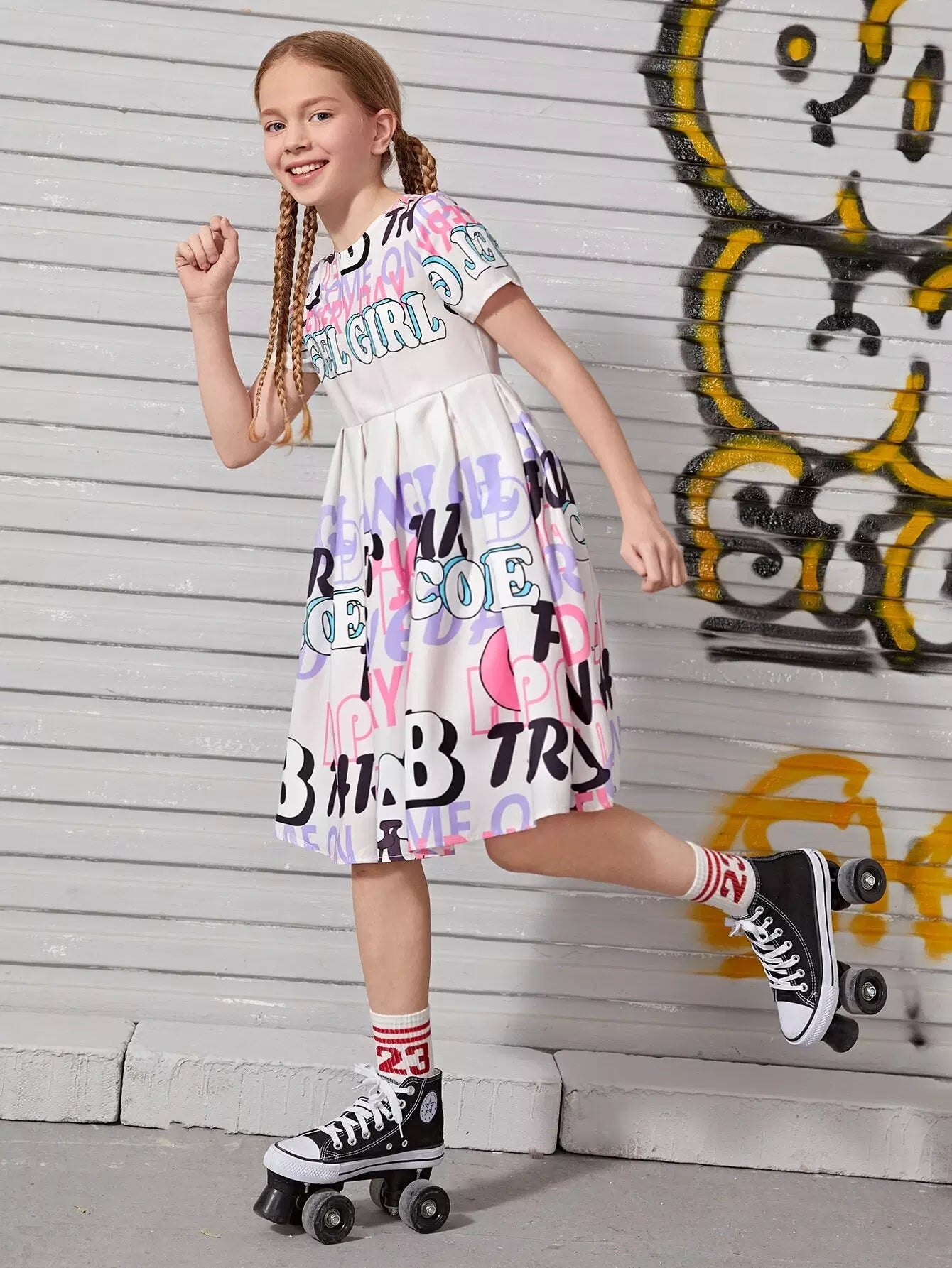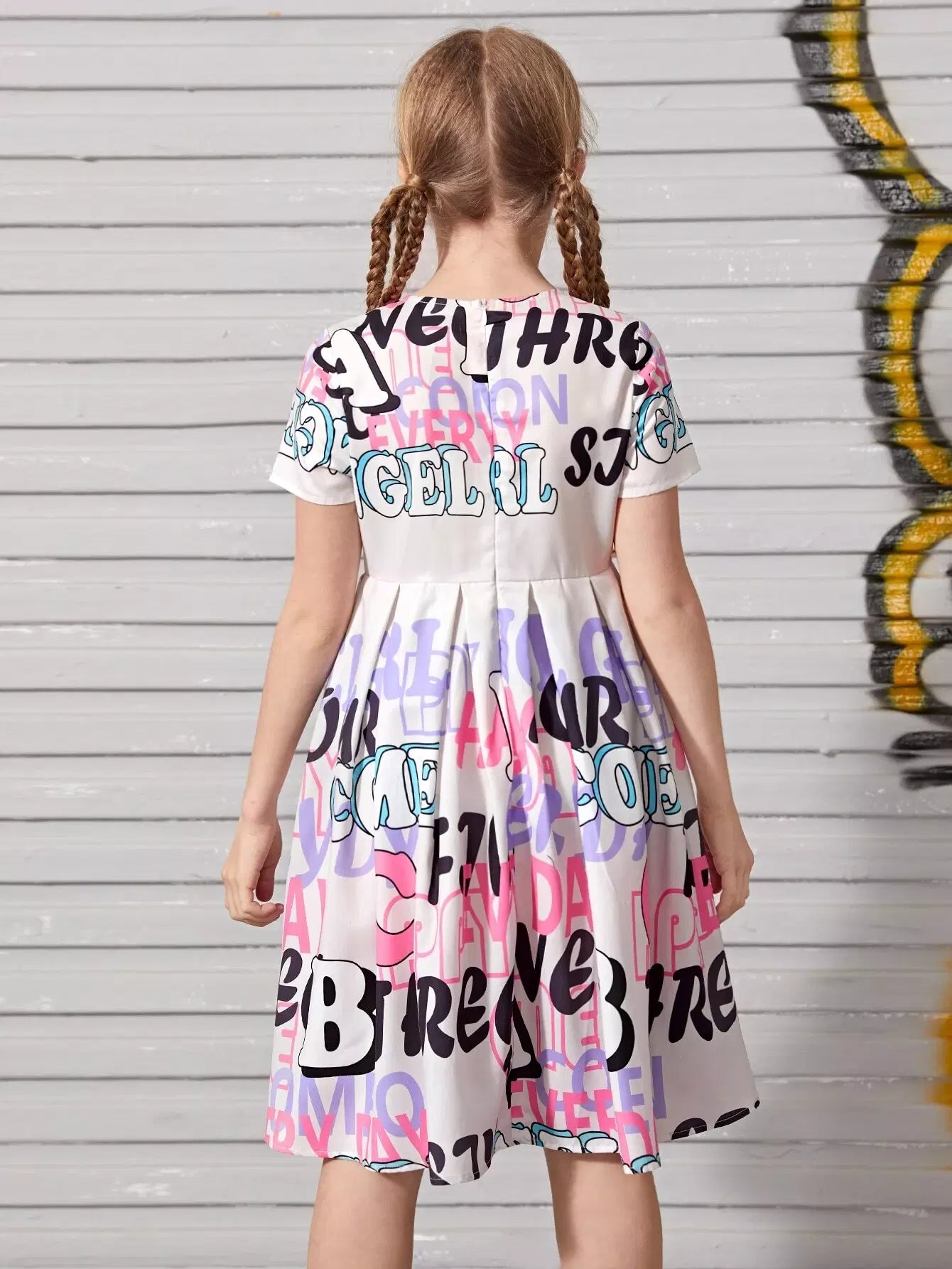 Girls Boxy Pleated Letter Graphic Dress