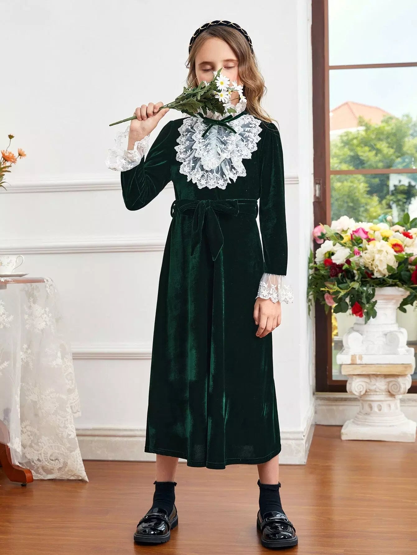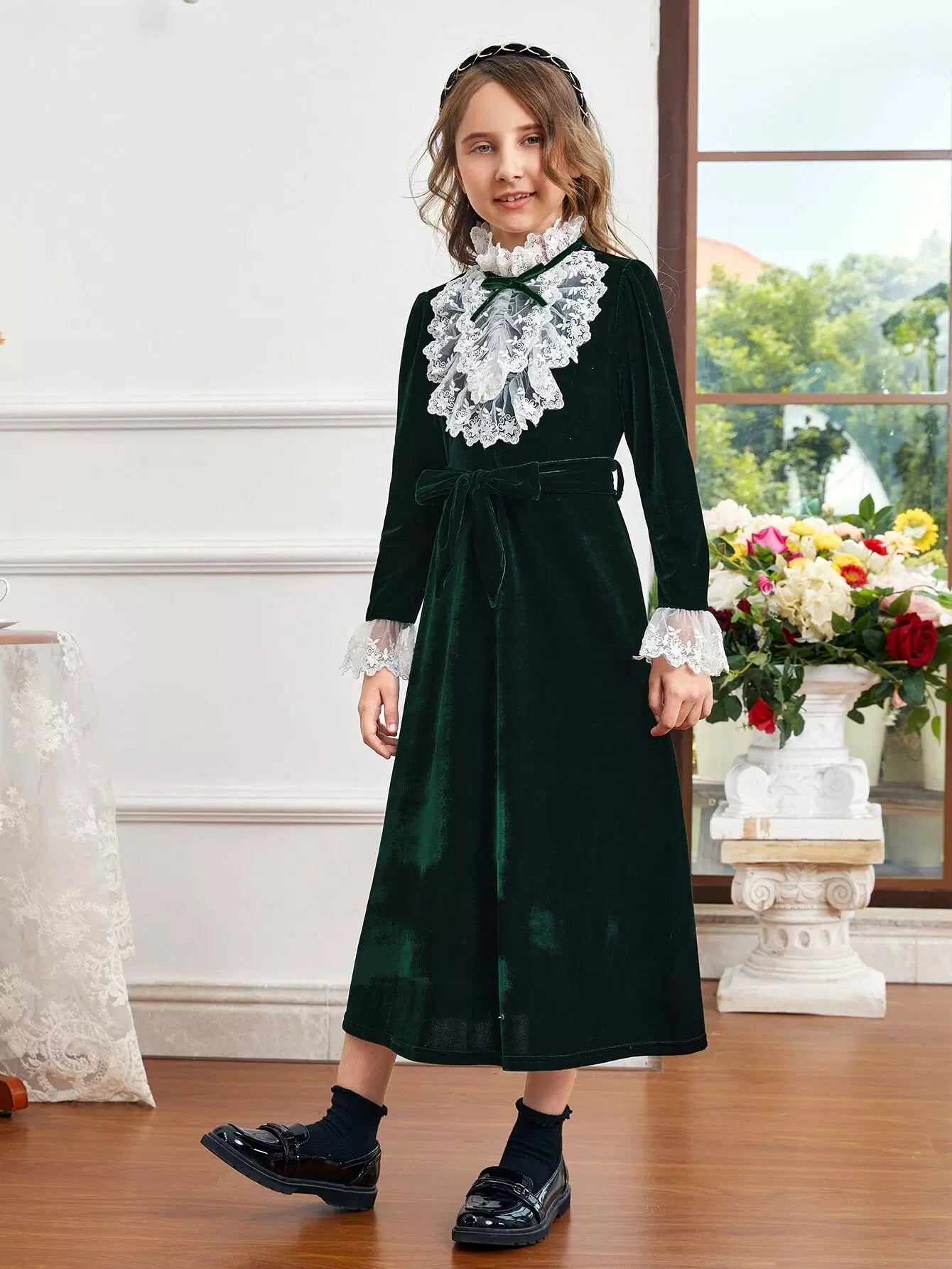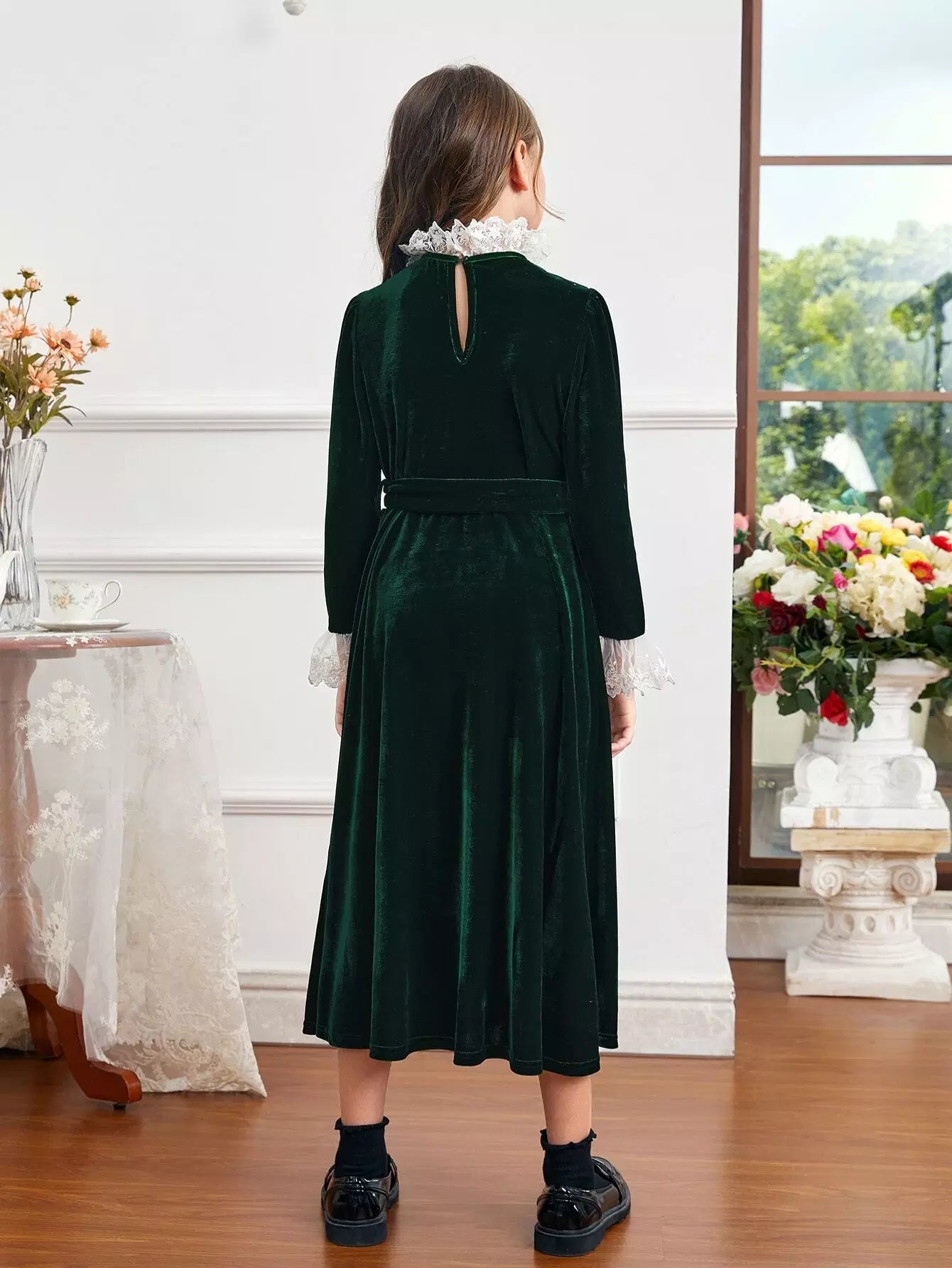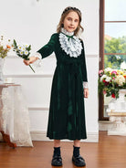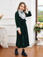 Girls Contrast Lace Ruffle Trim Flounce Sleeve Velvet Dress Without Belt