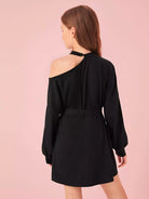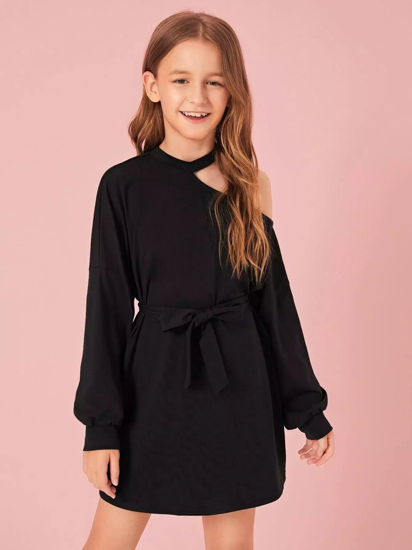 Girls Cutout Shoulder Lantern Sleeve Self Dress Without Belt