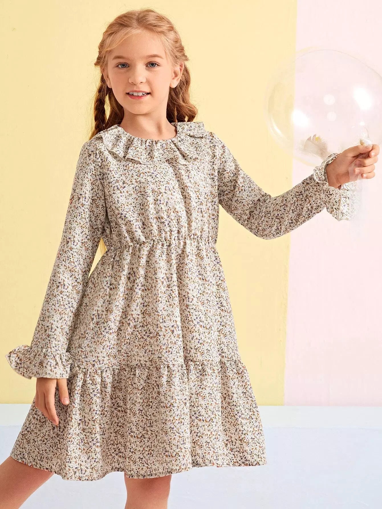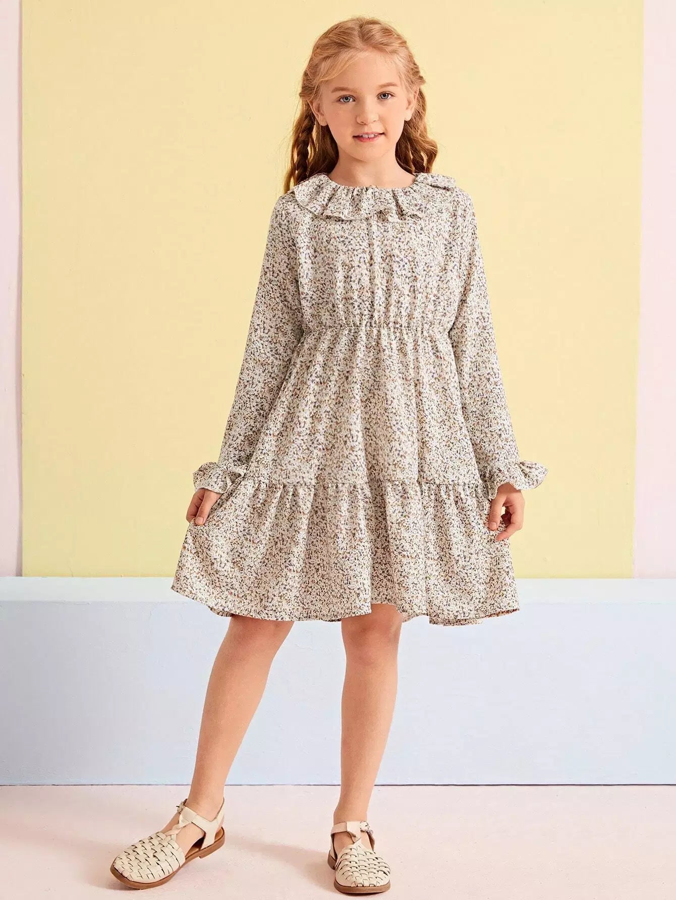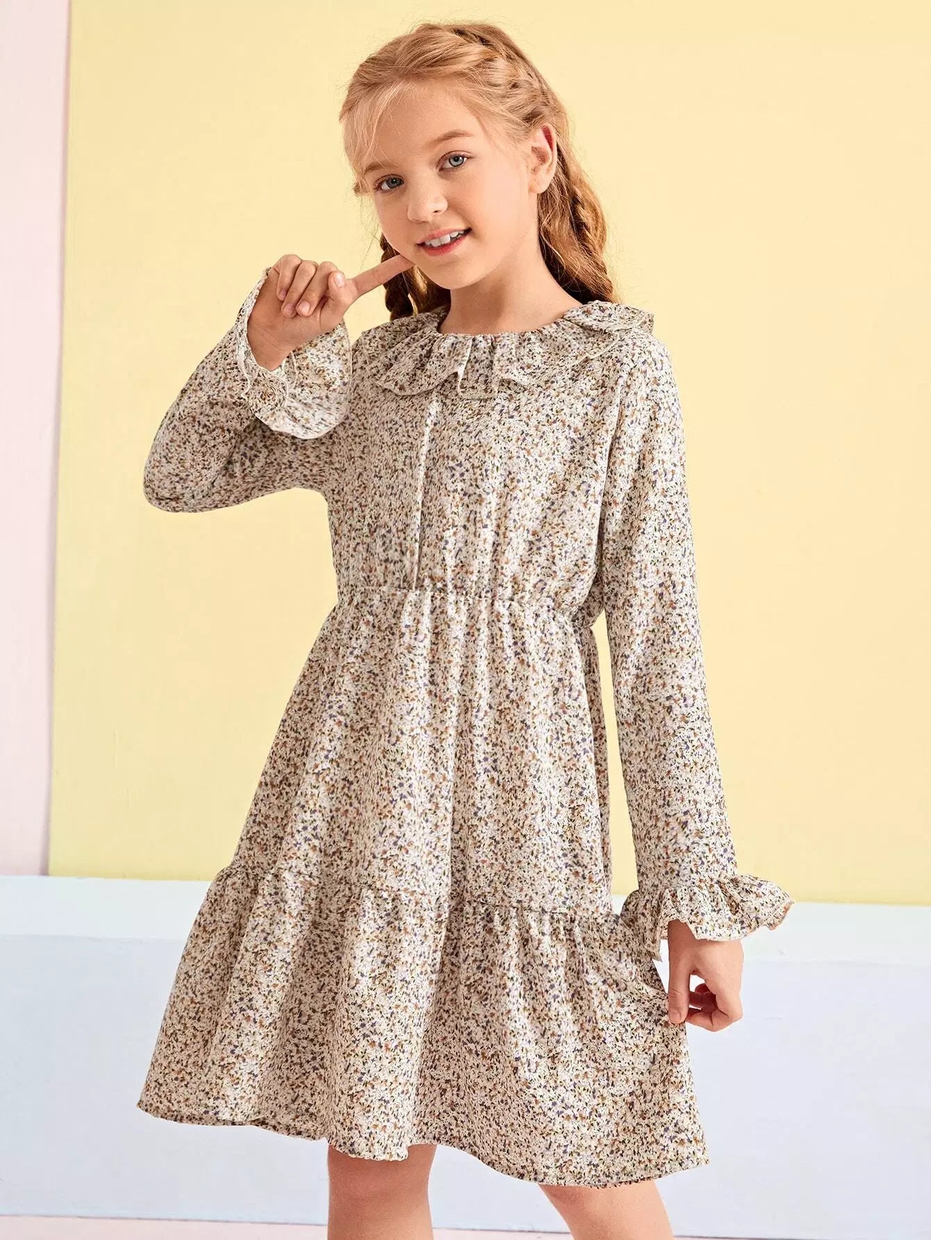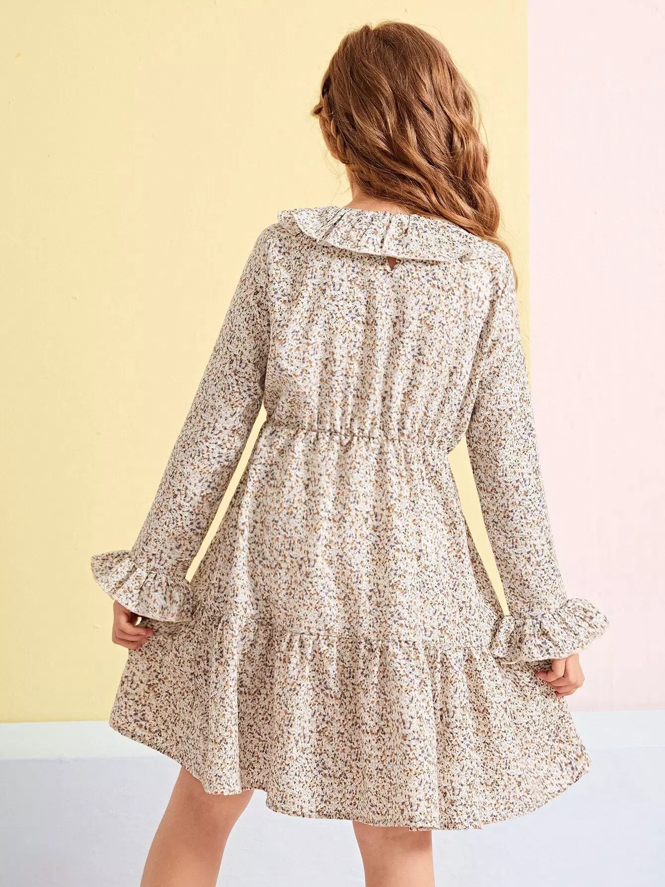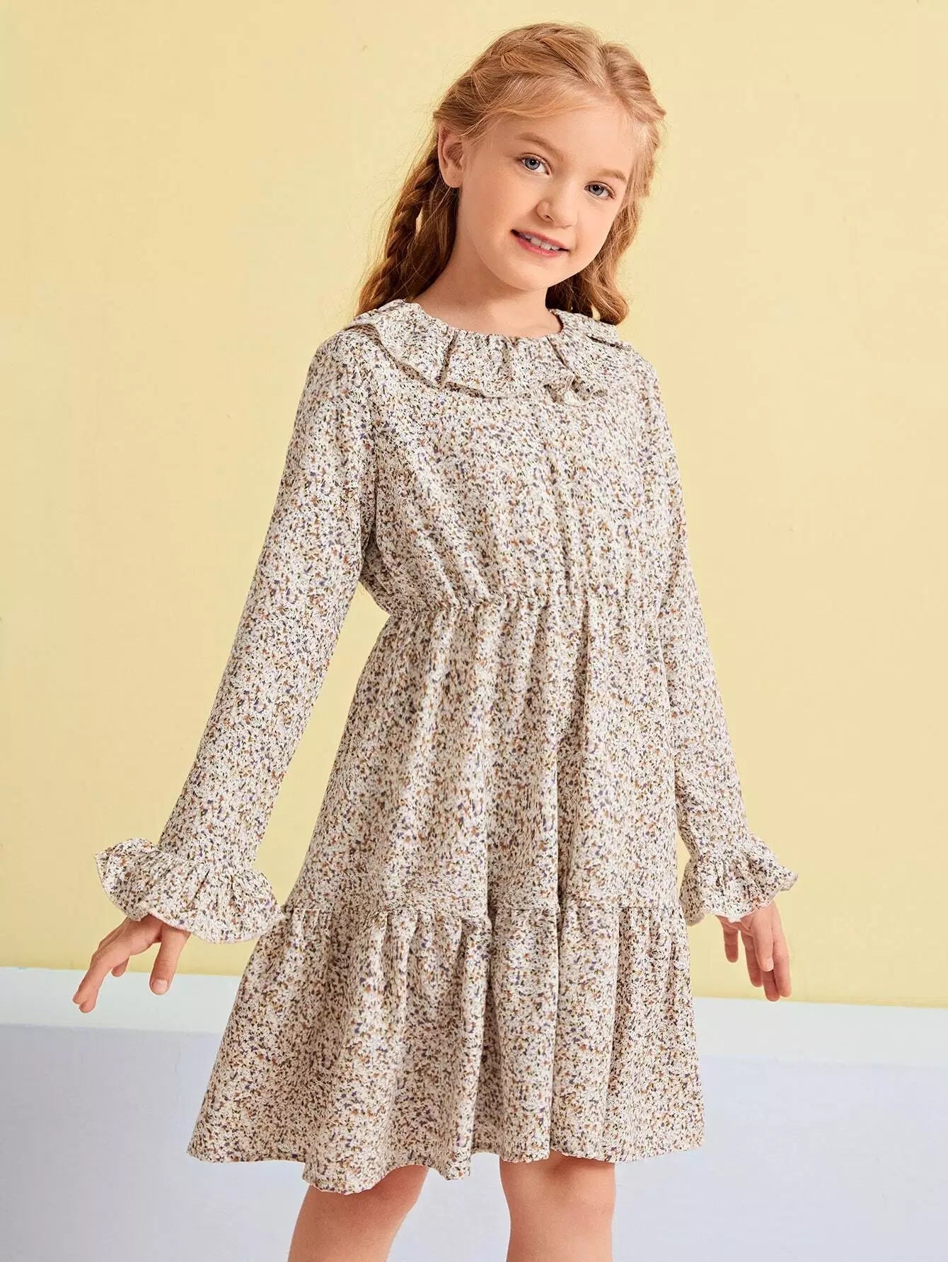 Girls Ditsy Floral Ruffle Collar Flounce Sleeve Dress