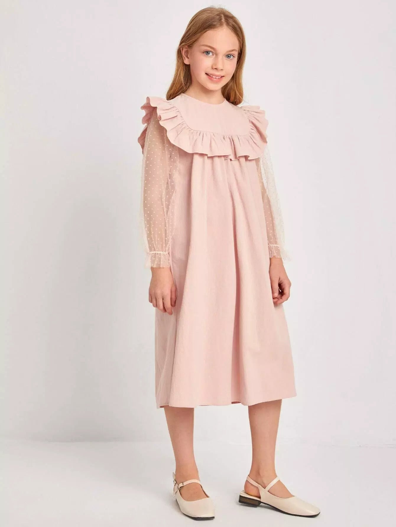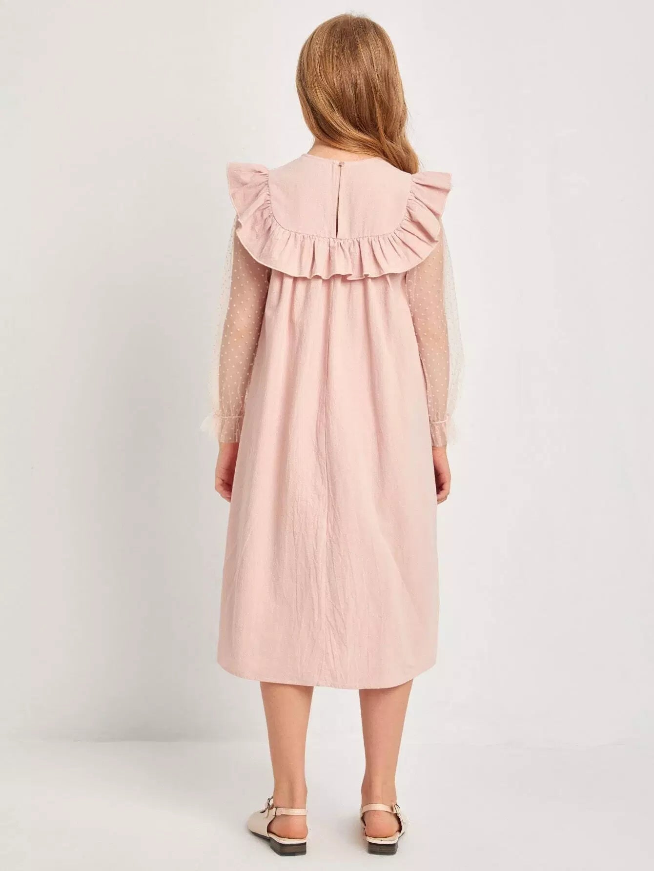 Girls Dobby Mesh Flounce Sleeve Ruffle Detail Dress