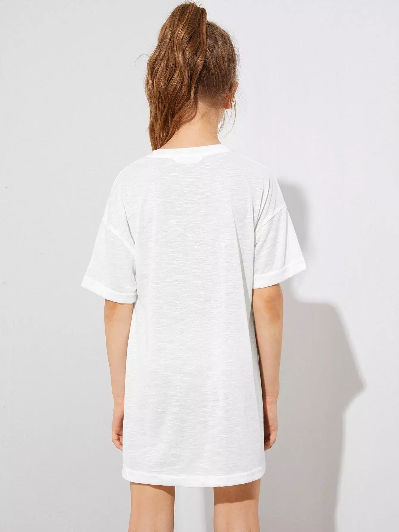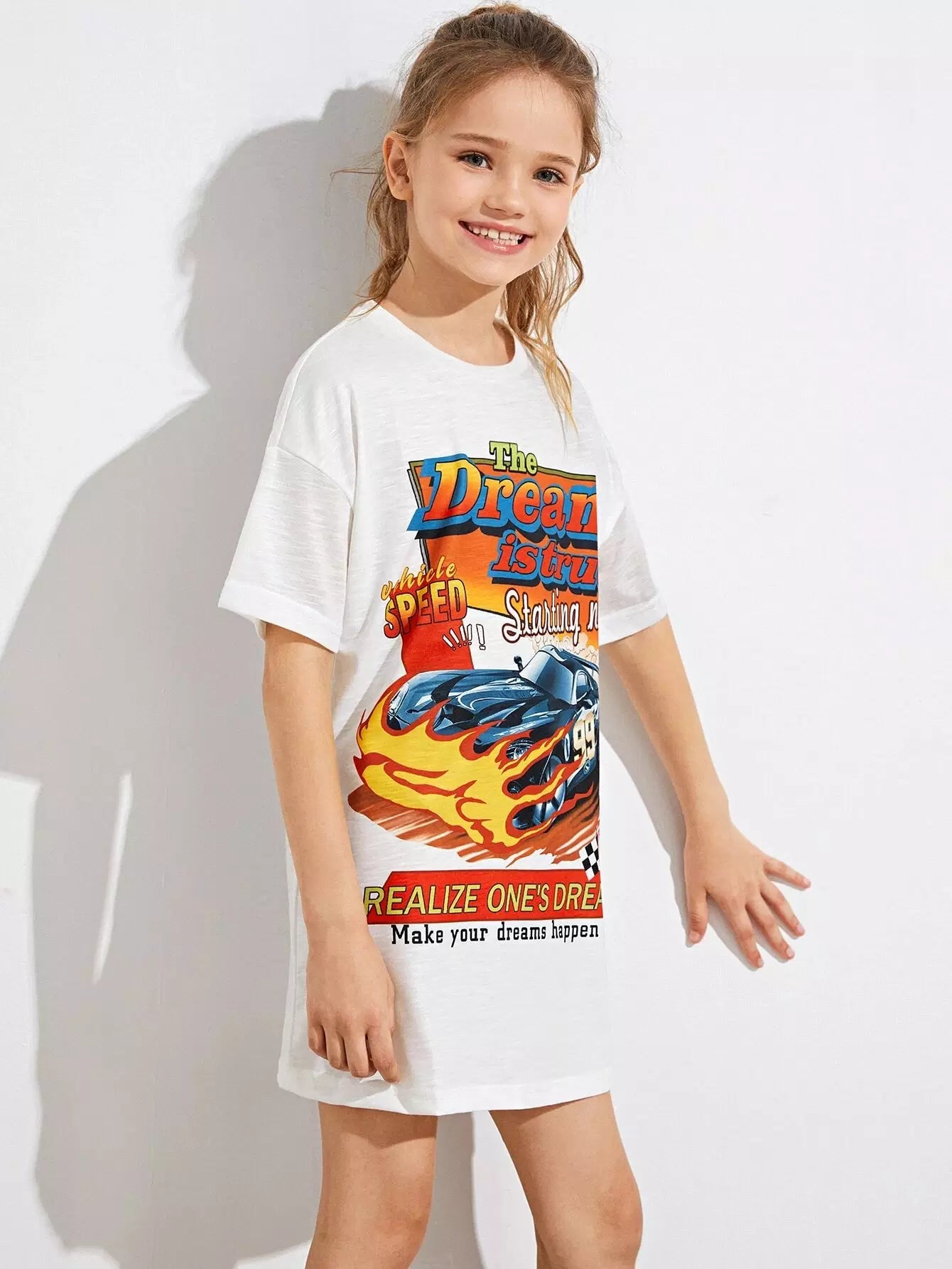 Girls Dresses - Girls Drop Shoulder Slogan & Car Print Dress