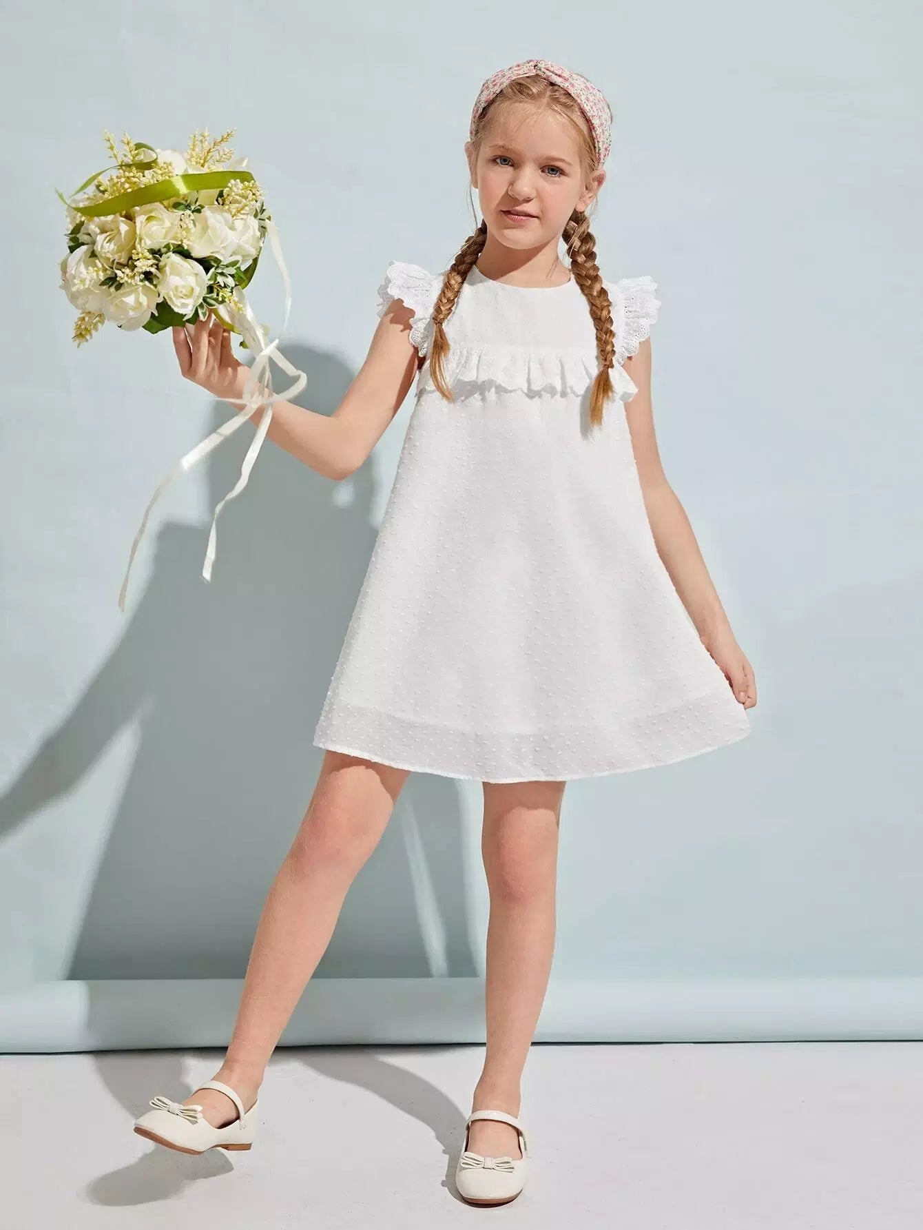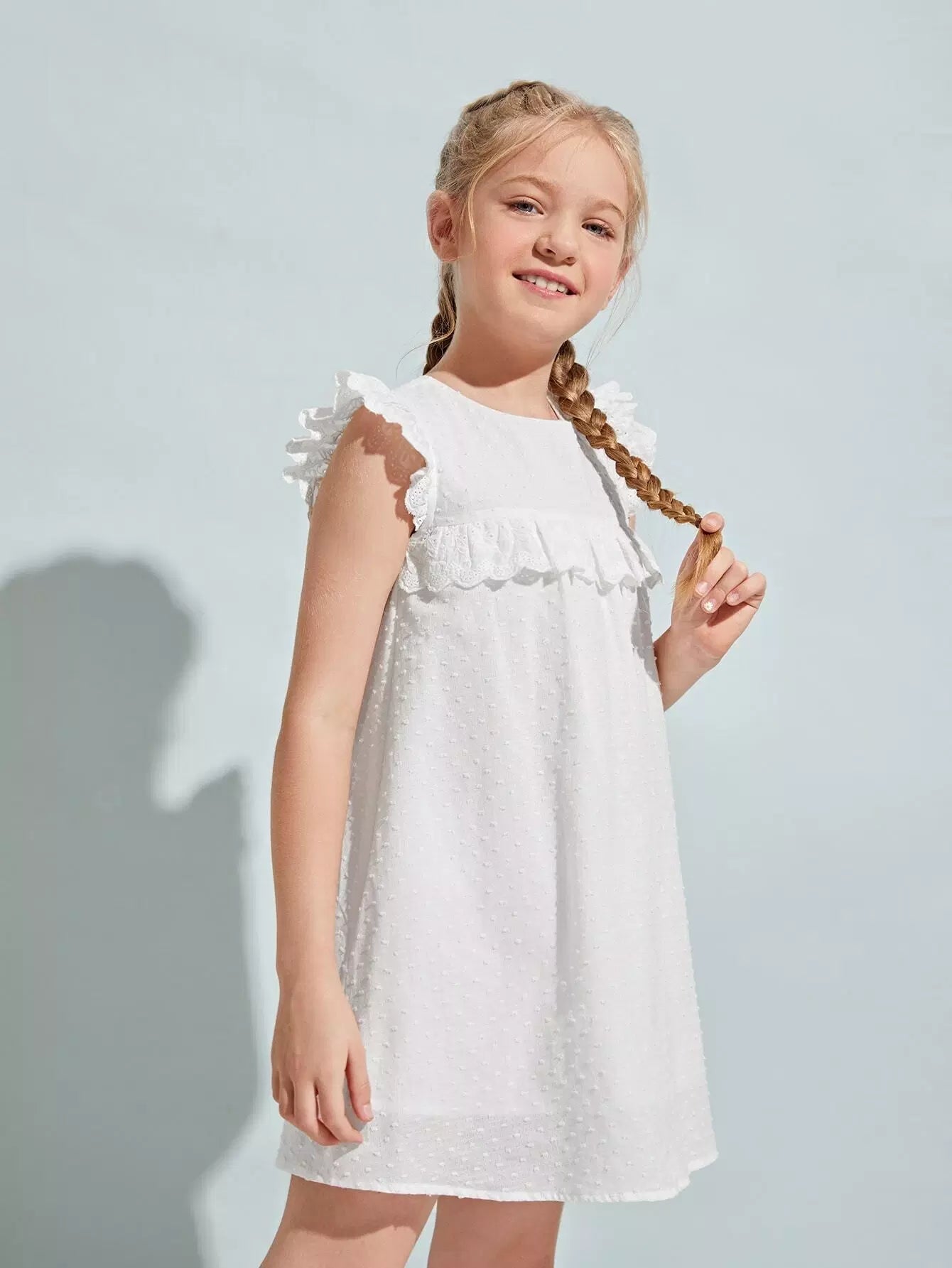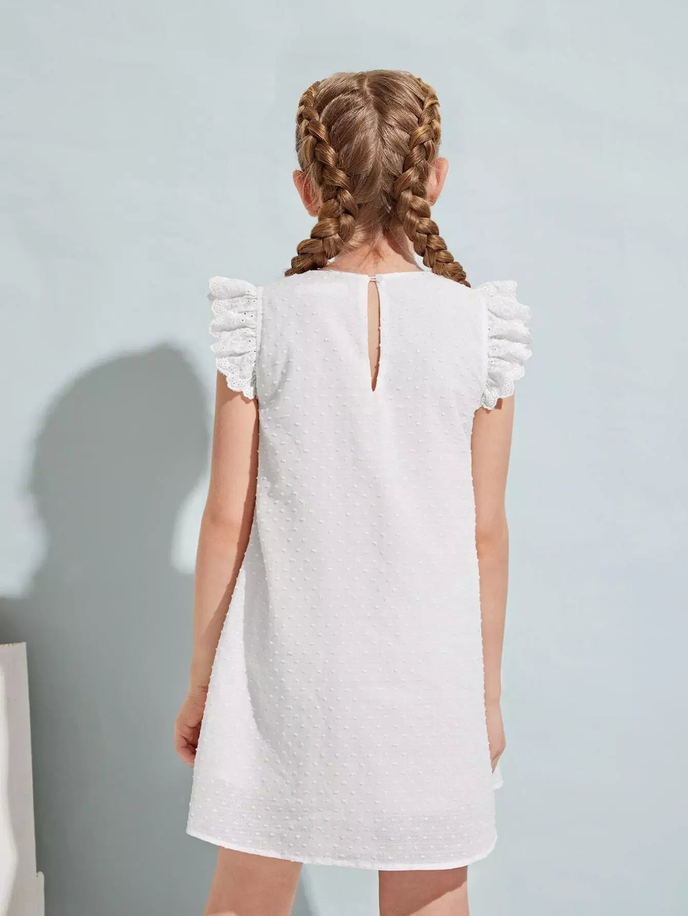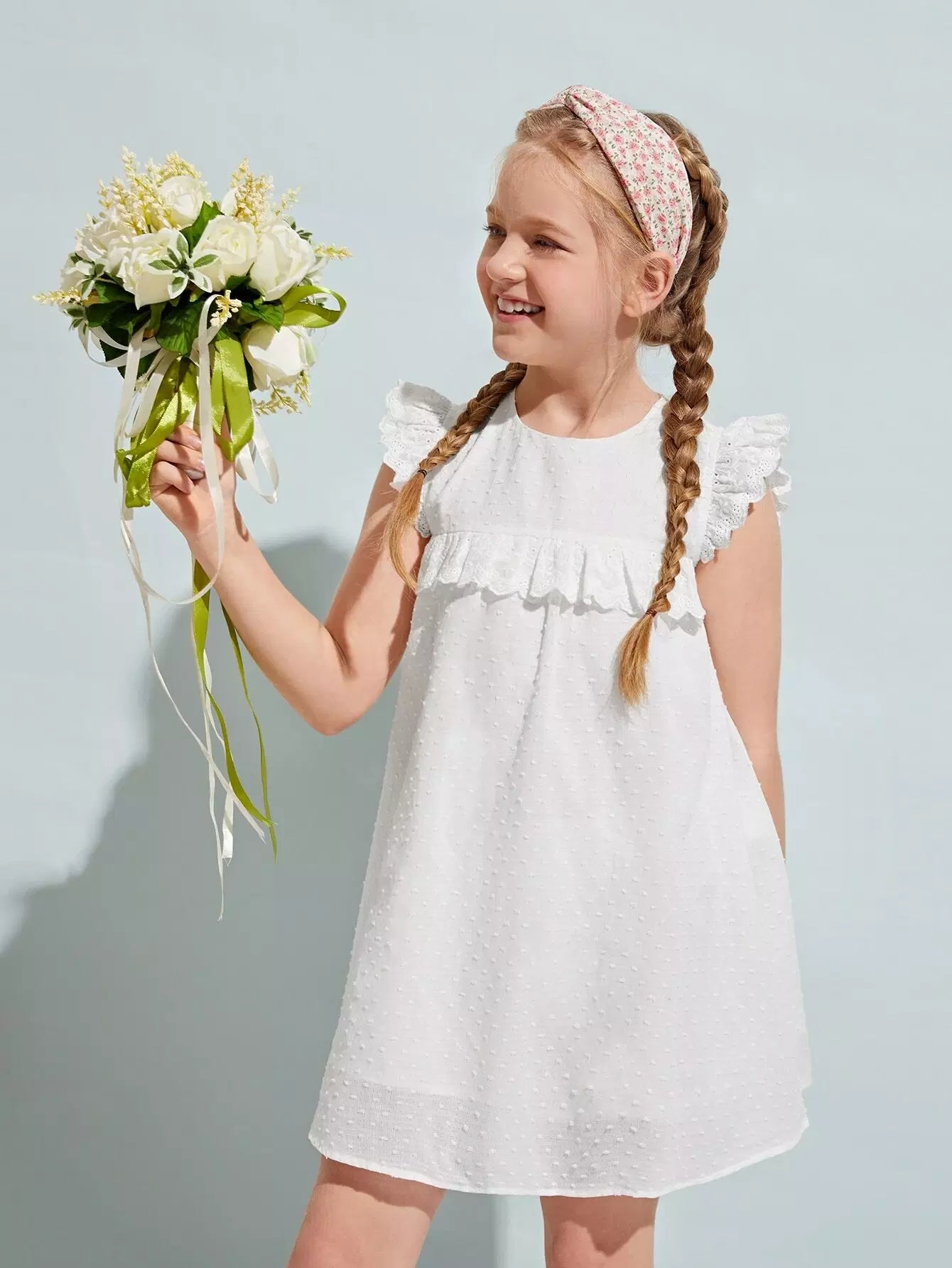 Girls Eyelet Embroidered Ruffle Trim Swiss Dot Dress