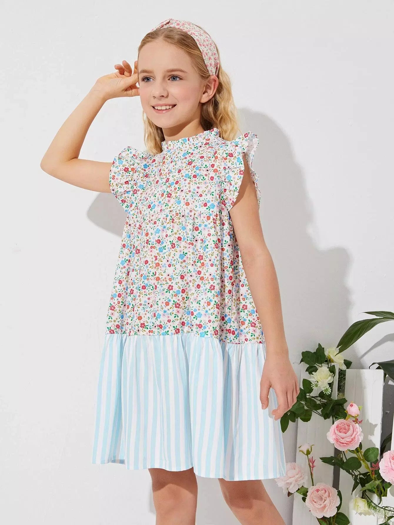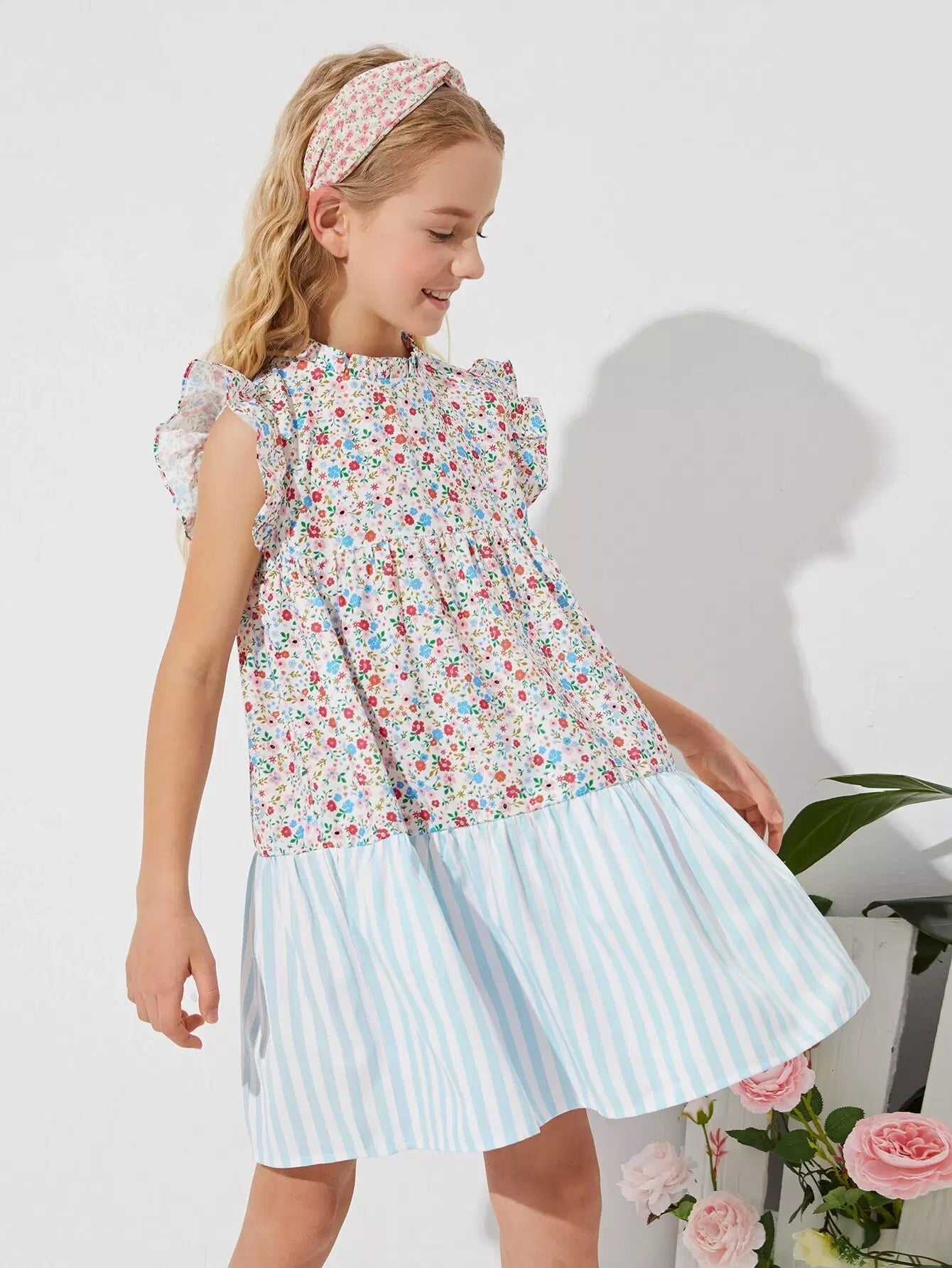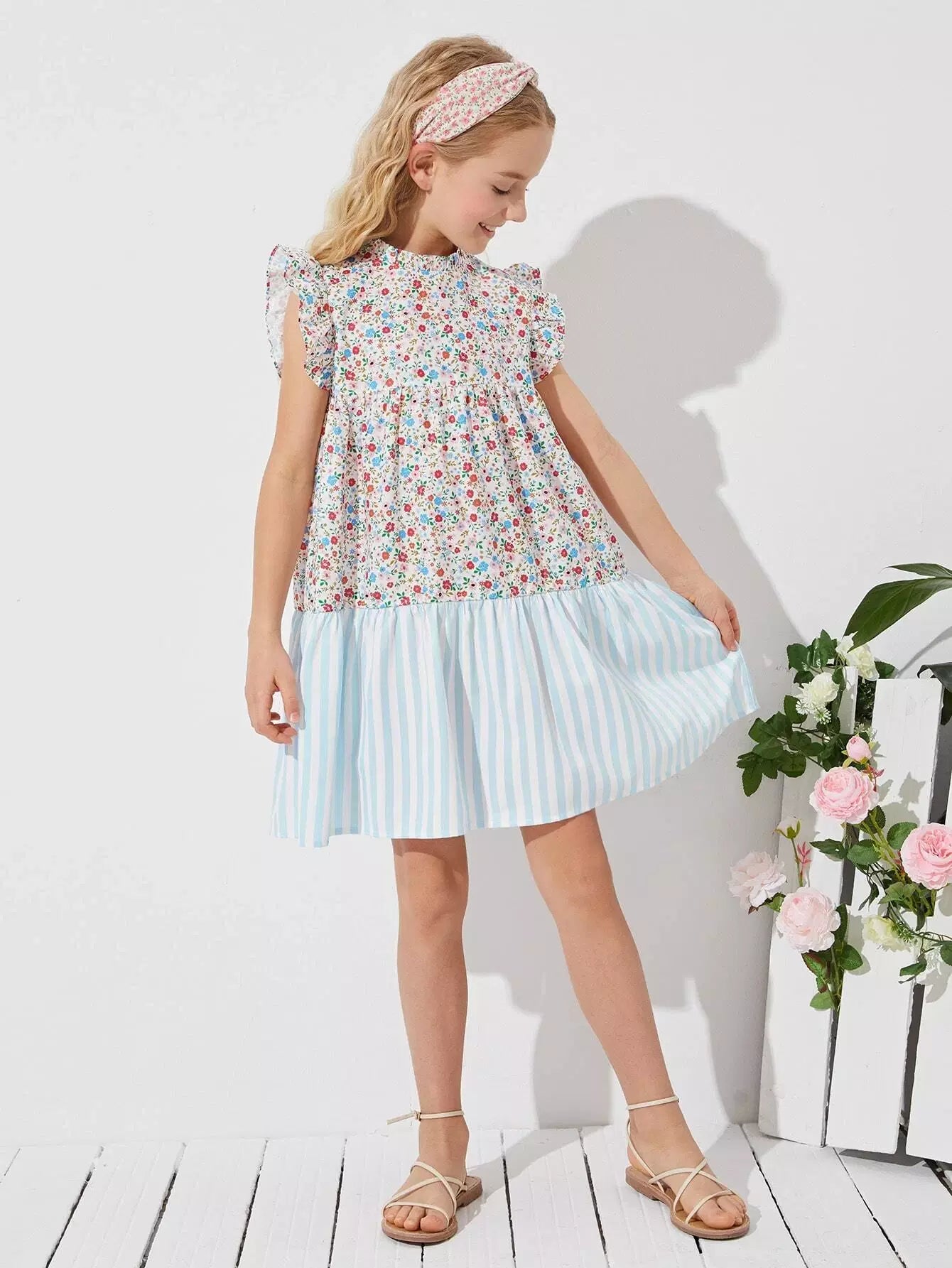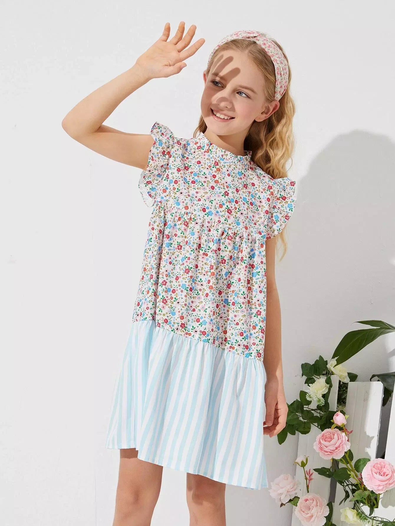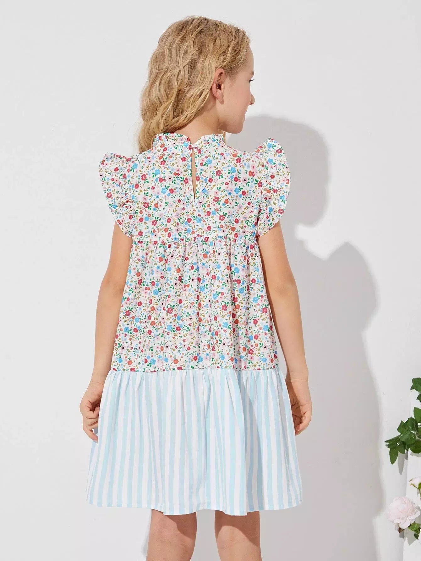 Girls Floral Butterfly Sleeve Contrast Hem Dress