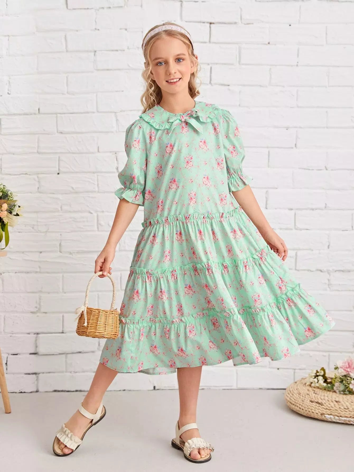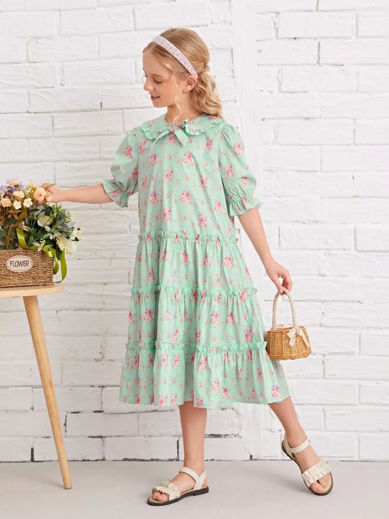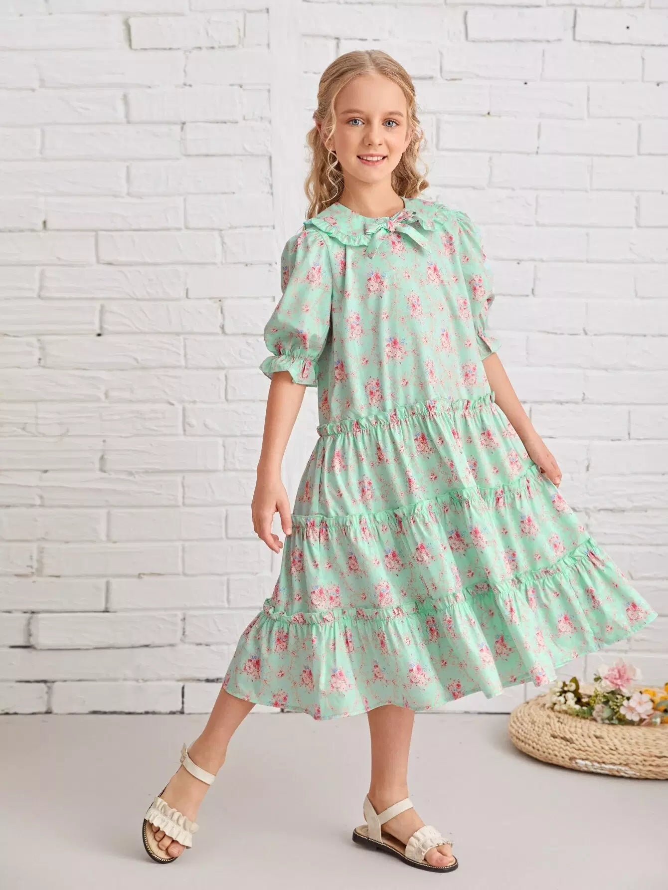 Kids - Girls Floral Knot Front Layered Hem Dress