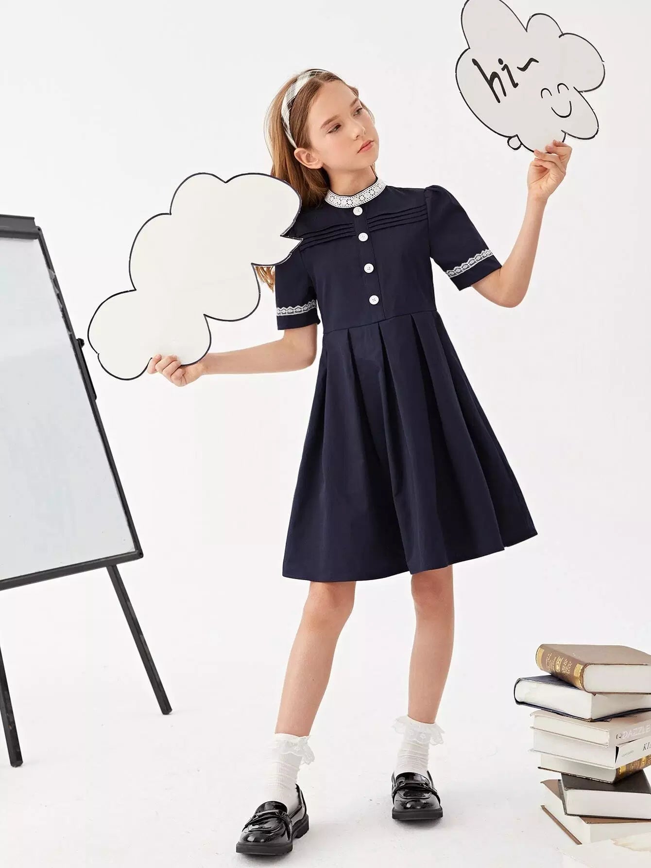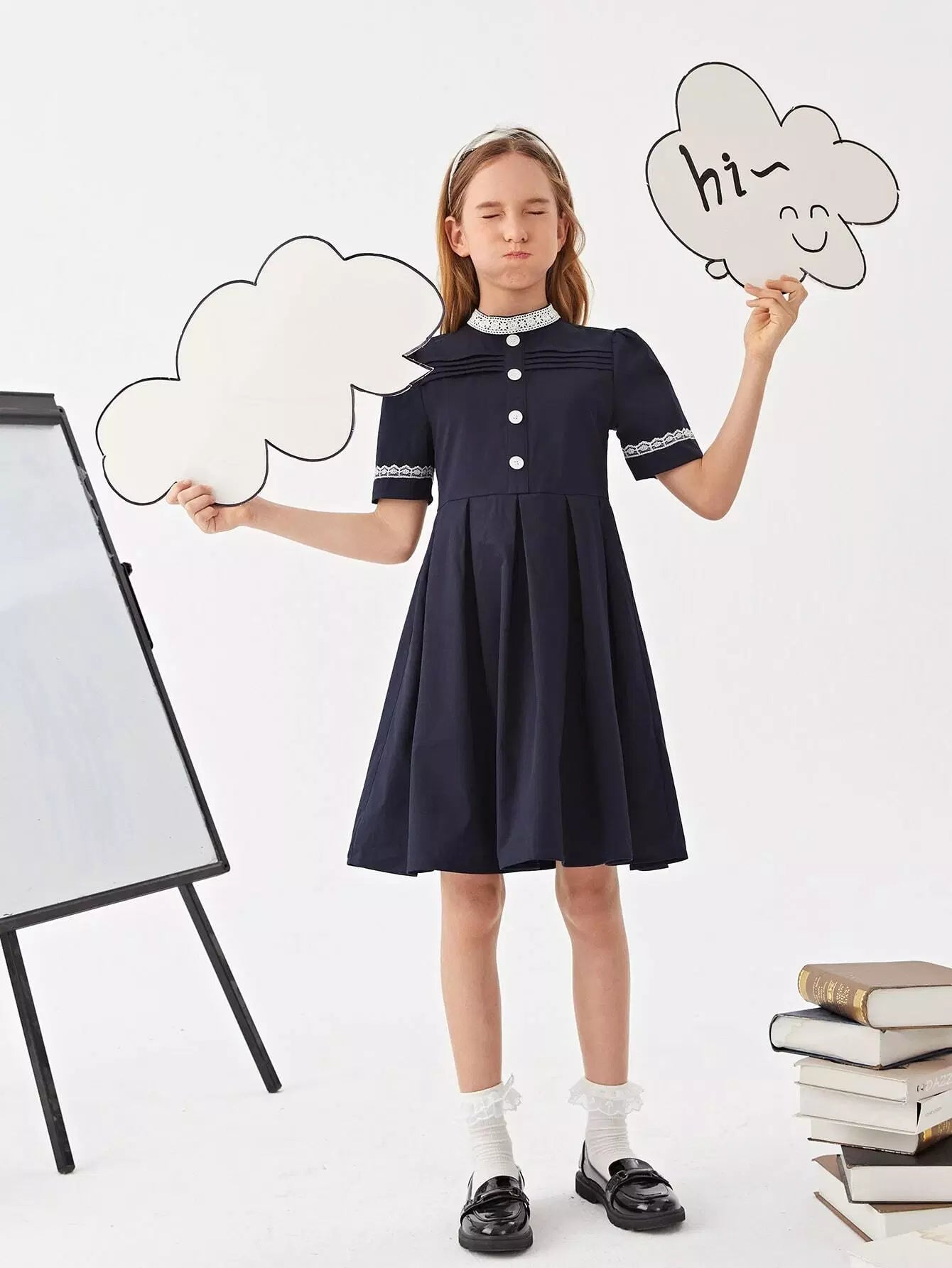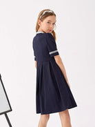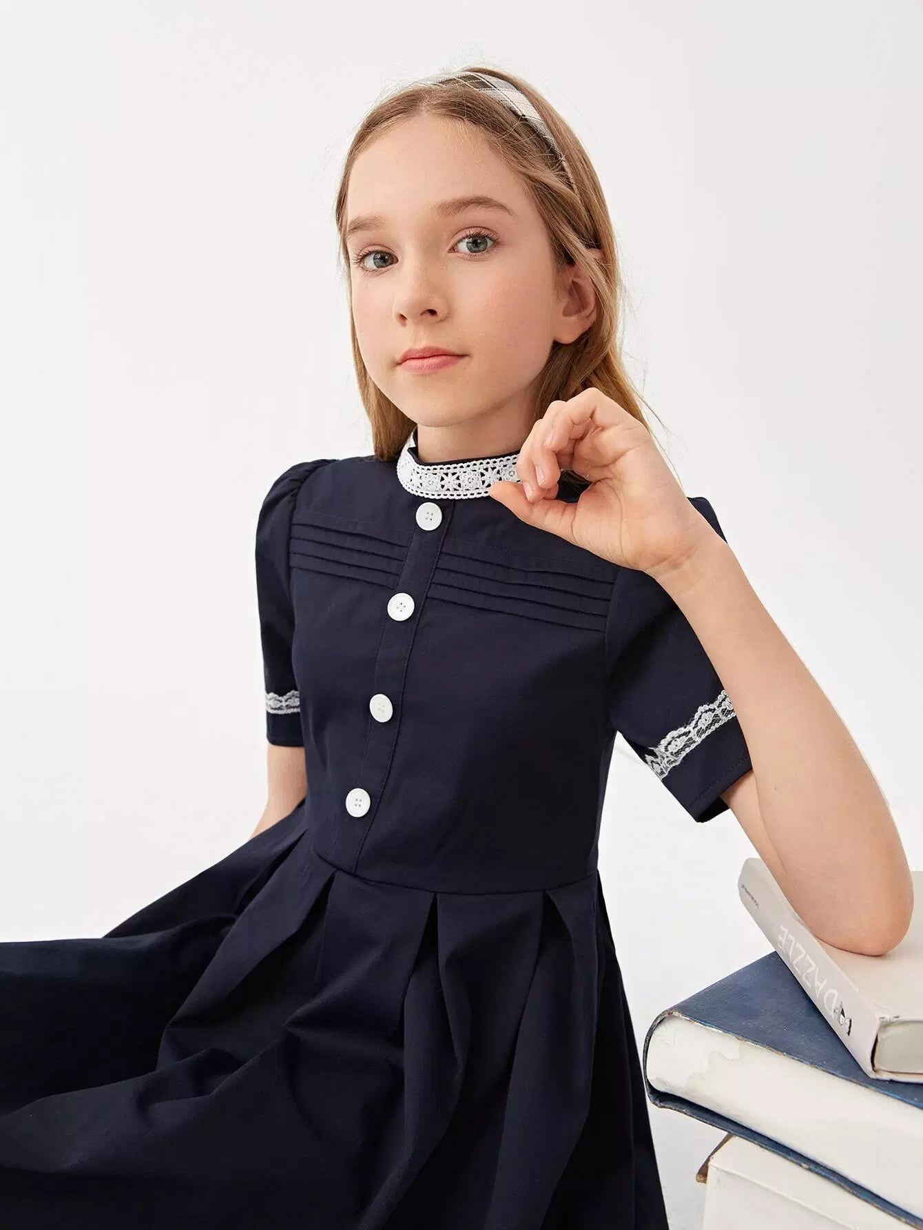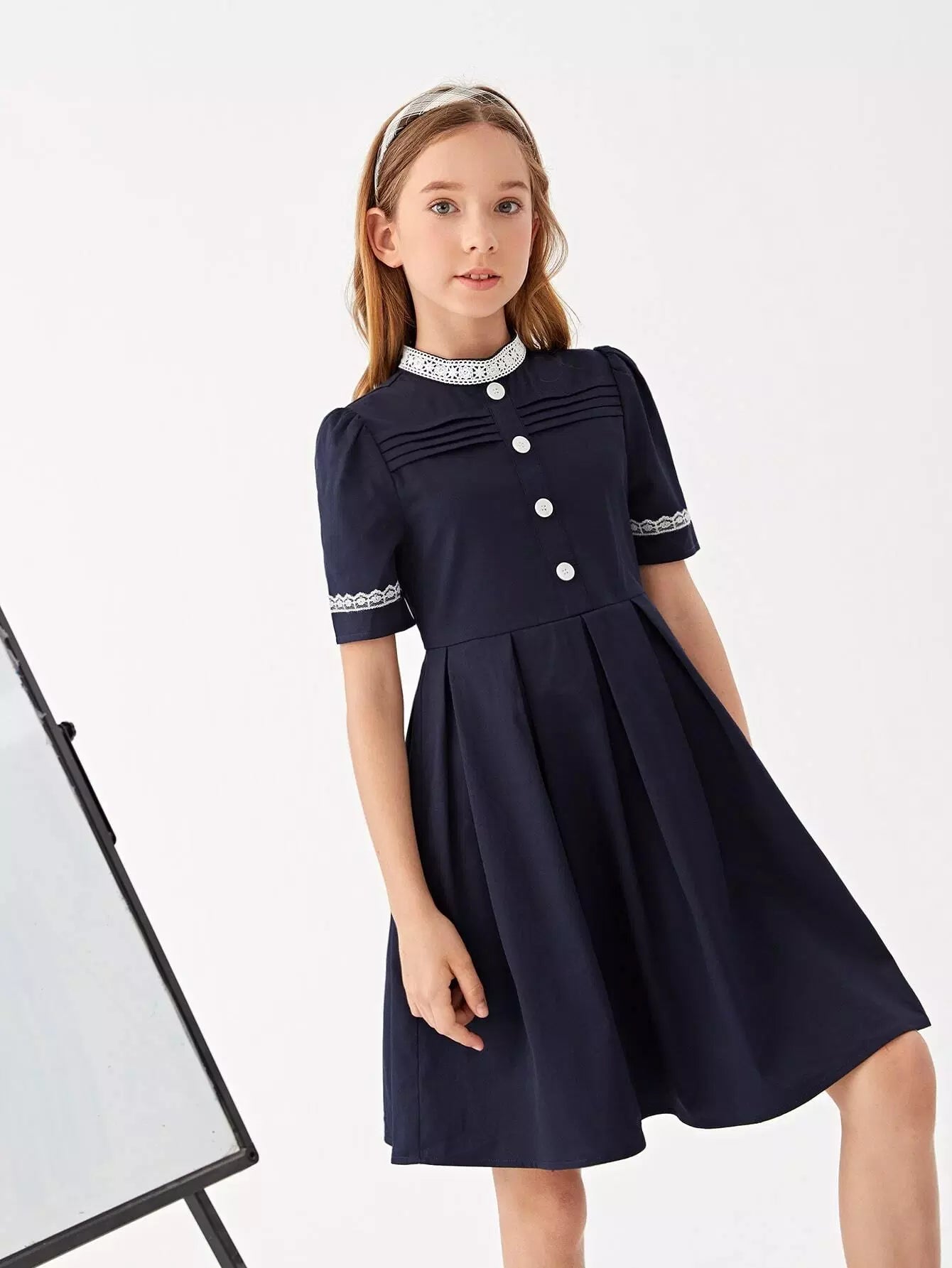 Girls Lace Detail Button Front Pleated Hem School Dress