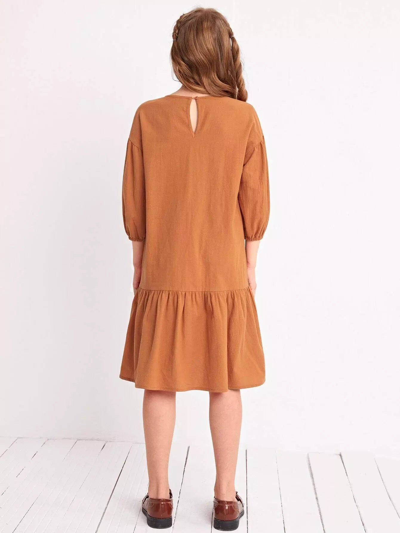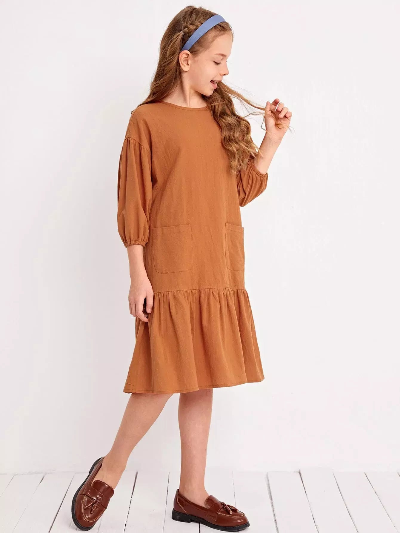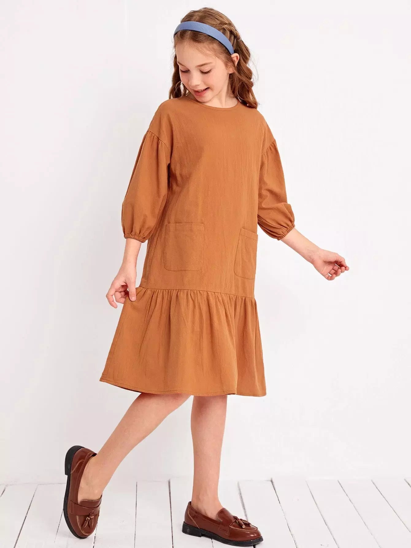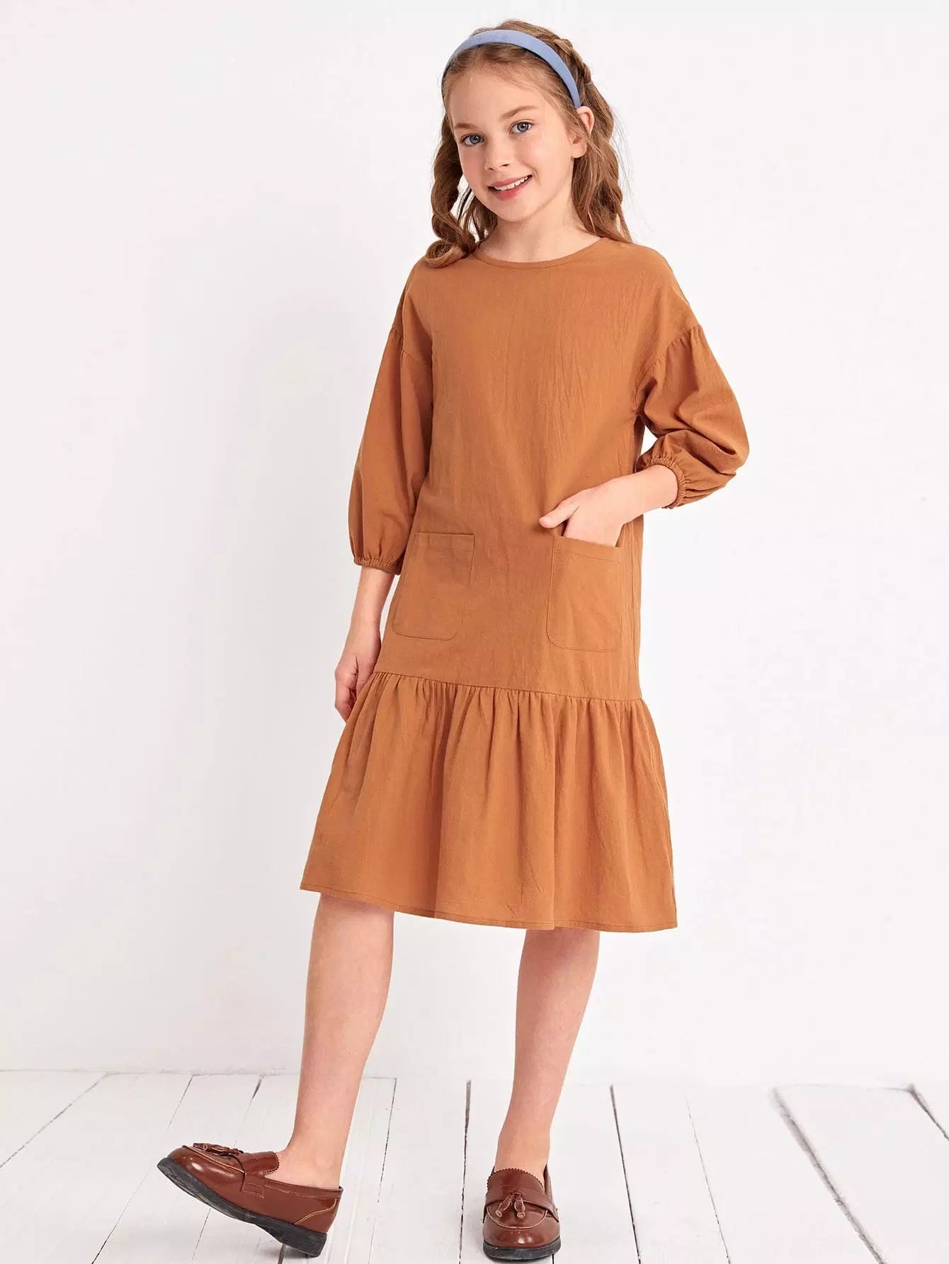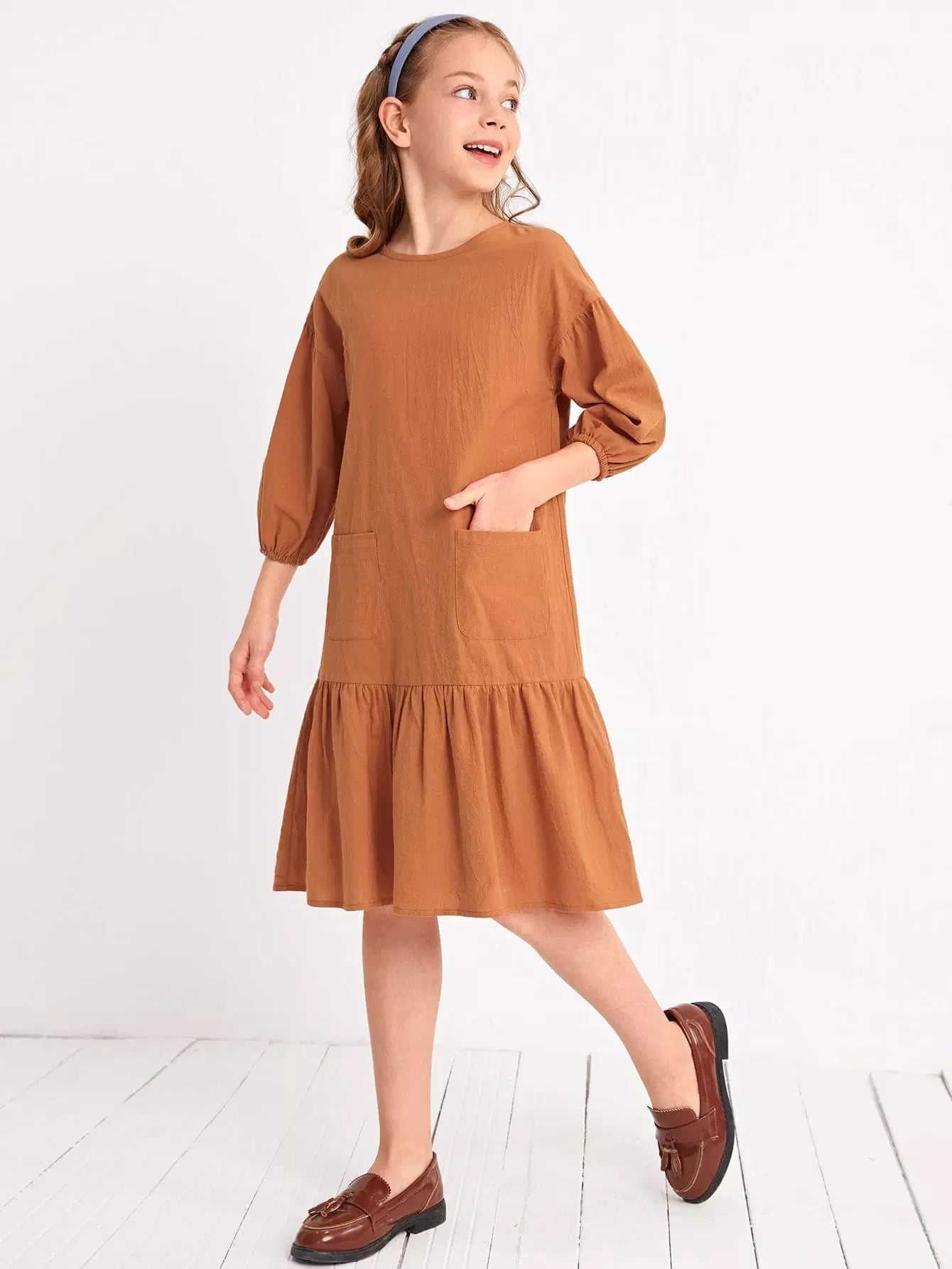 Girls Lantern Sleeve Patch Pocket Smock Dress