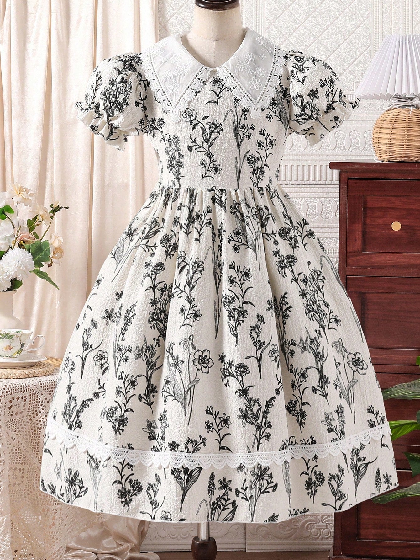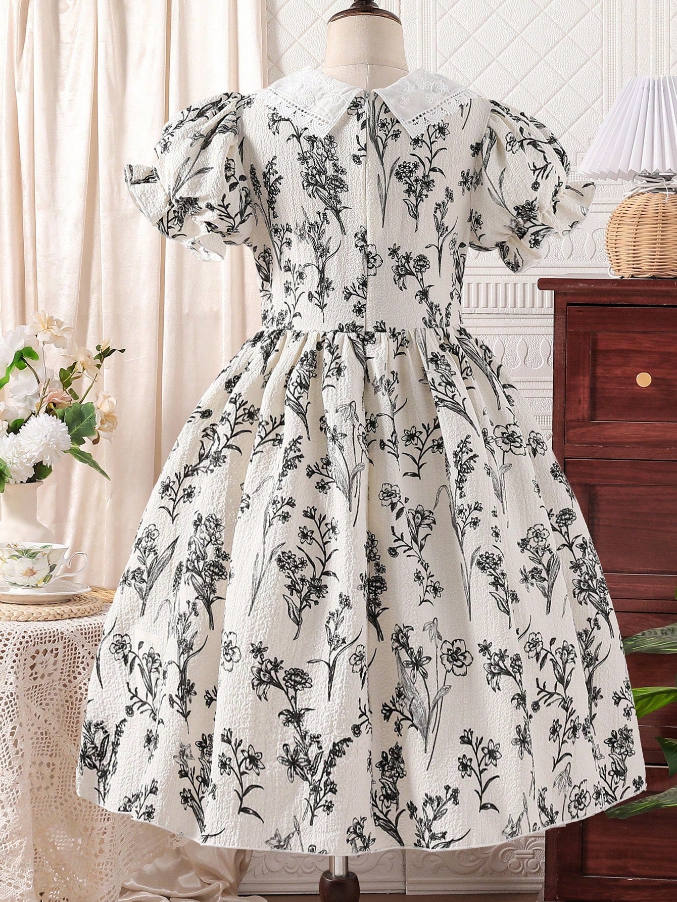 Girls Ruffle Collared Zipper Puff Sleeve Empire Waist Casual Dress, Cute, Comfortable, Fashionable, Suitable