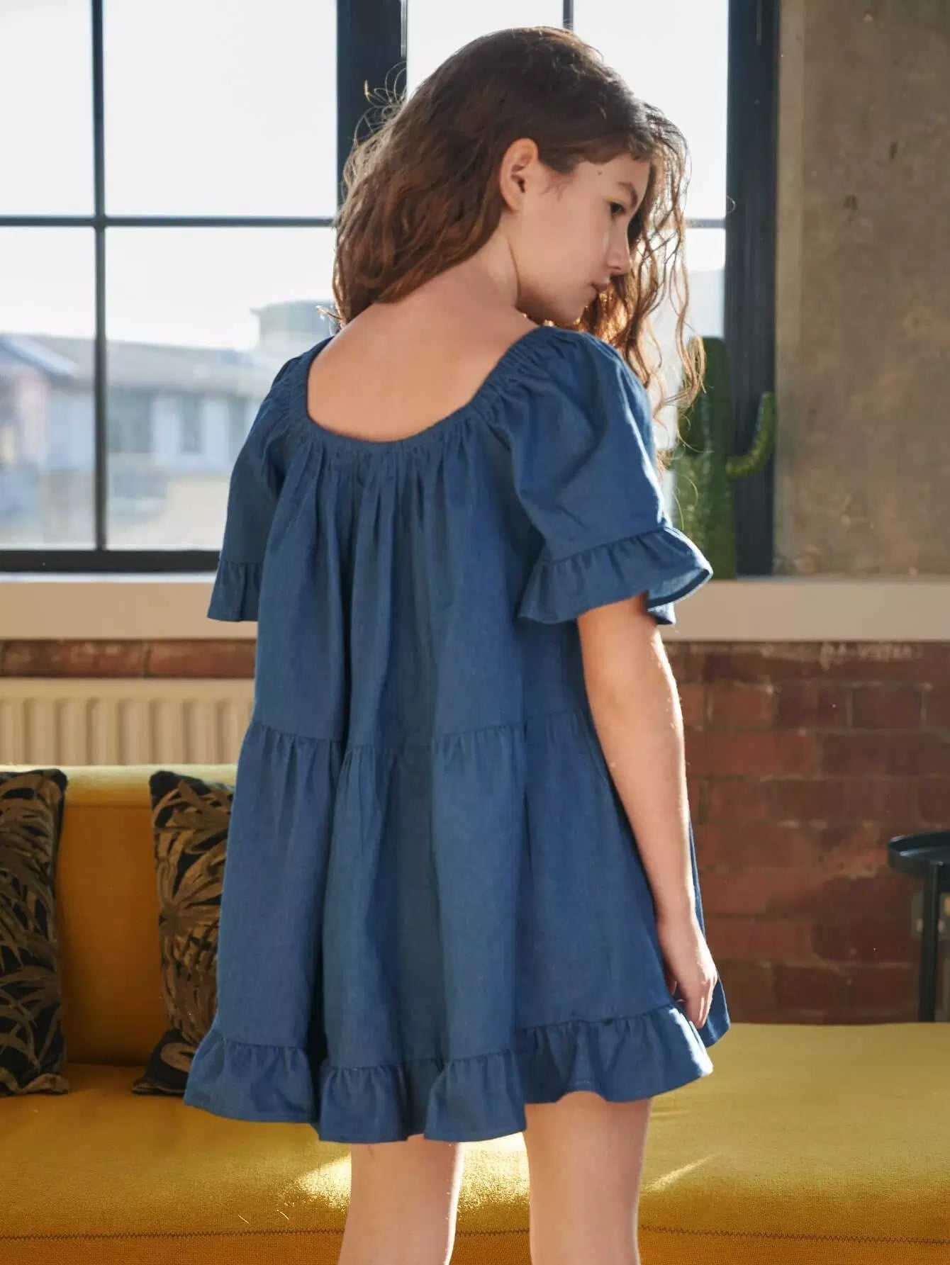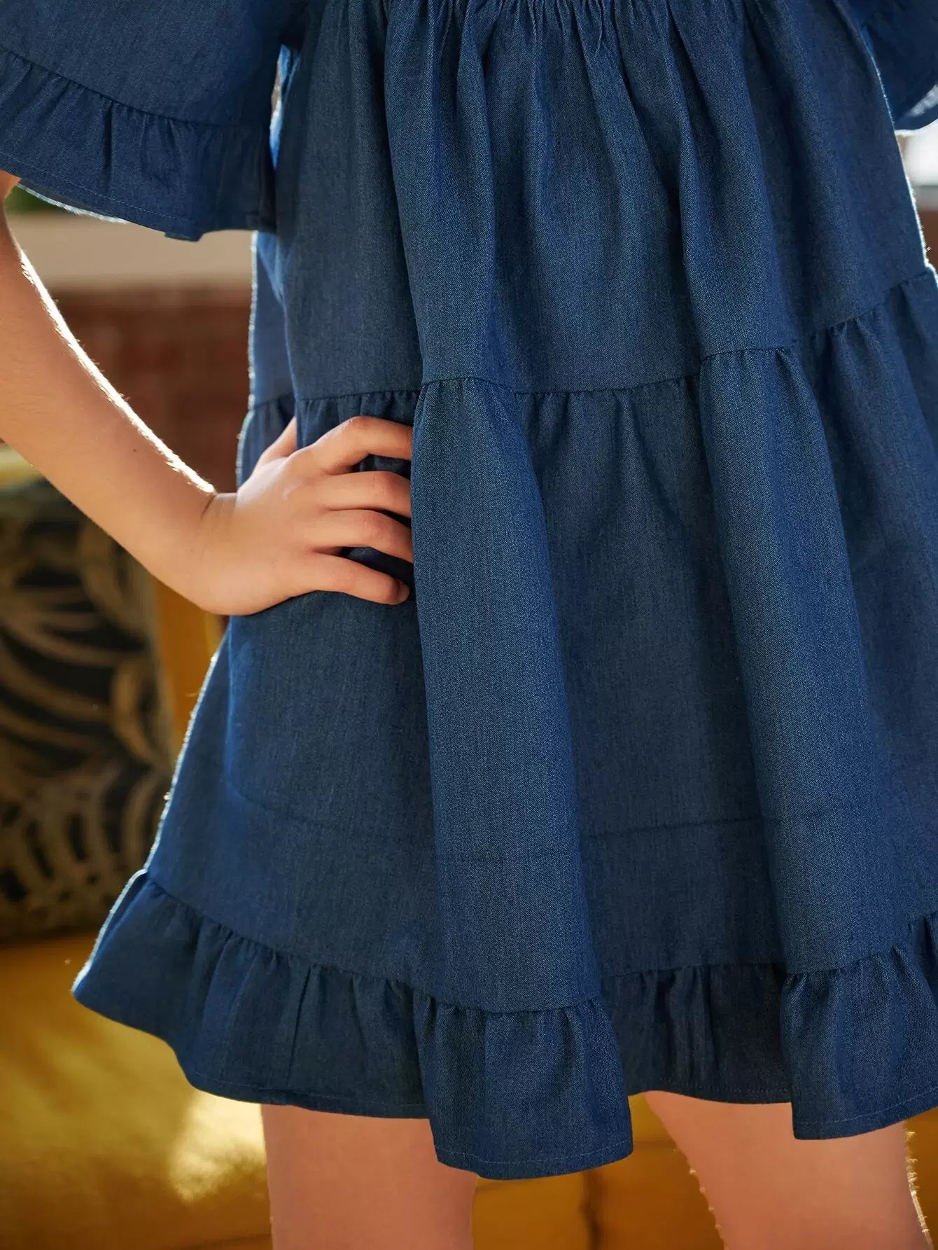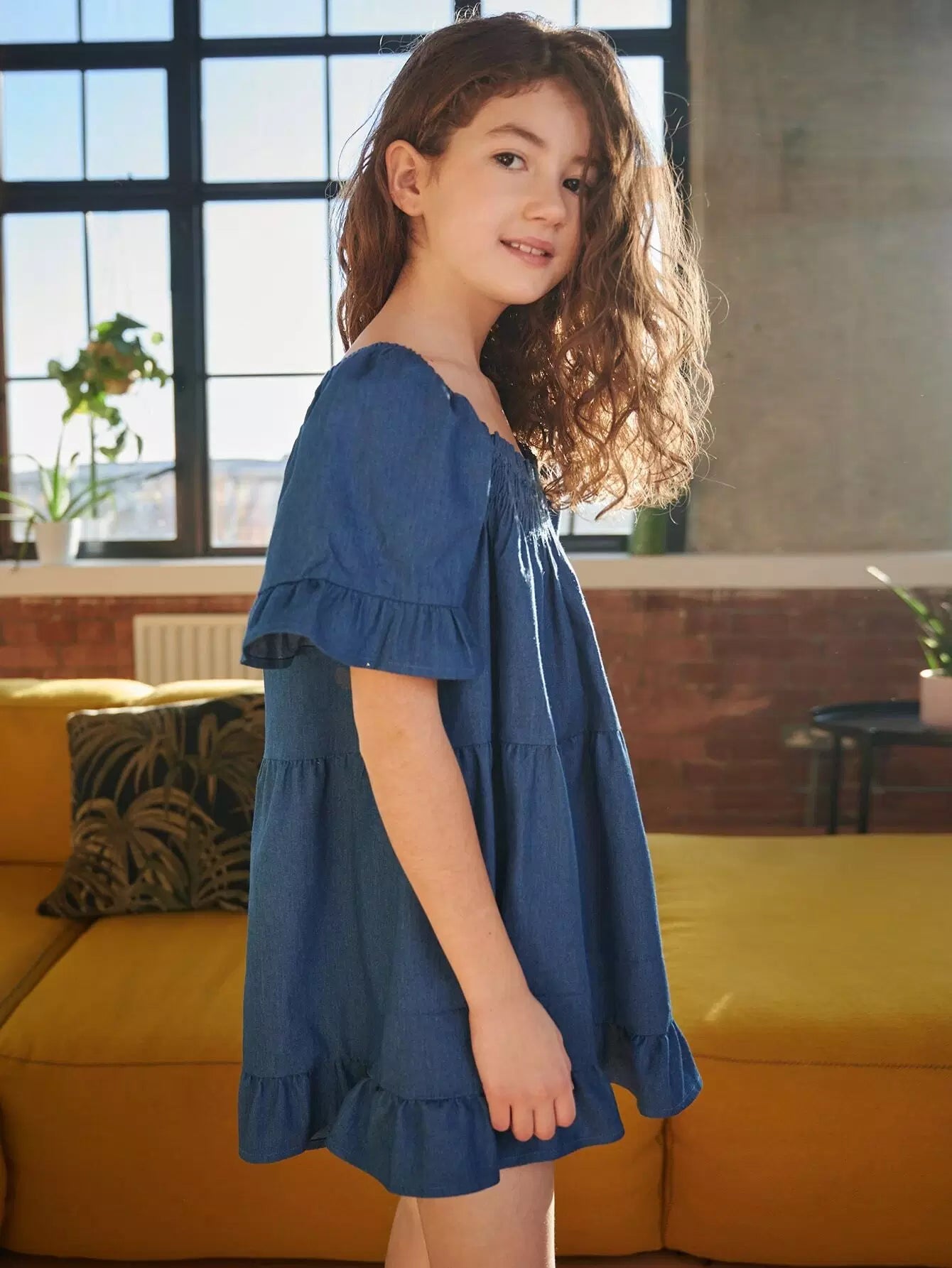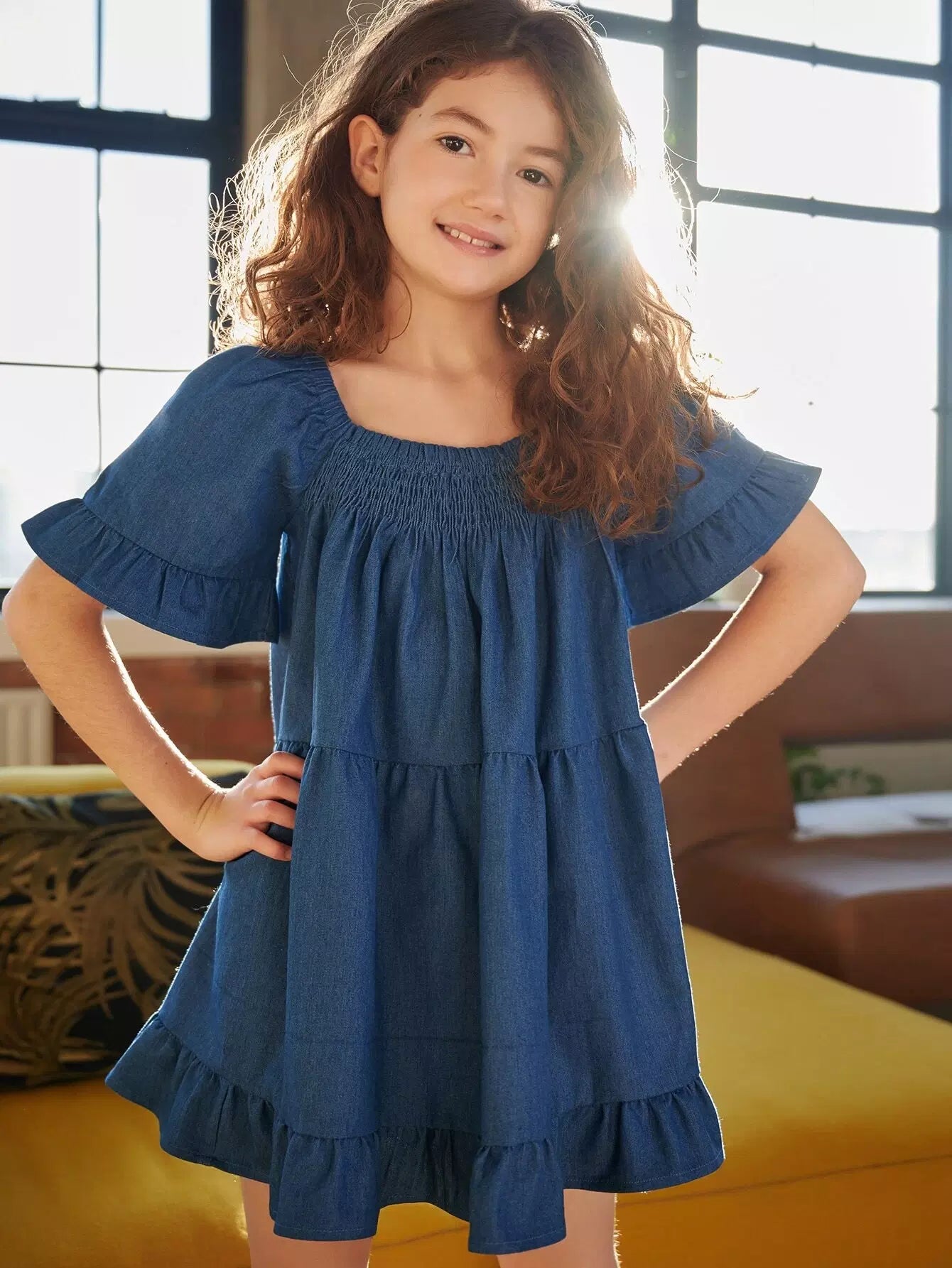 Girls Shirred Yoke Ruffle Trim Smock Dress
