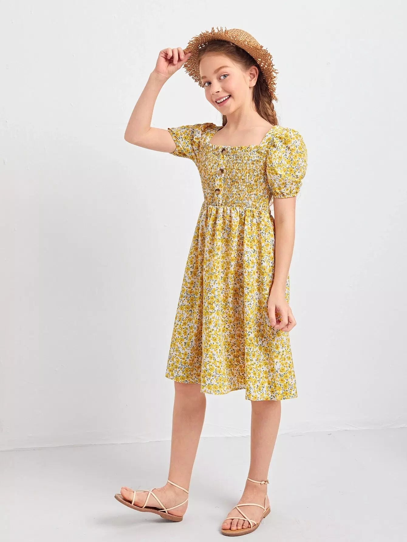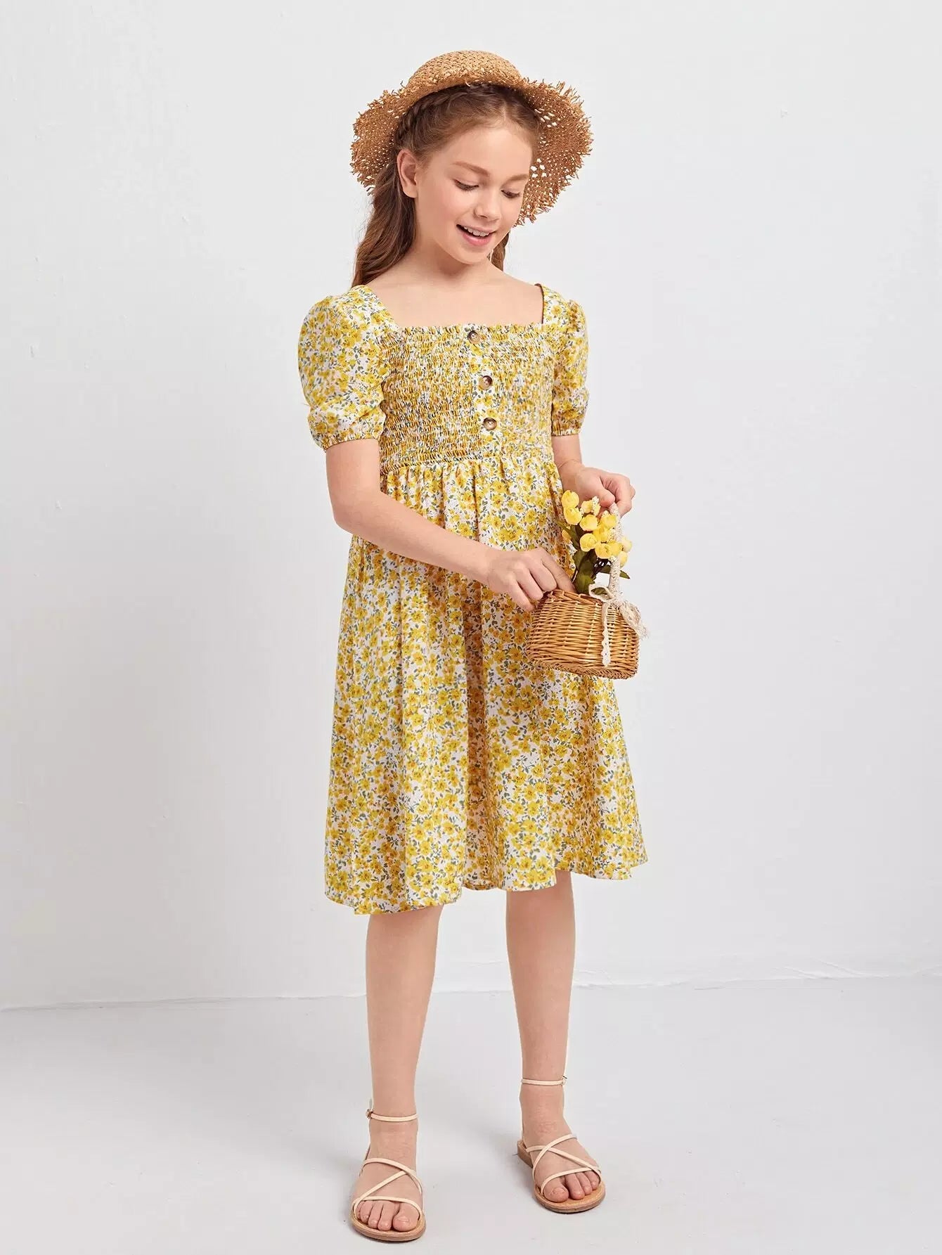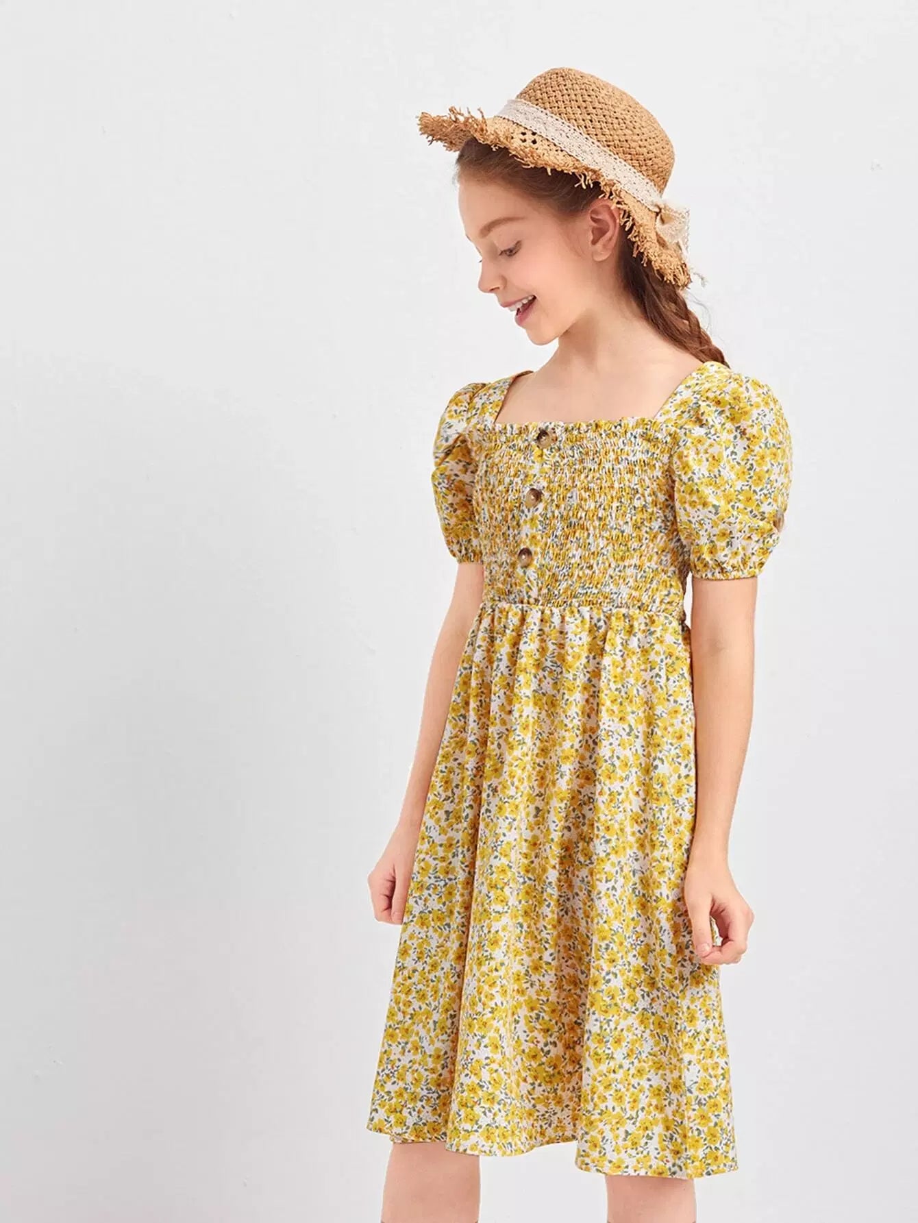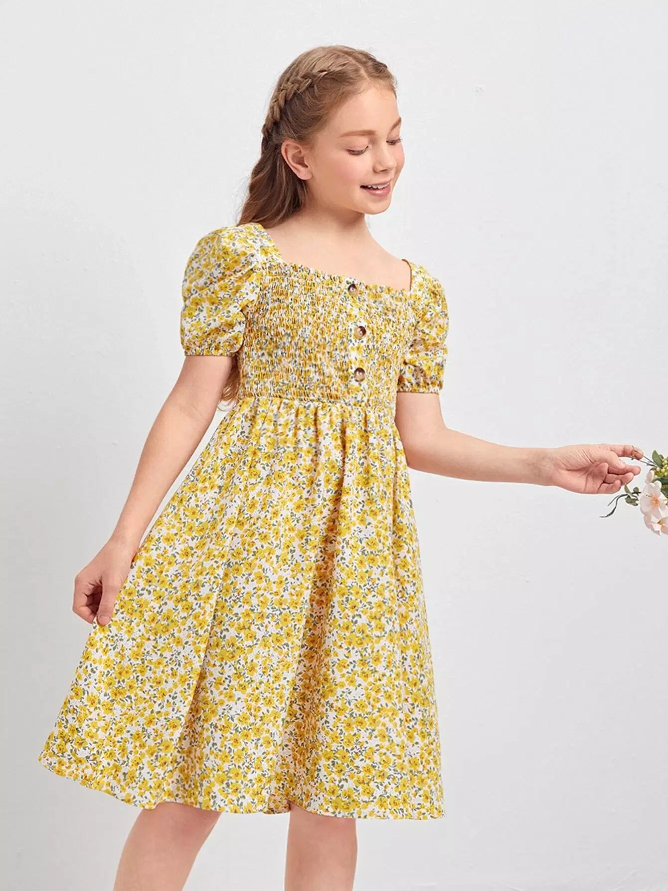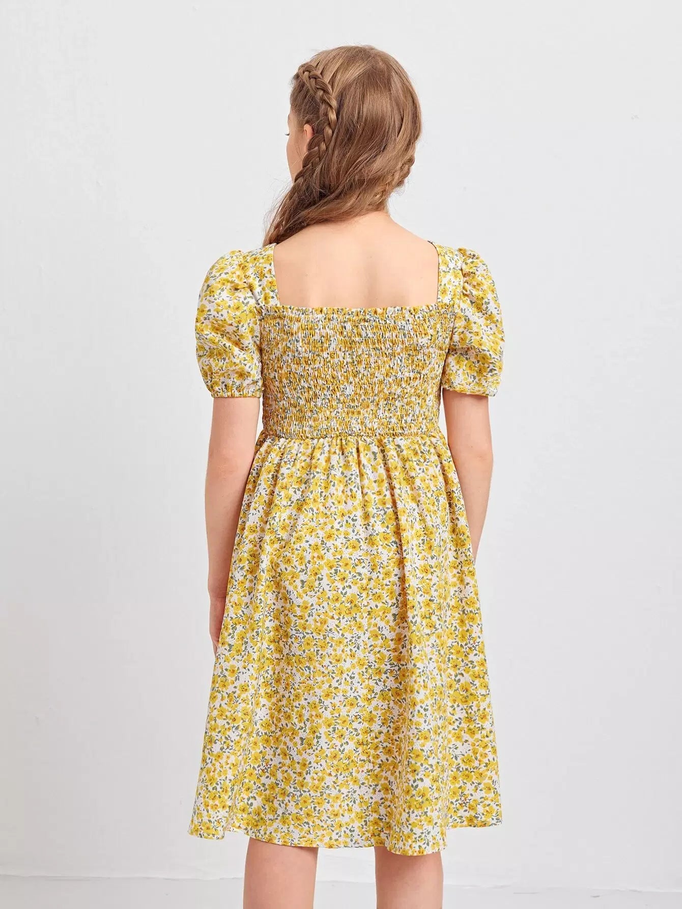 Girls Square Neck Shirred Detail Ditsy Floral Dress