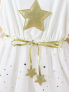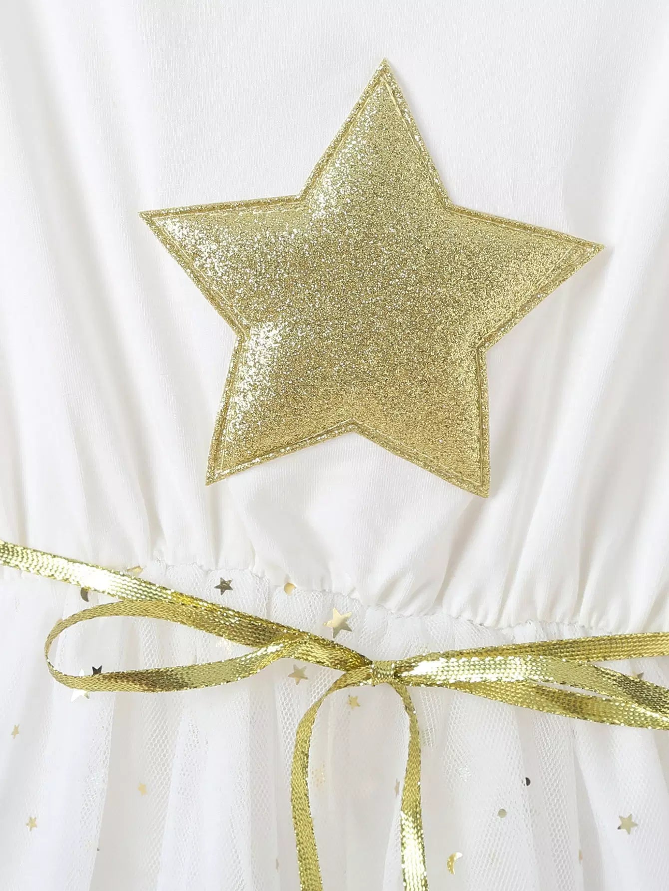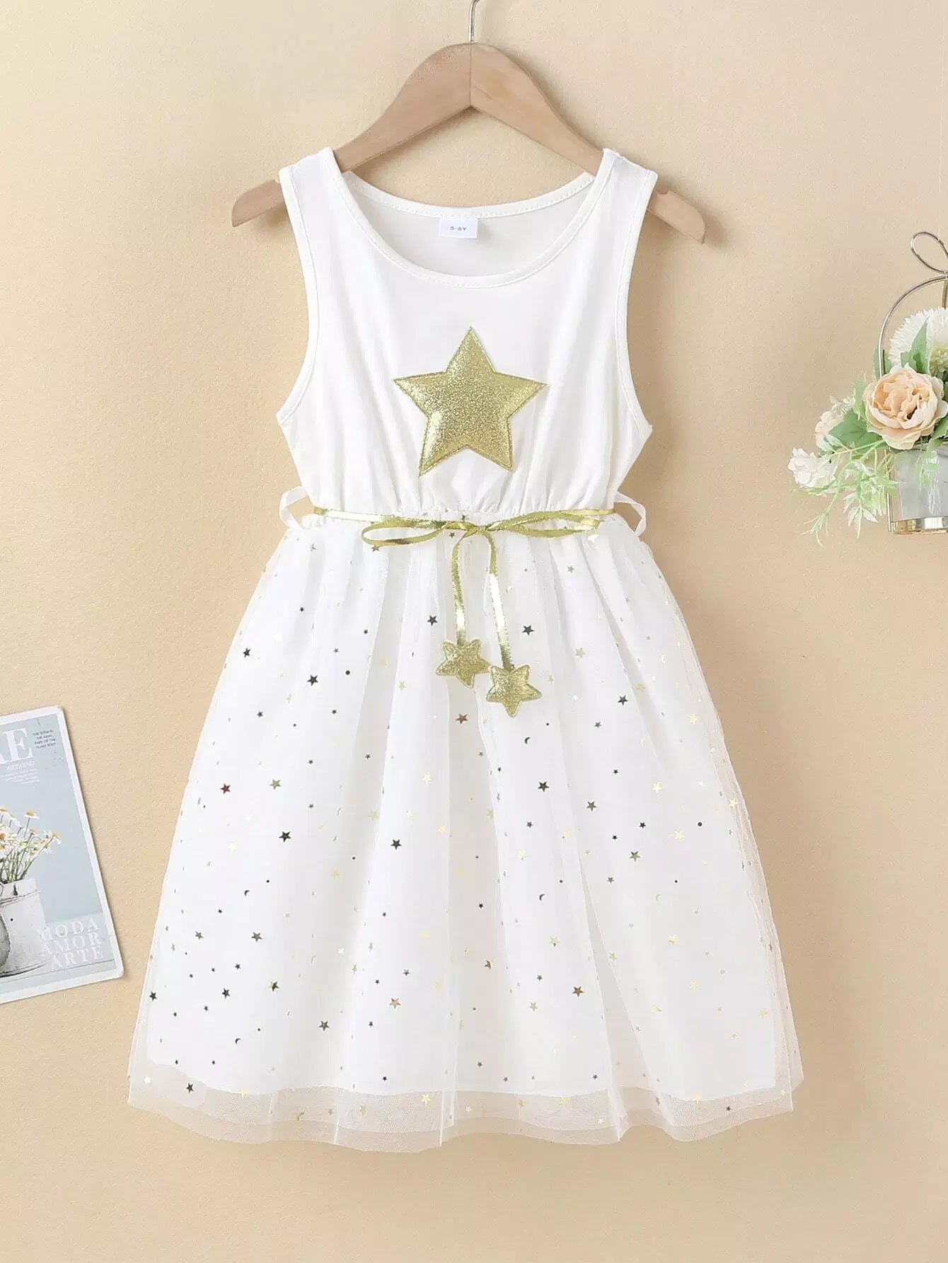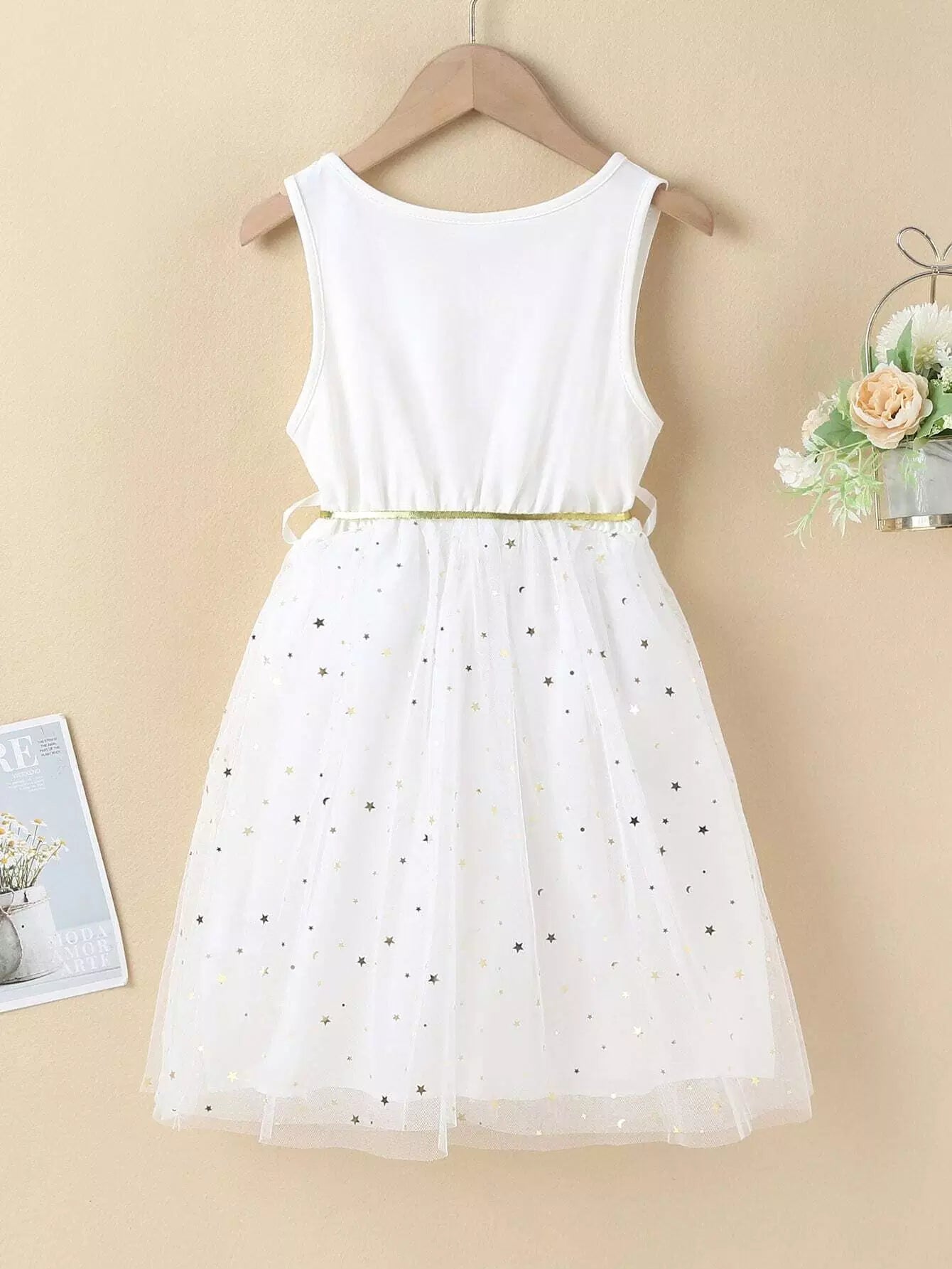Girls Star Patched Galaxy Mesh Hem Dress Without Belt