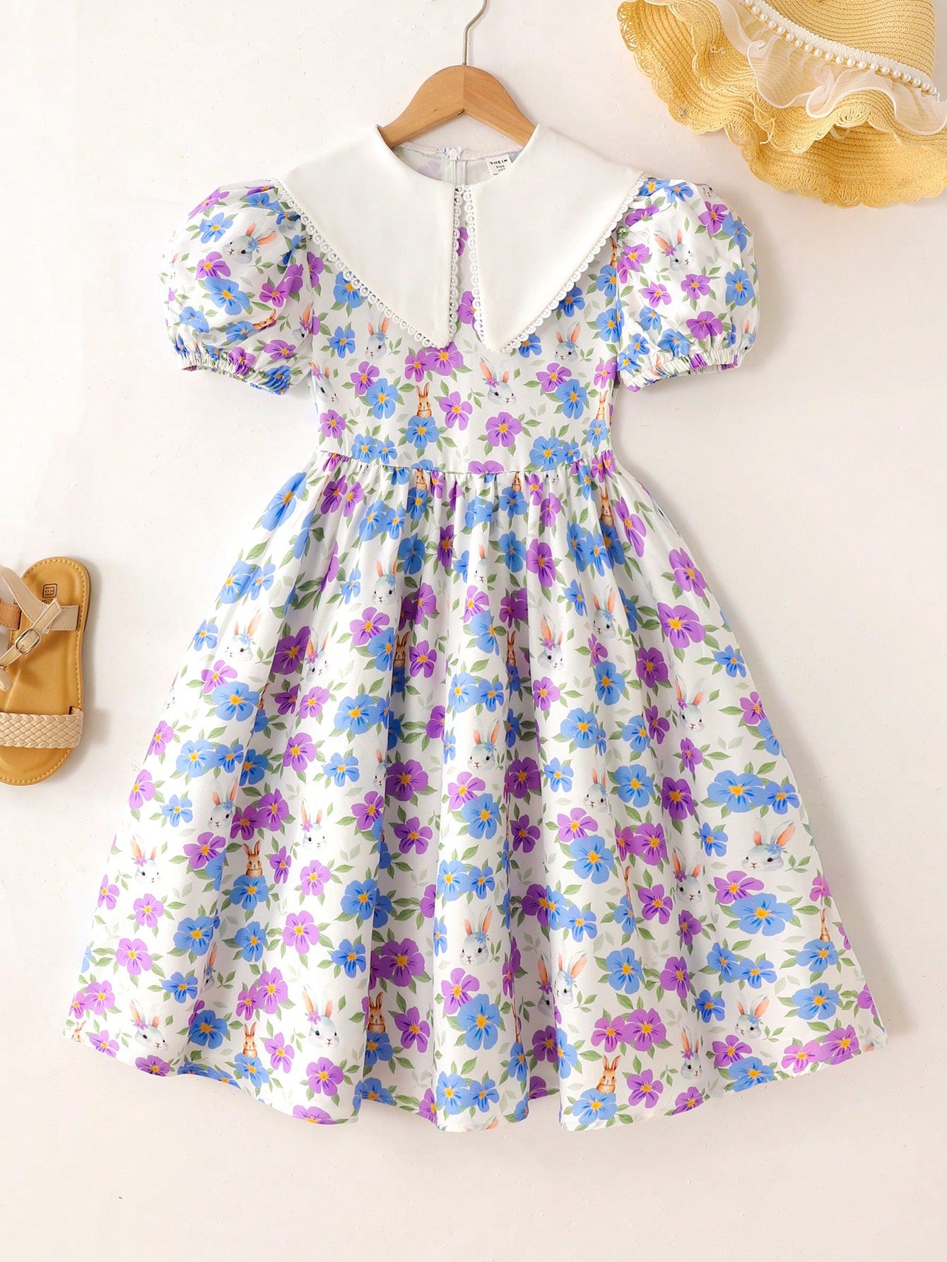 SHEIN Tween Girl Ditsy Floral Lapel Casual Holiday Short Sleeve Dress