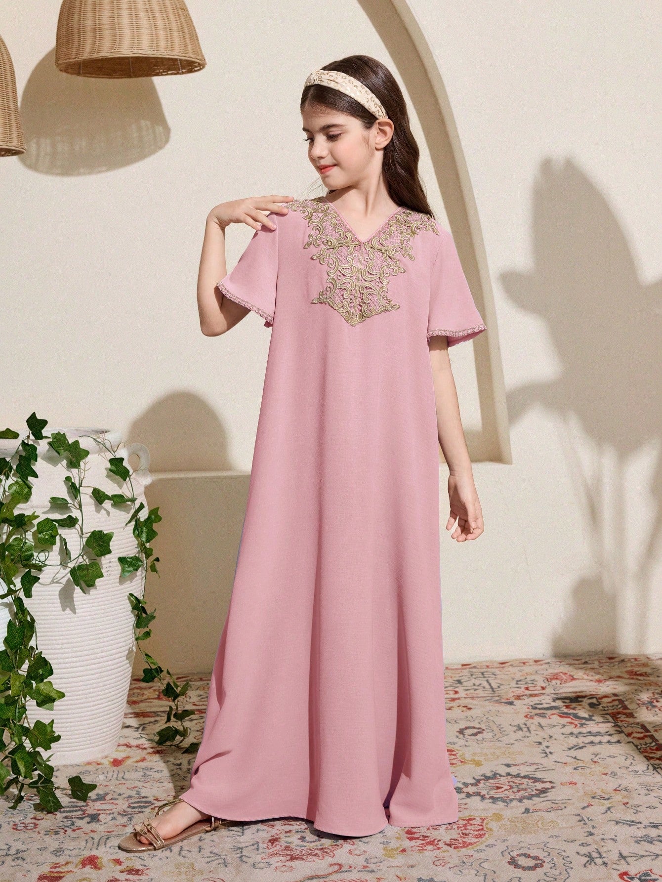 SHEIN Tween Girl Plain V-Neck Short Sleeve Dress