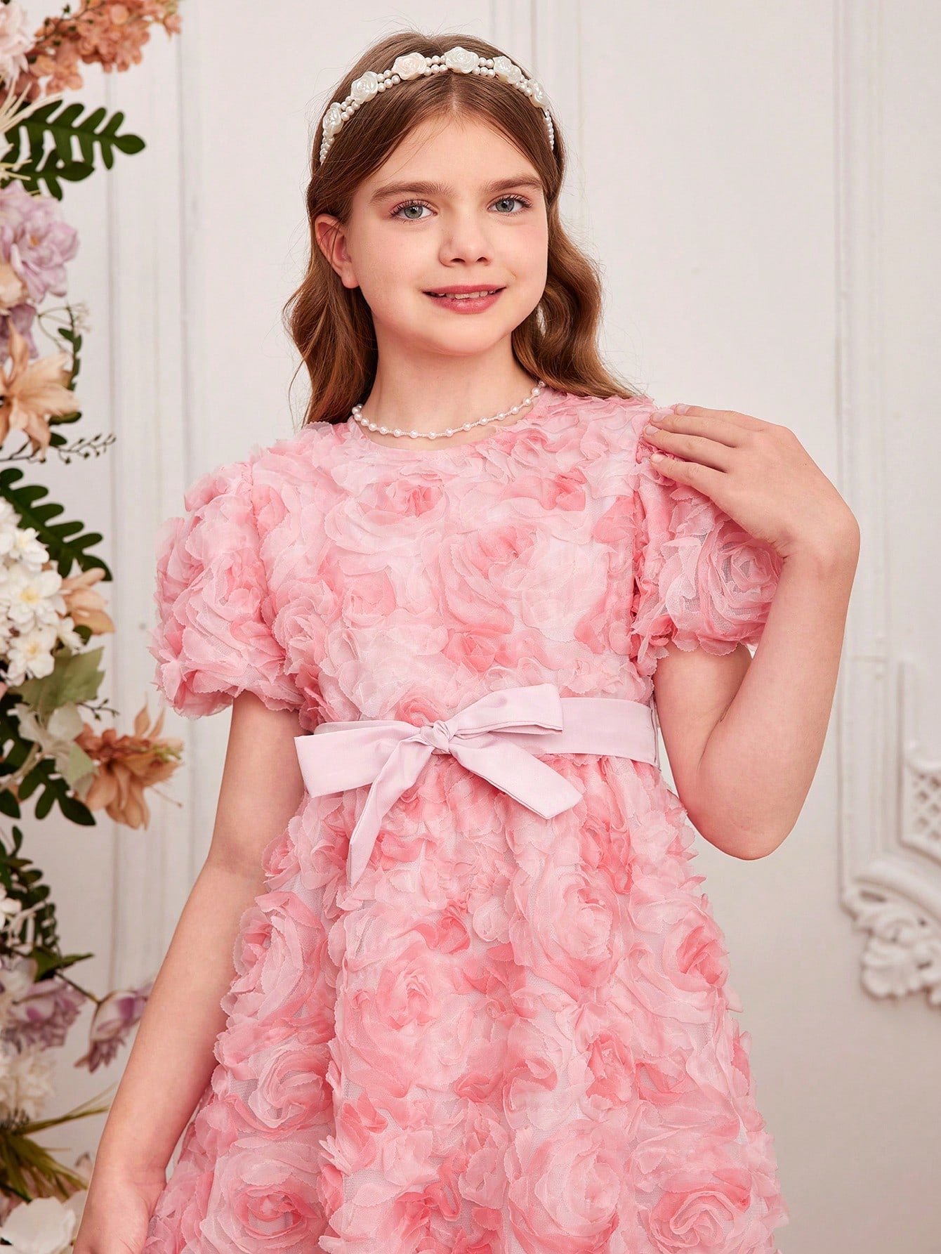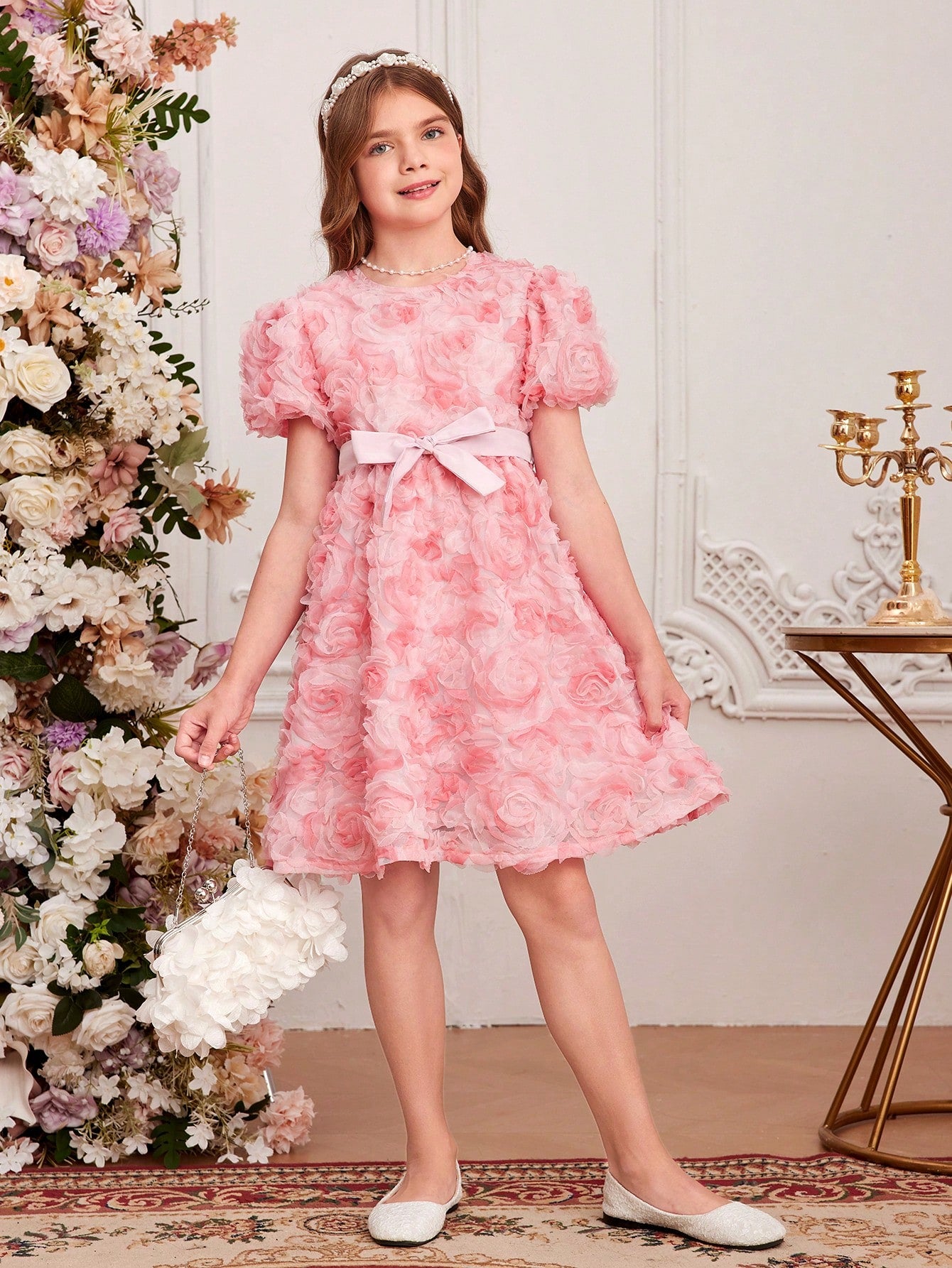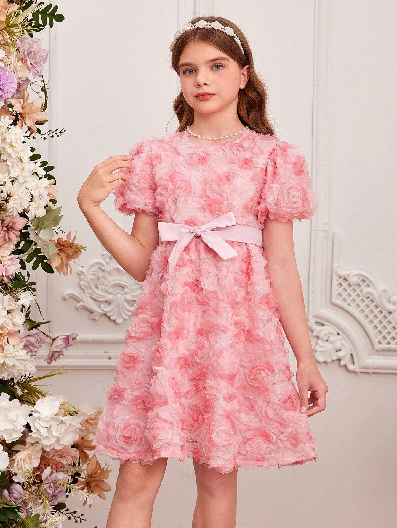 kids SHEIN Tween Girl's Gorgeous & Bubble Sleeve Floral Embroidered Dress With Waist Belt