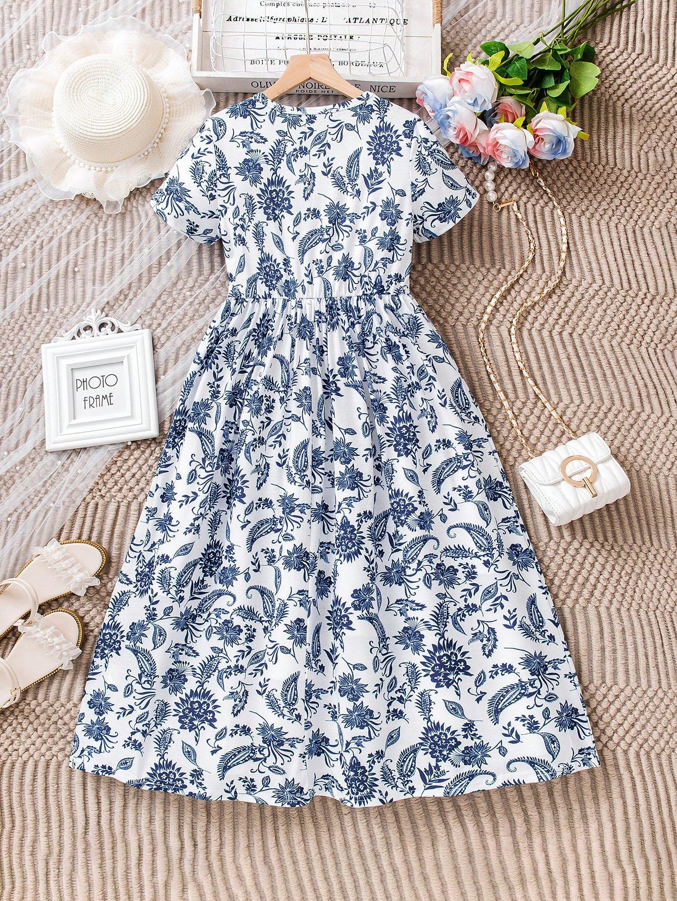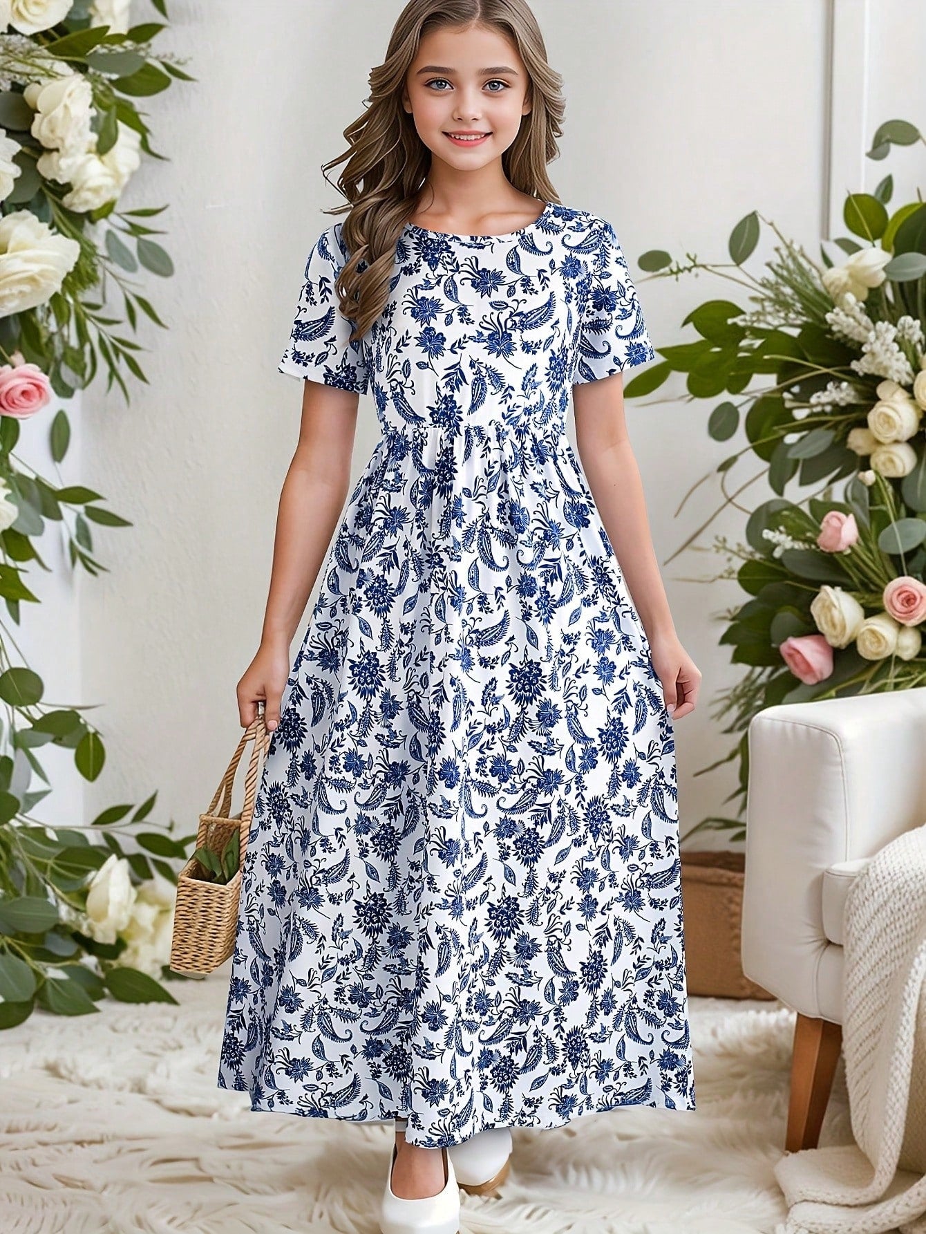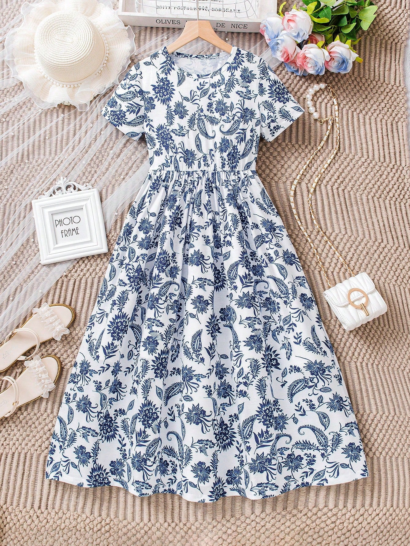 Summer Floral Print Round Neck Short Sleeve Casual Dress For Tween Girls