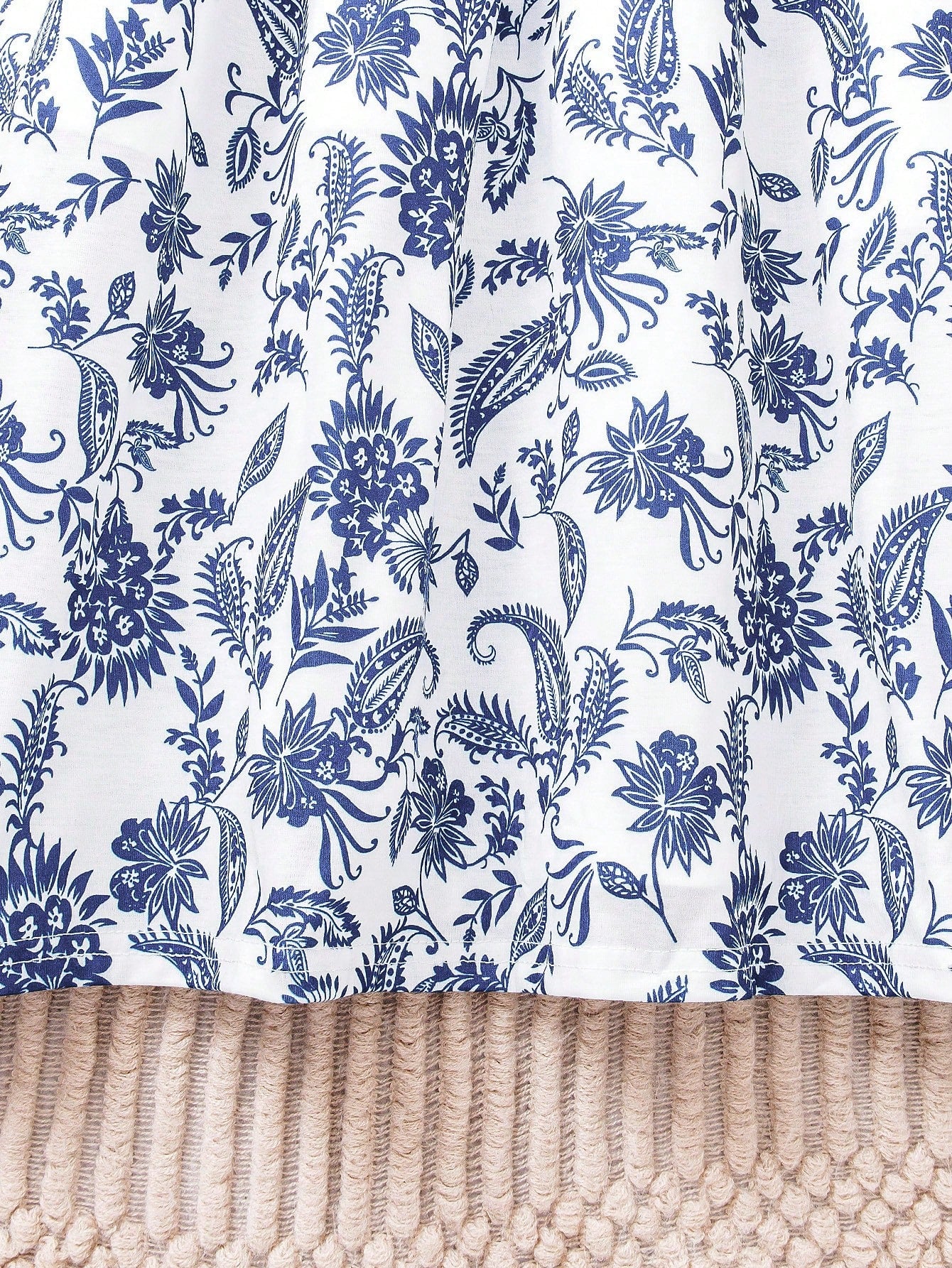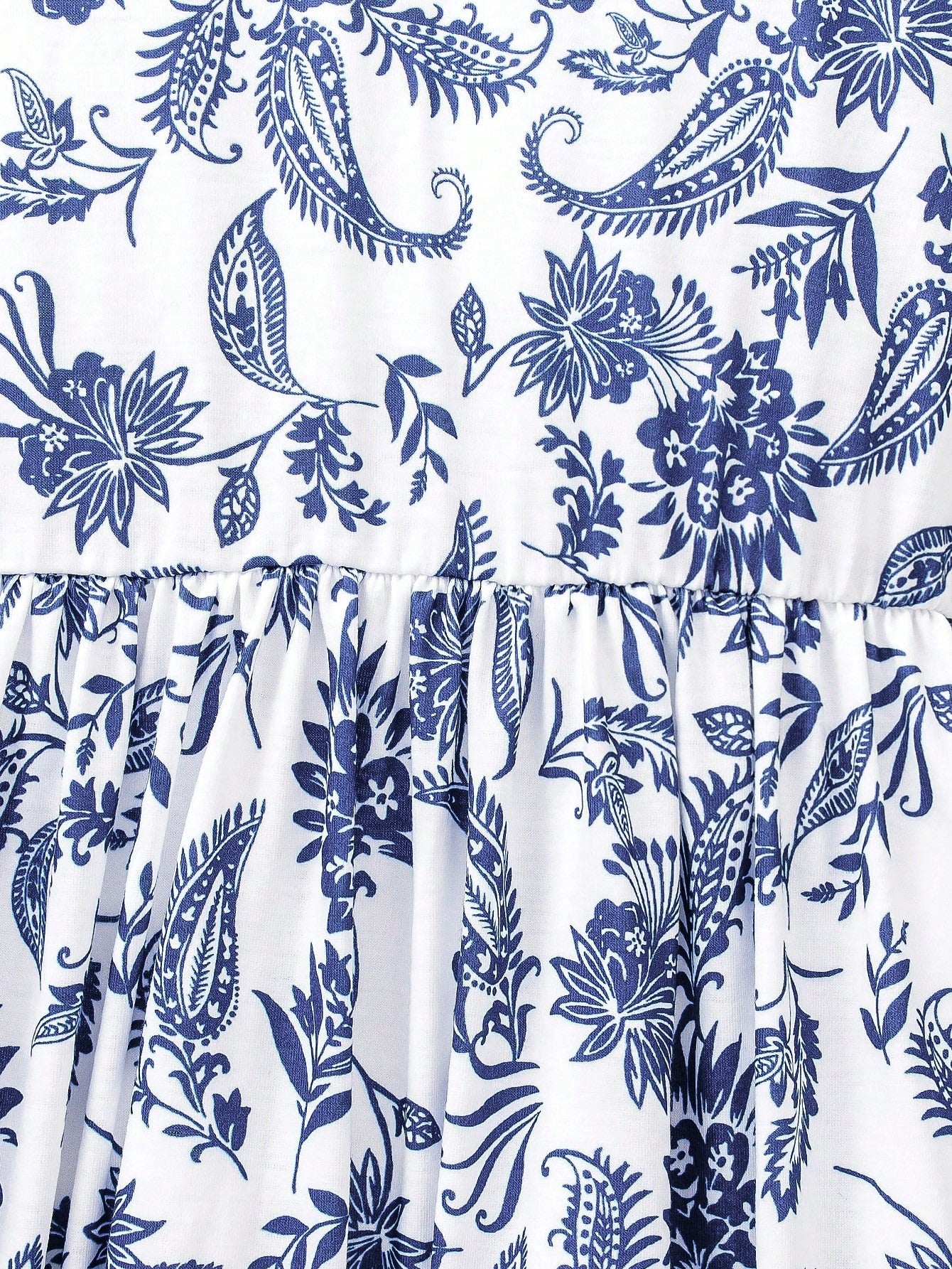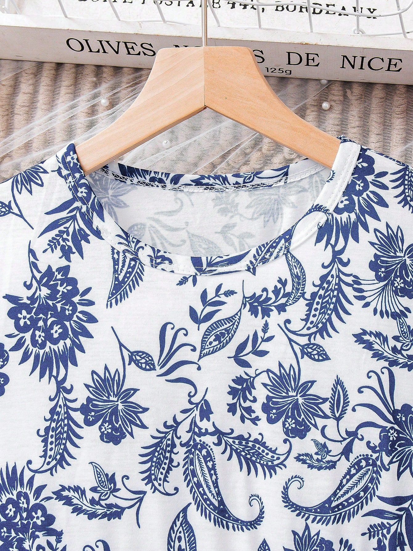 Summer Floral Print Round Neck Short Sleeve Casual Dress For Tween Girls