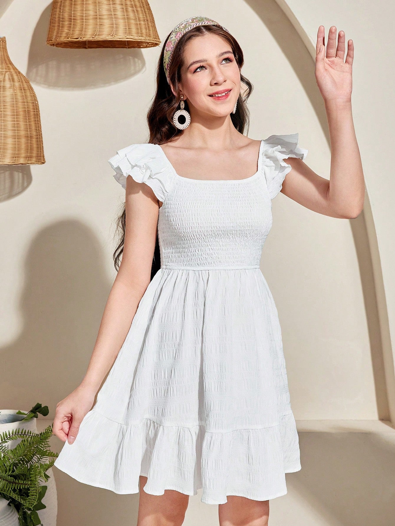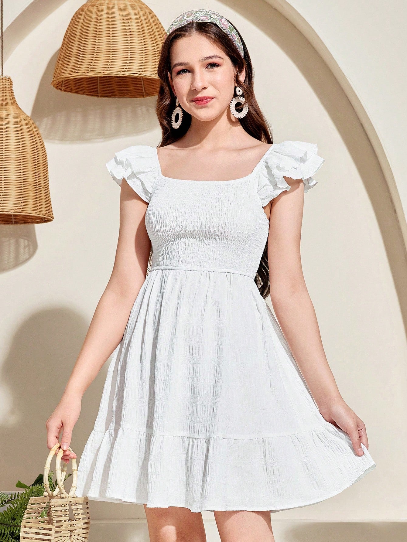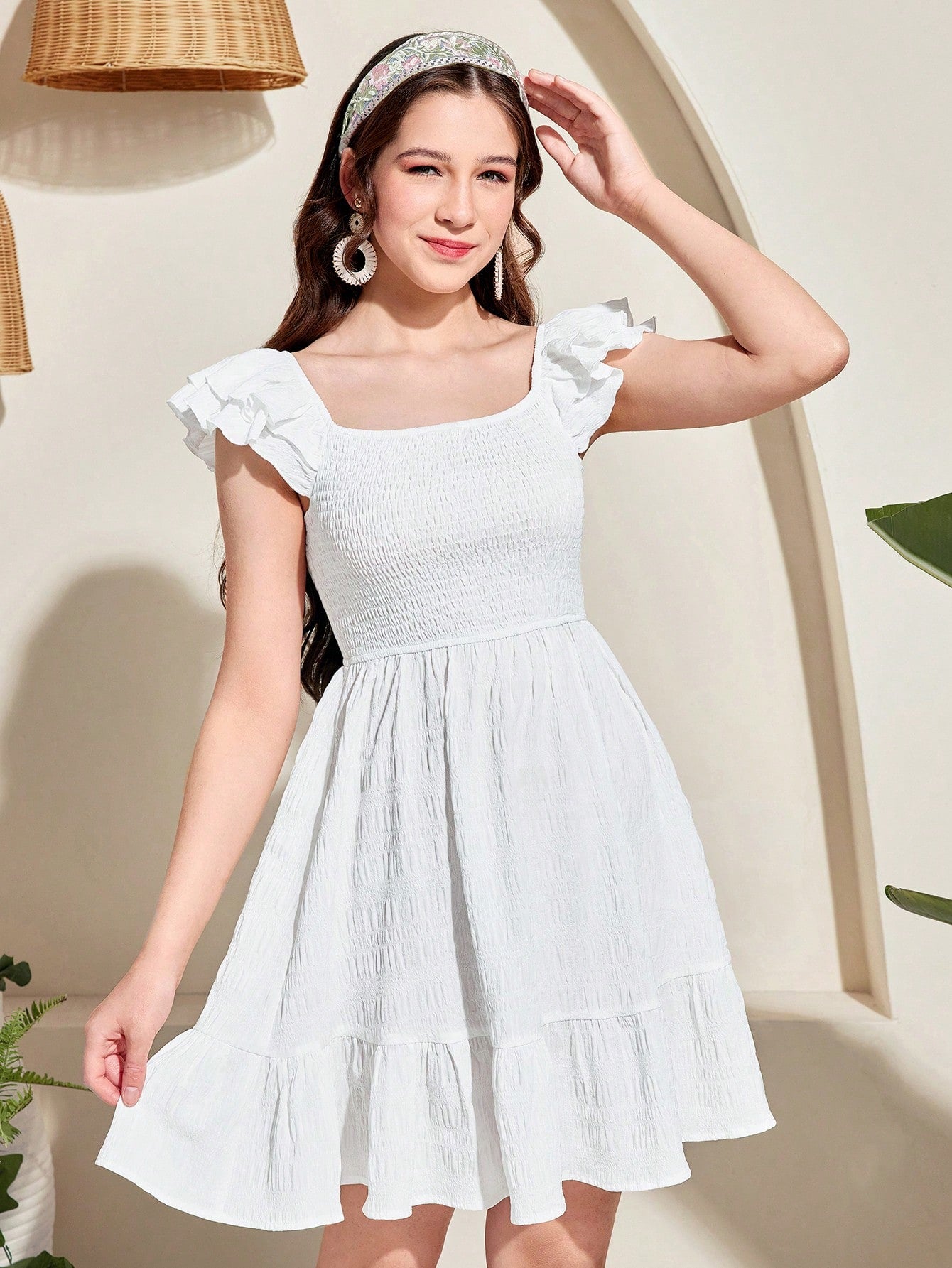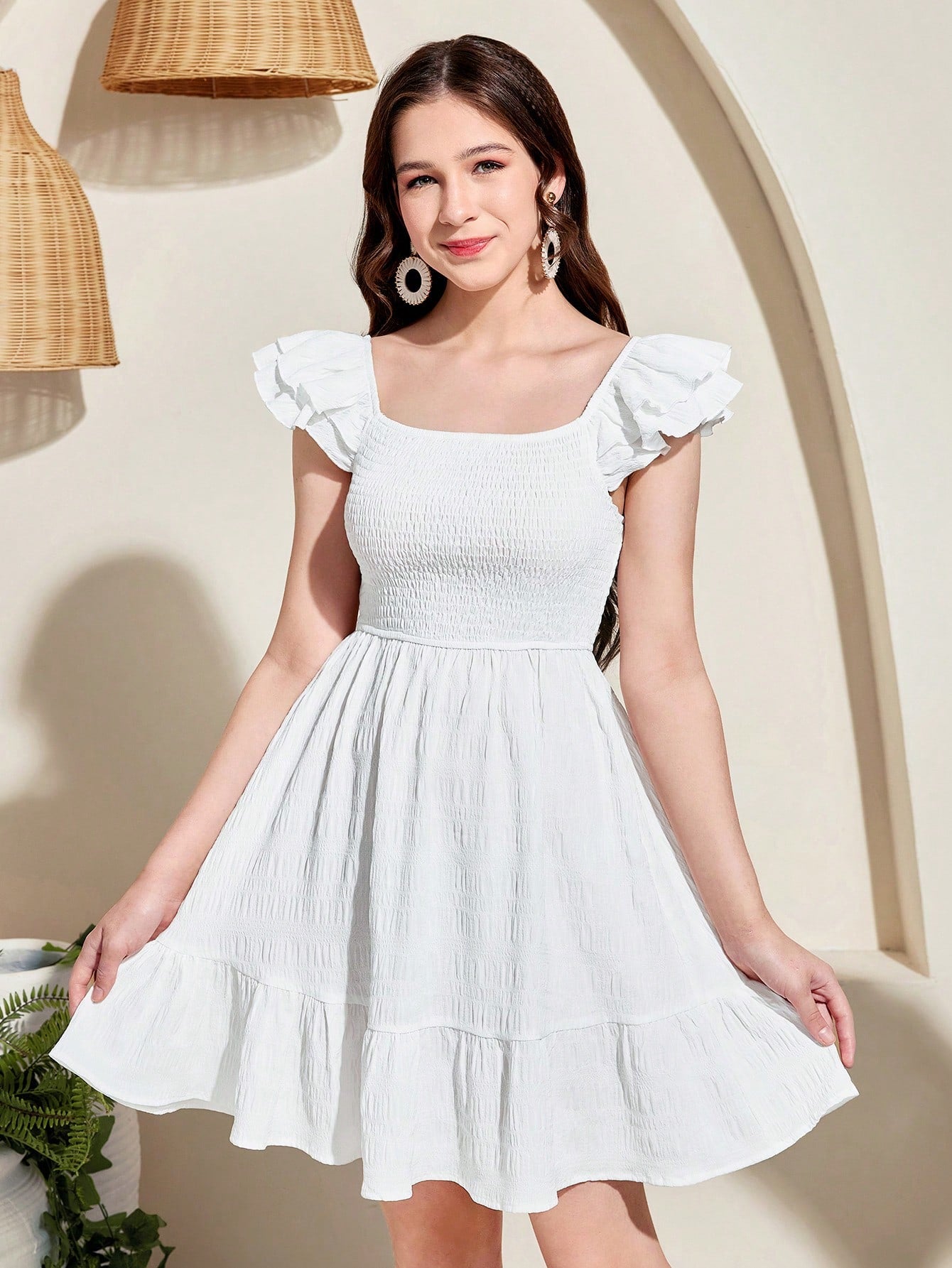 Teen Girls' Woven Cap Sleeve Square Neck Shirred Waist Vacation Casual Dress Holidayآ Outfits