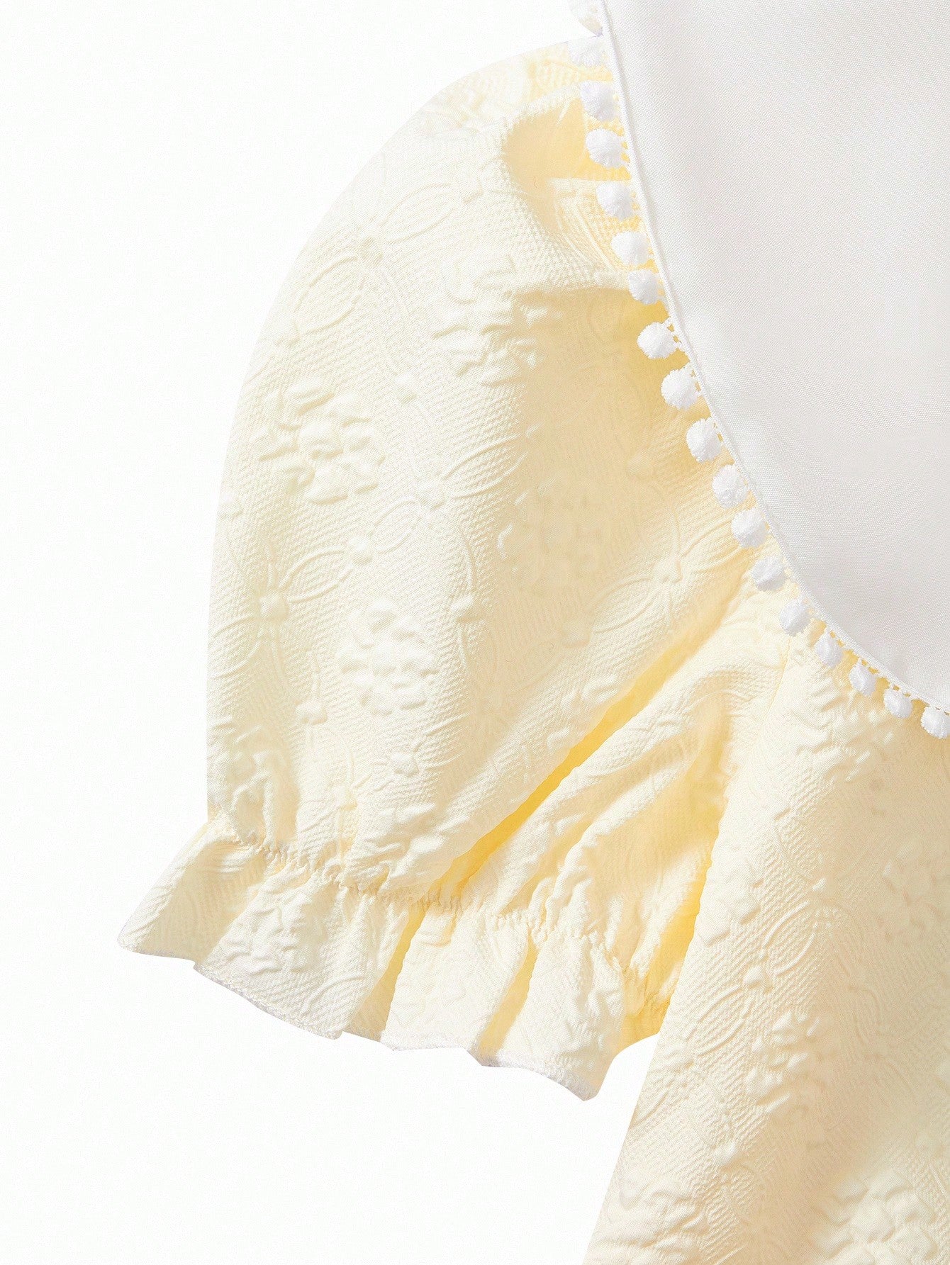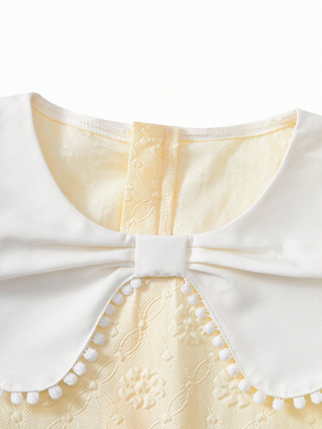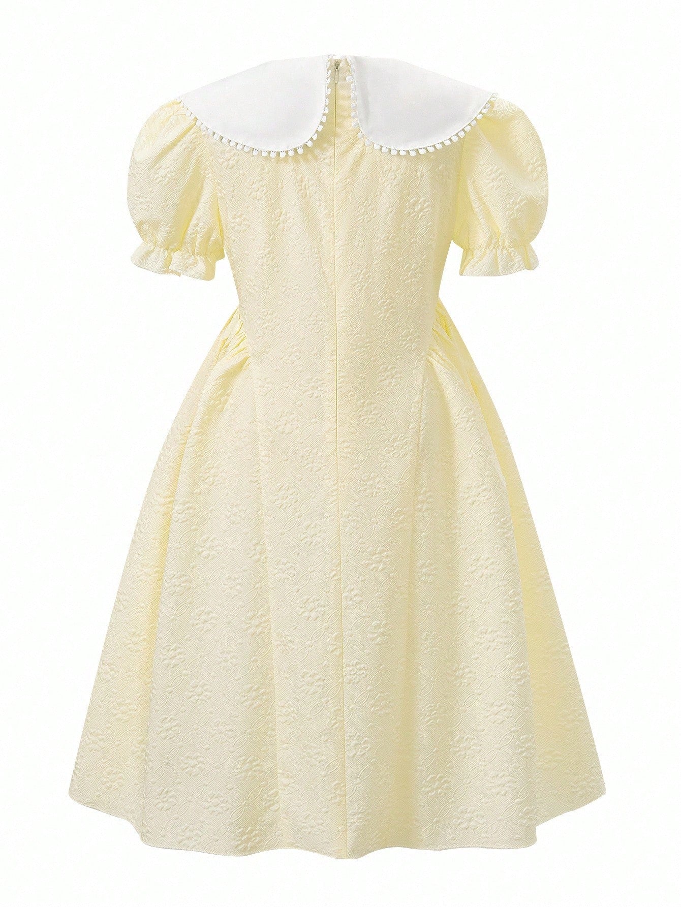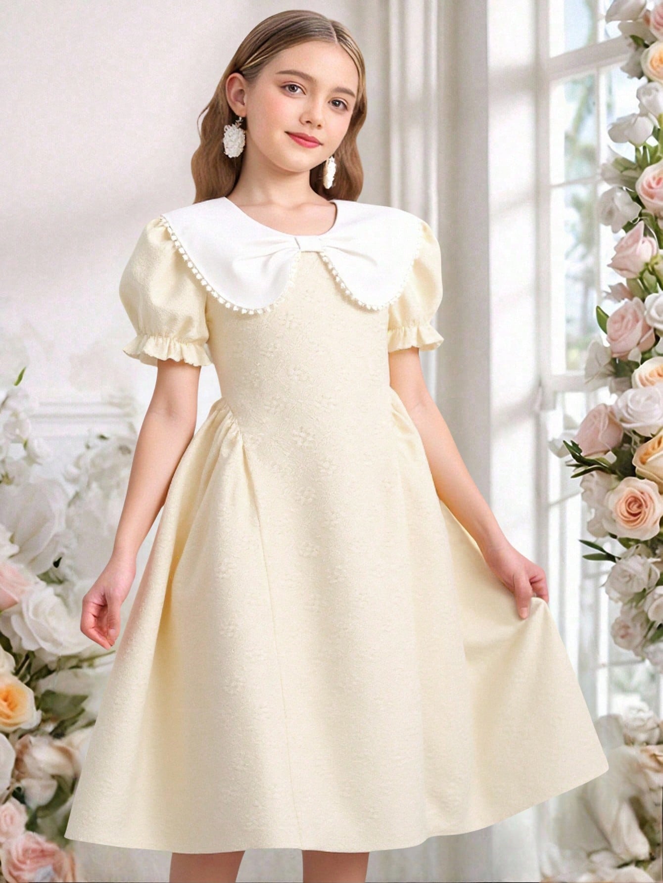 Tween Girl Elegant Casual Vacation Dress, Ruffled Collar Puff Sleeve Bow Blue Dress, Suitable For Spring/Summer
