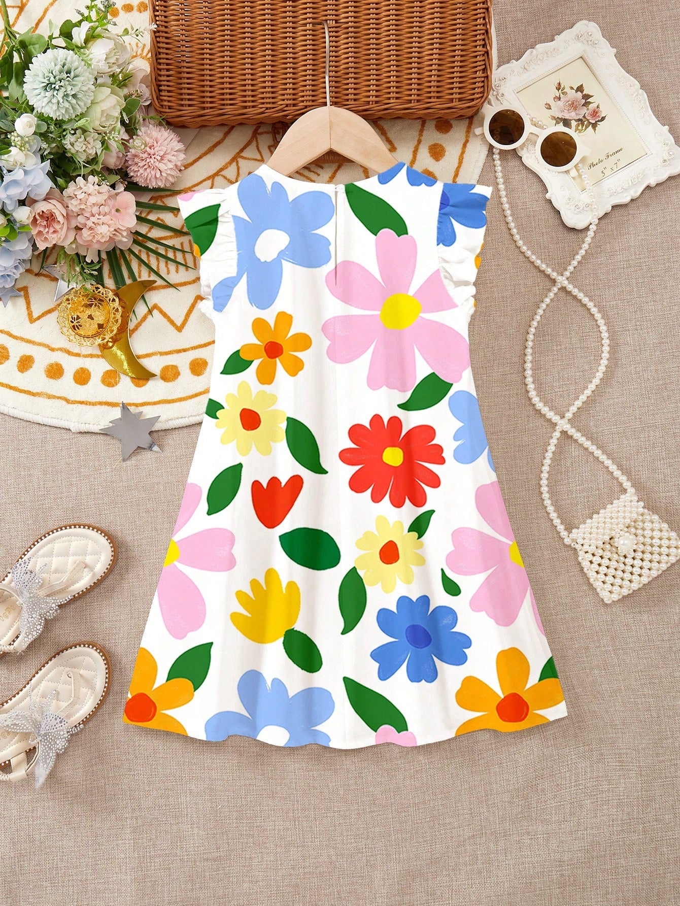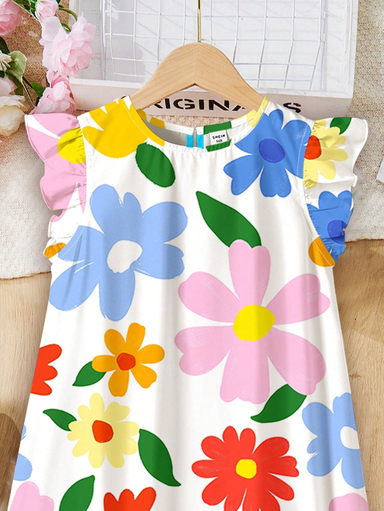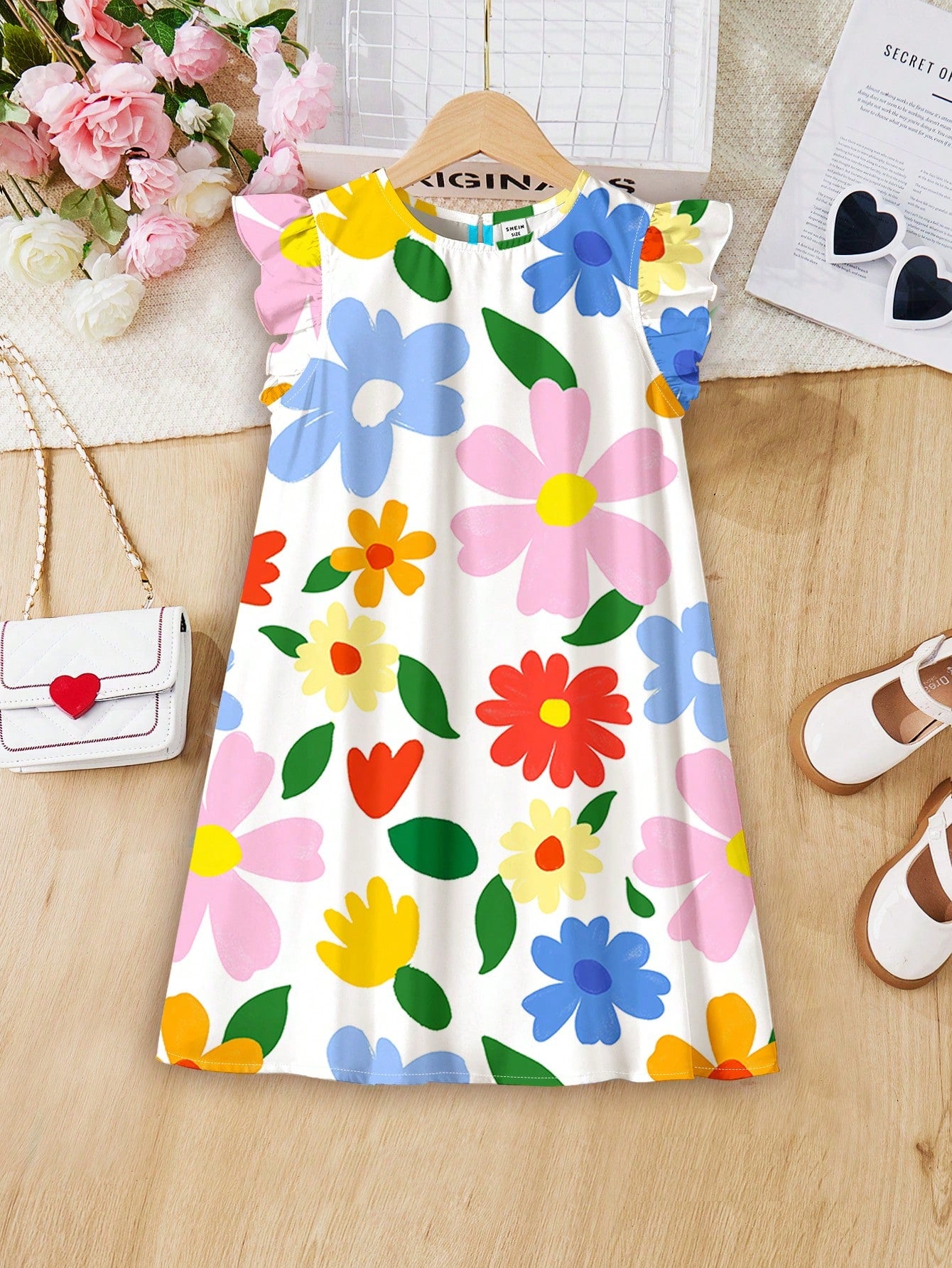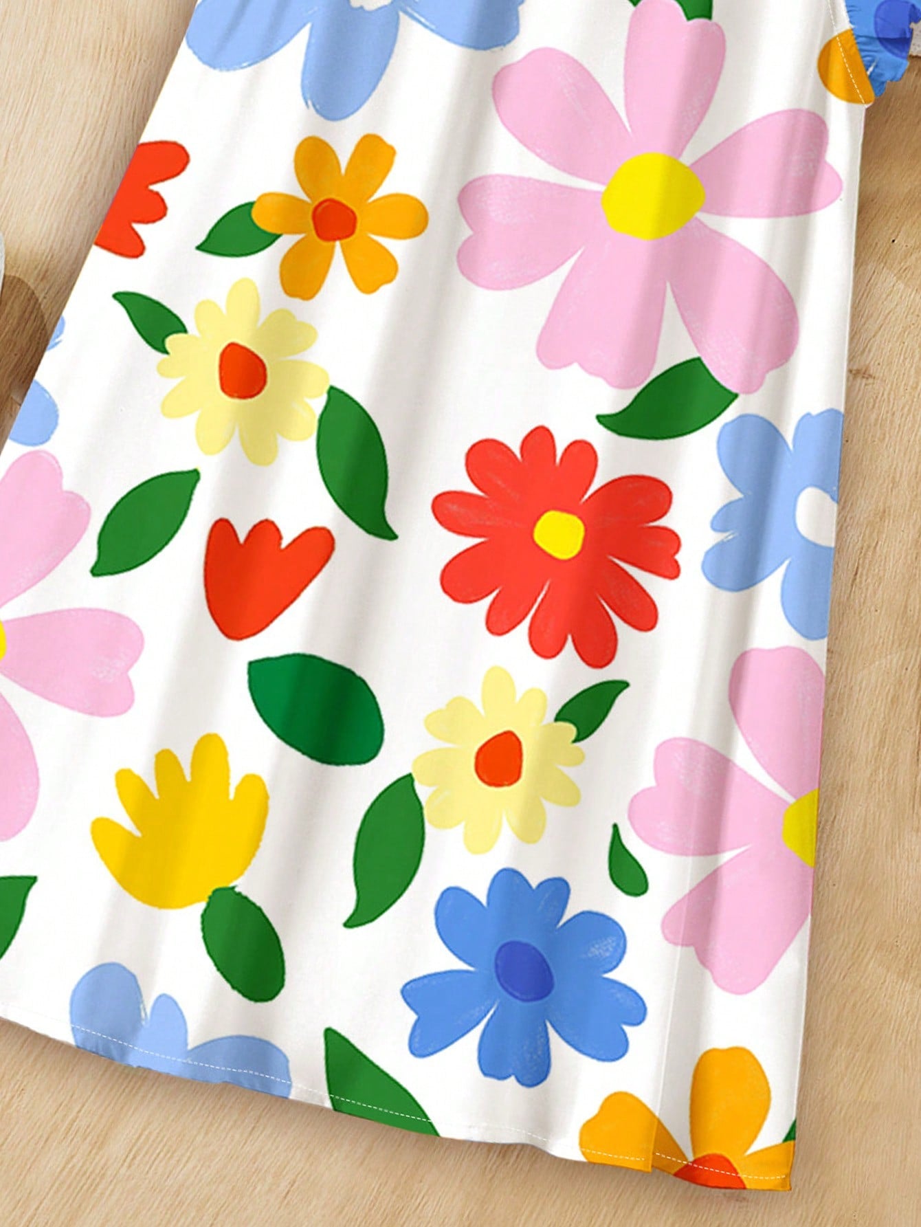 Tween Girls Casual Minimalist Cartoon Flower Pattern Ruffle Sleeve A-Line Dress, Suitable For Spring