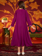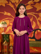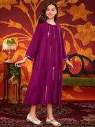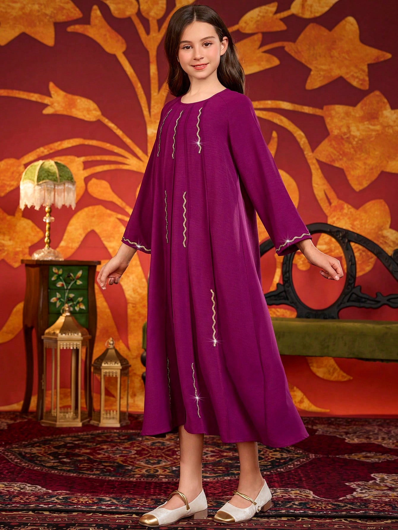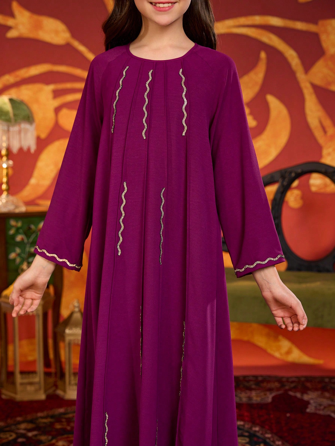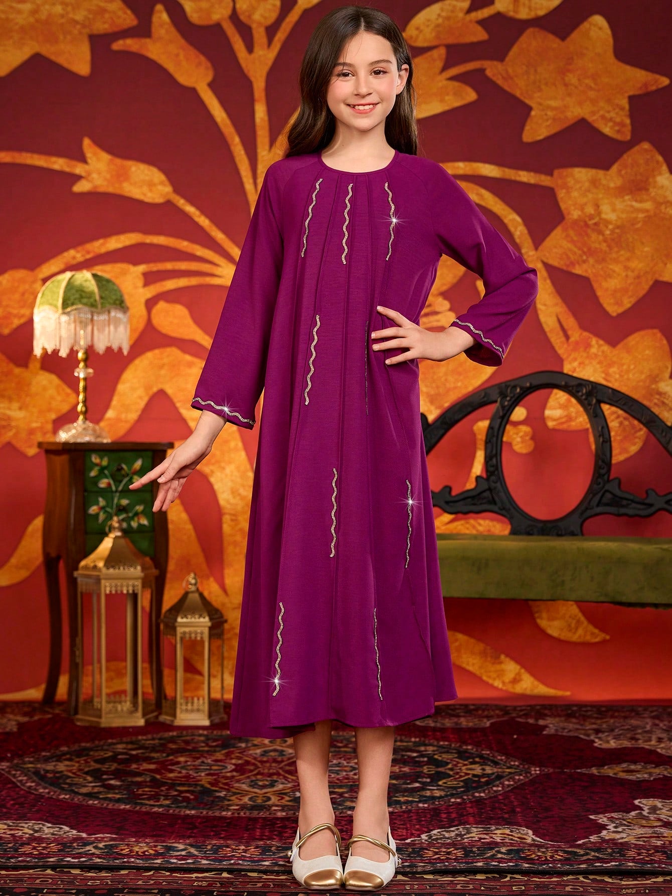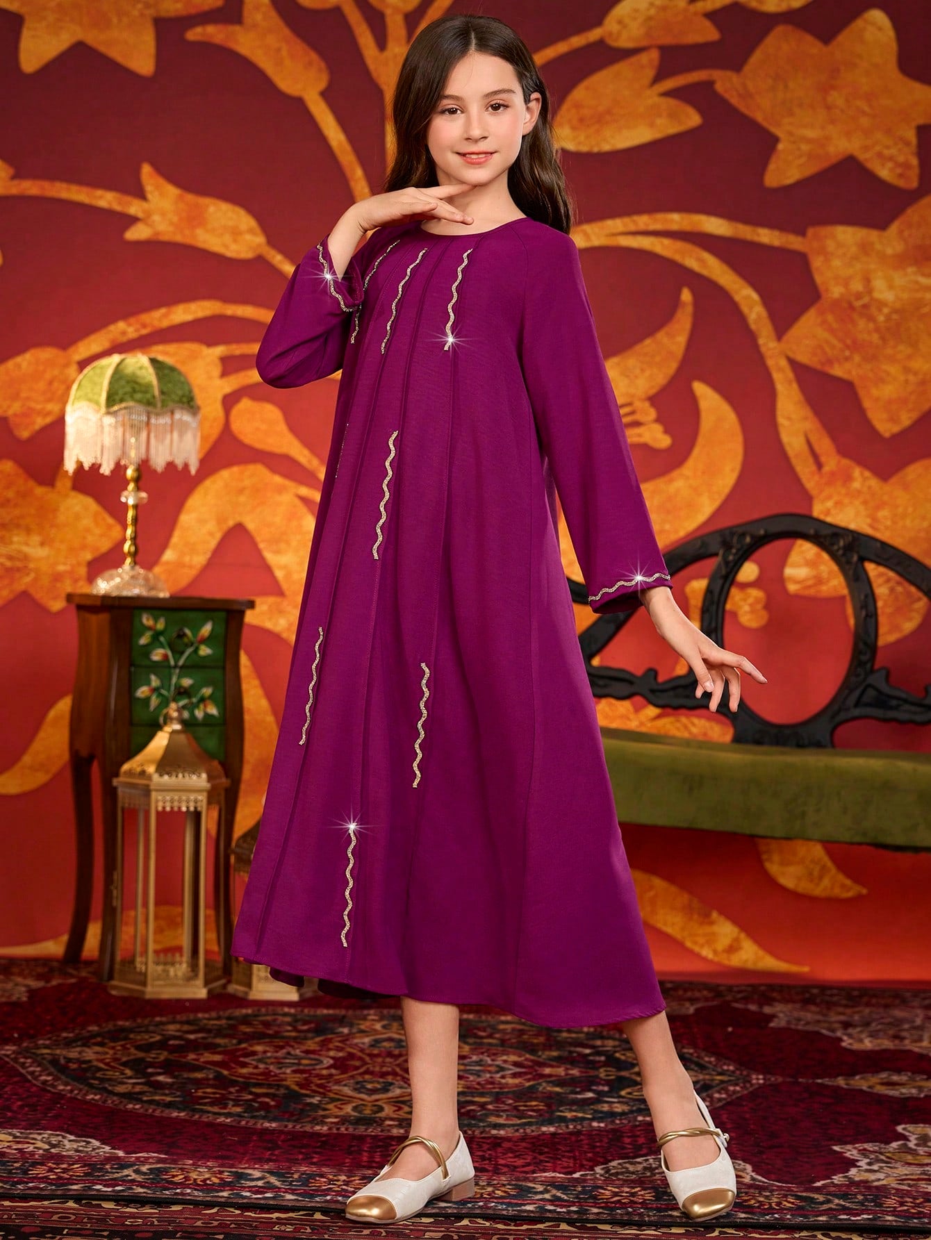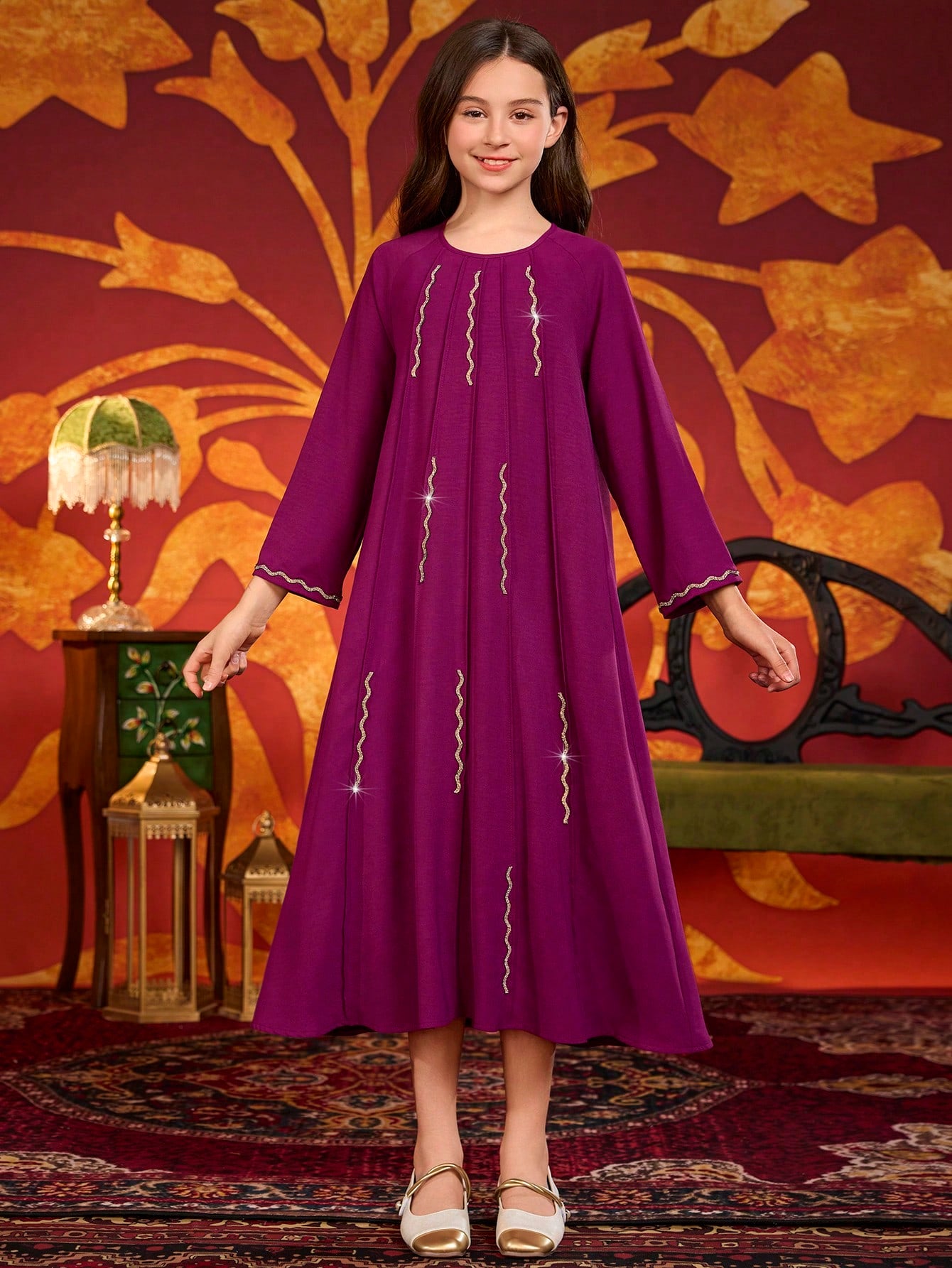 Fashion Loose Fitting Long Sleeve Tie Waist Dress With Pearl Trim For Tween Girl