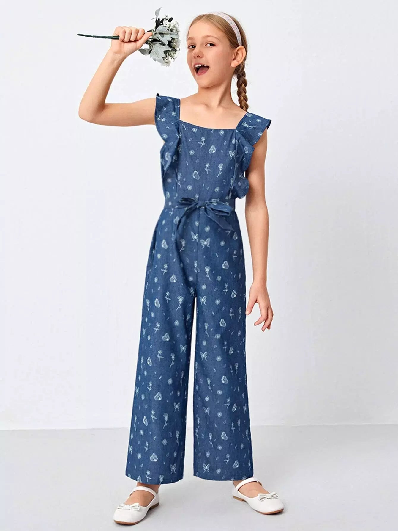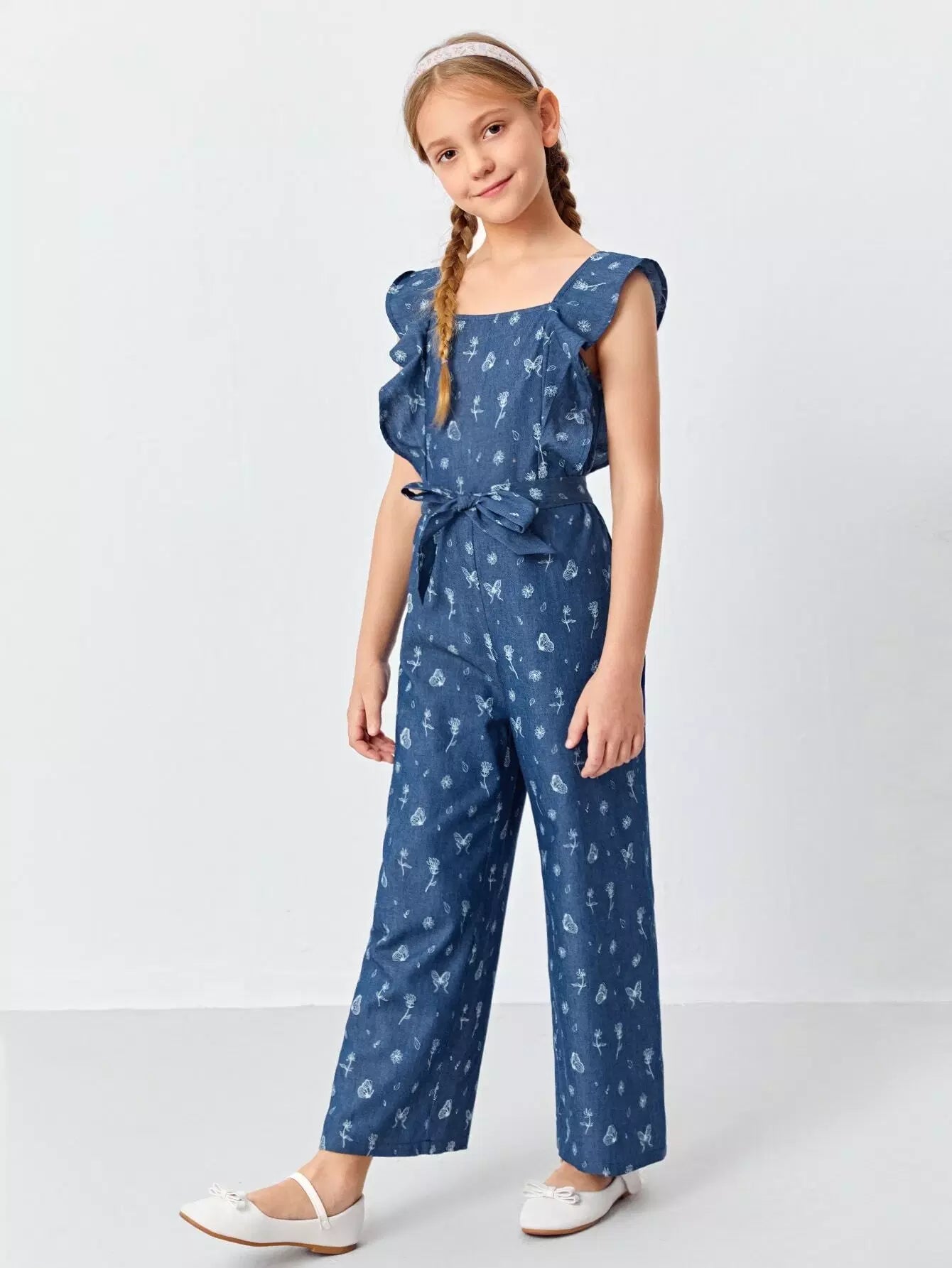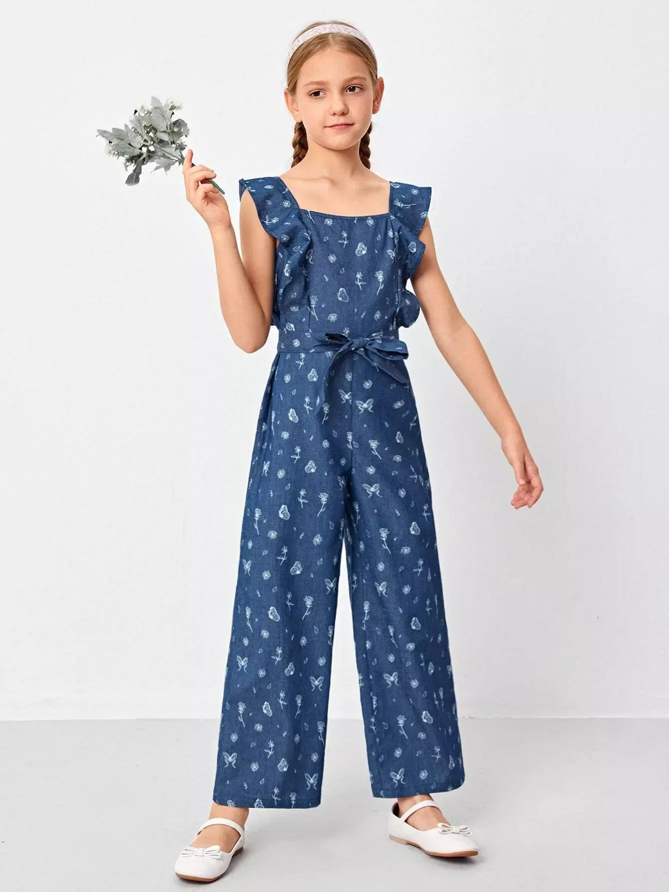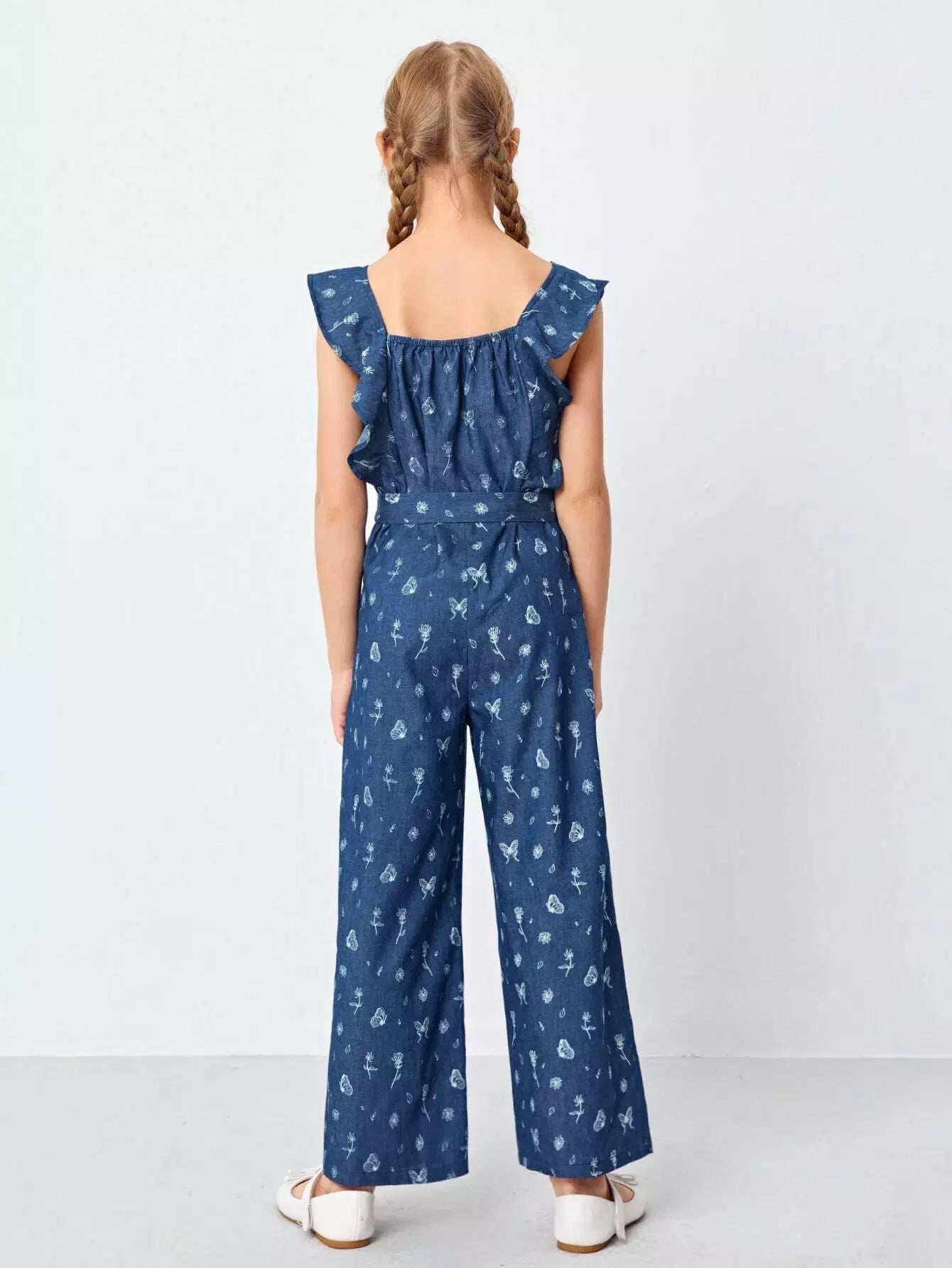 Girls Butterfly & Floral Print Ruffle Armhole Palazzo Jumpsuit Without Belt