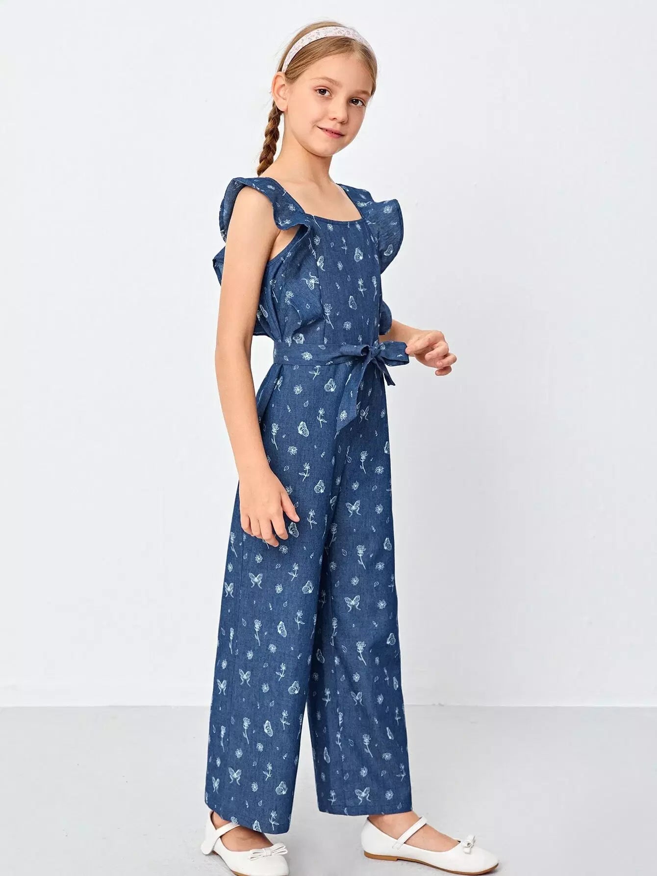 Kids - Girls Butterfly & Floral Print Ruffle Armhole Belted Palazzo Jumpsuit