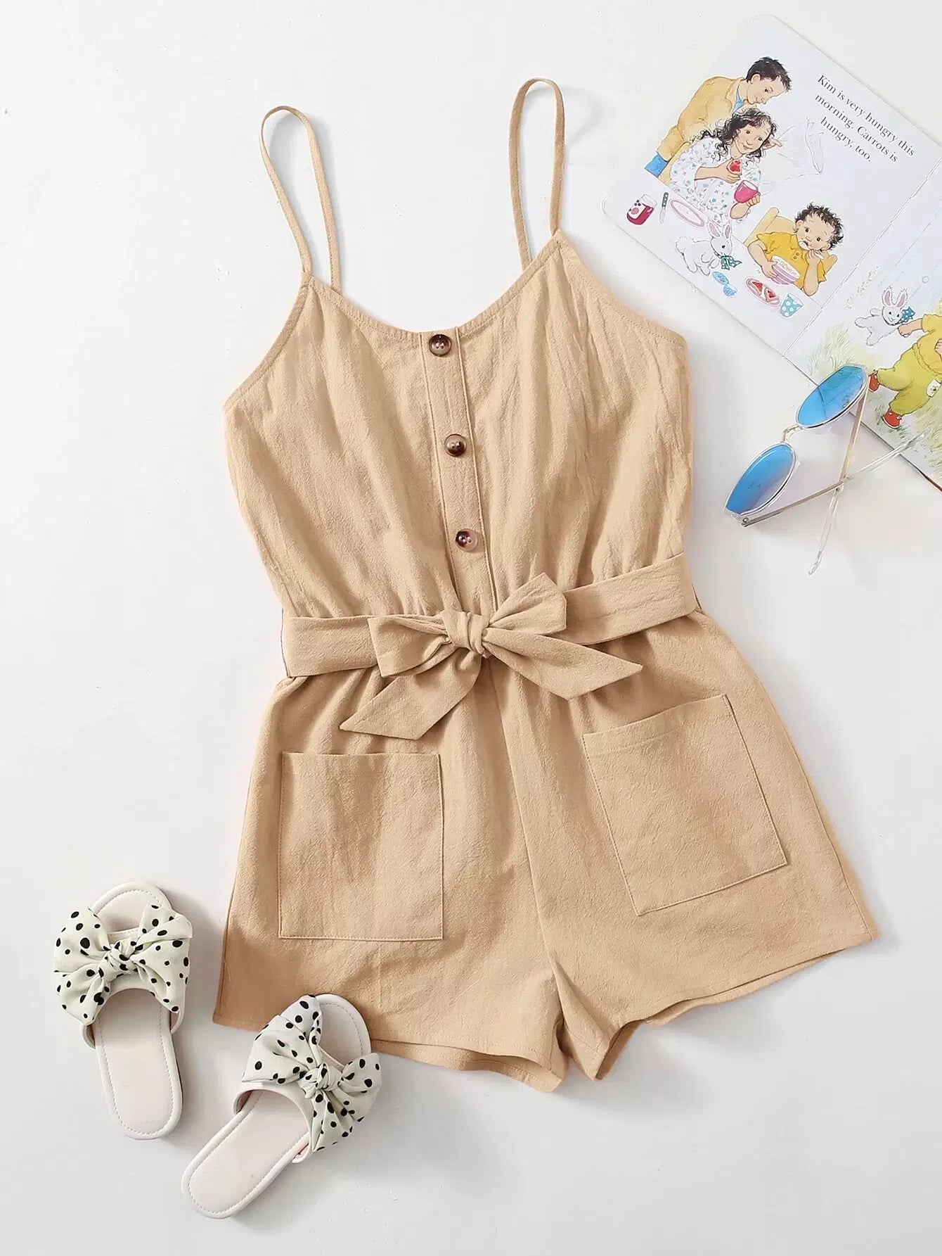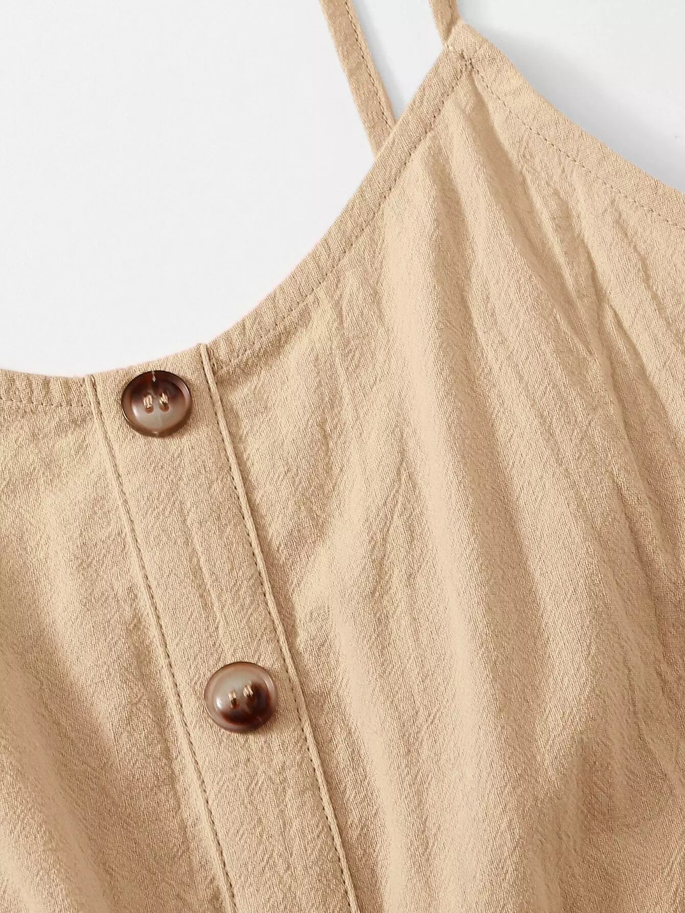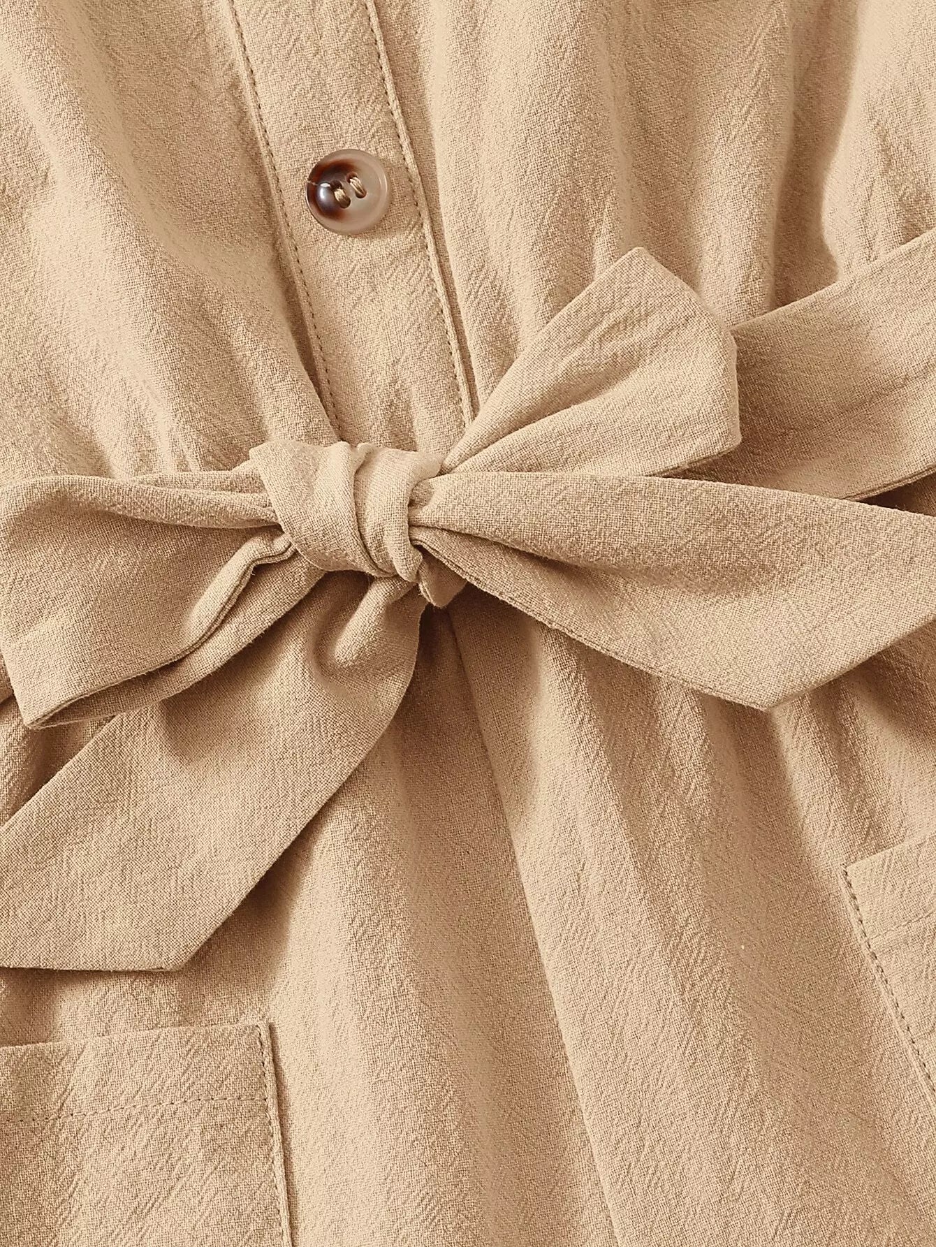 Girls Buttoned Front Self Pocket Patched Romper Without Belt