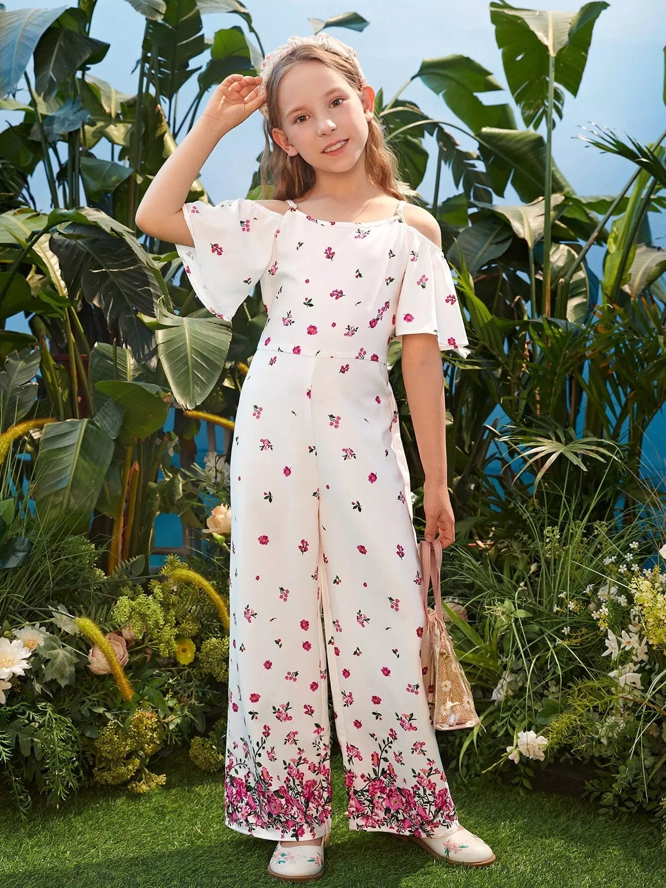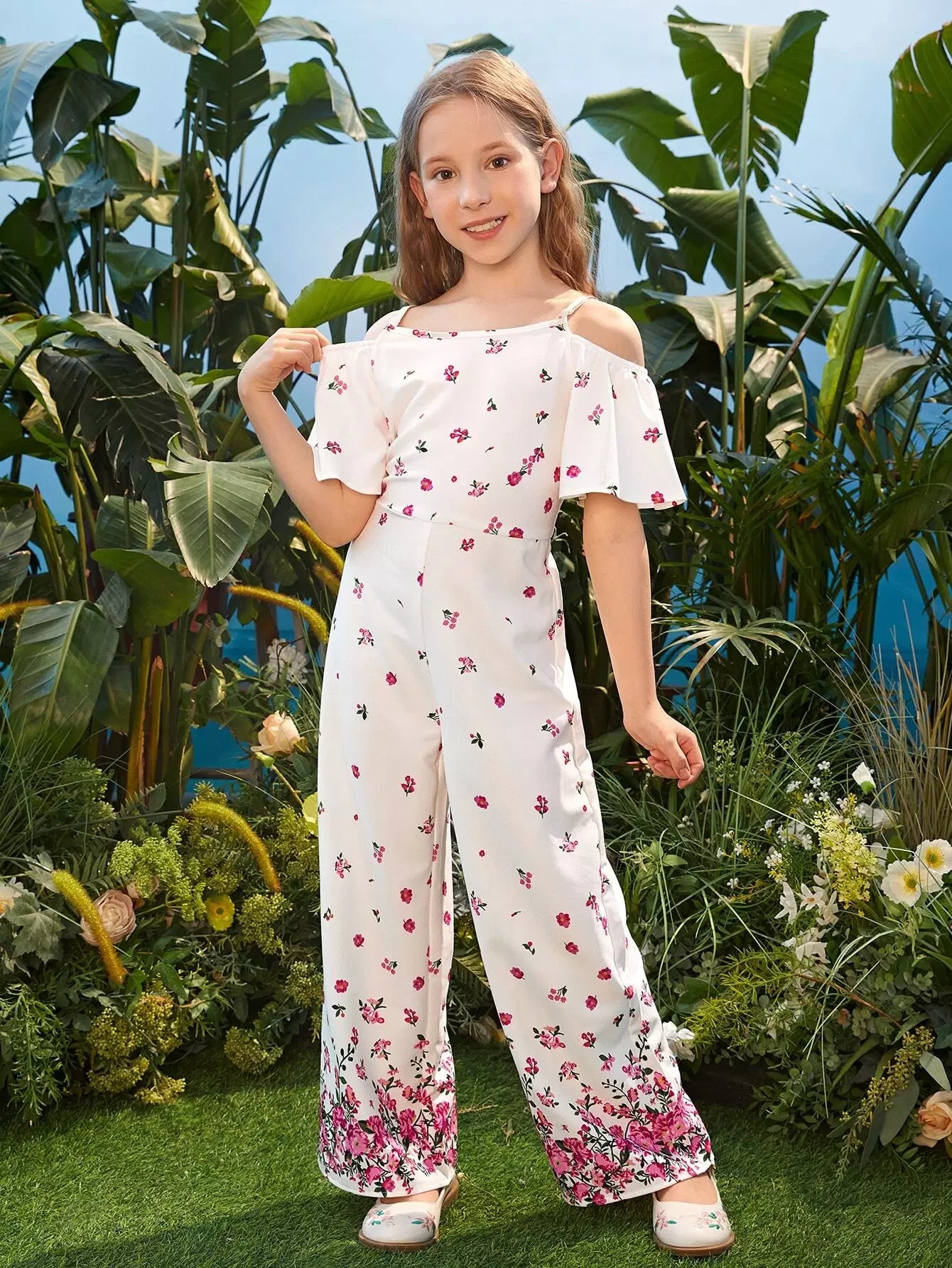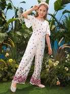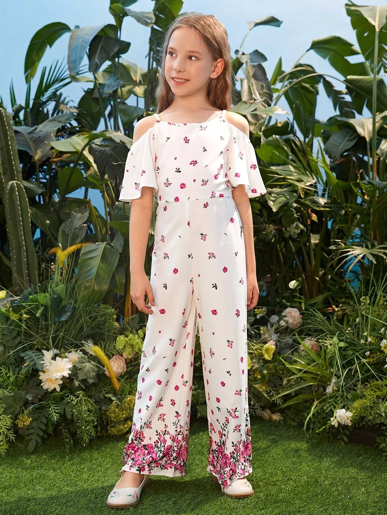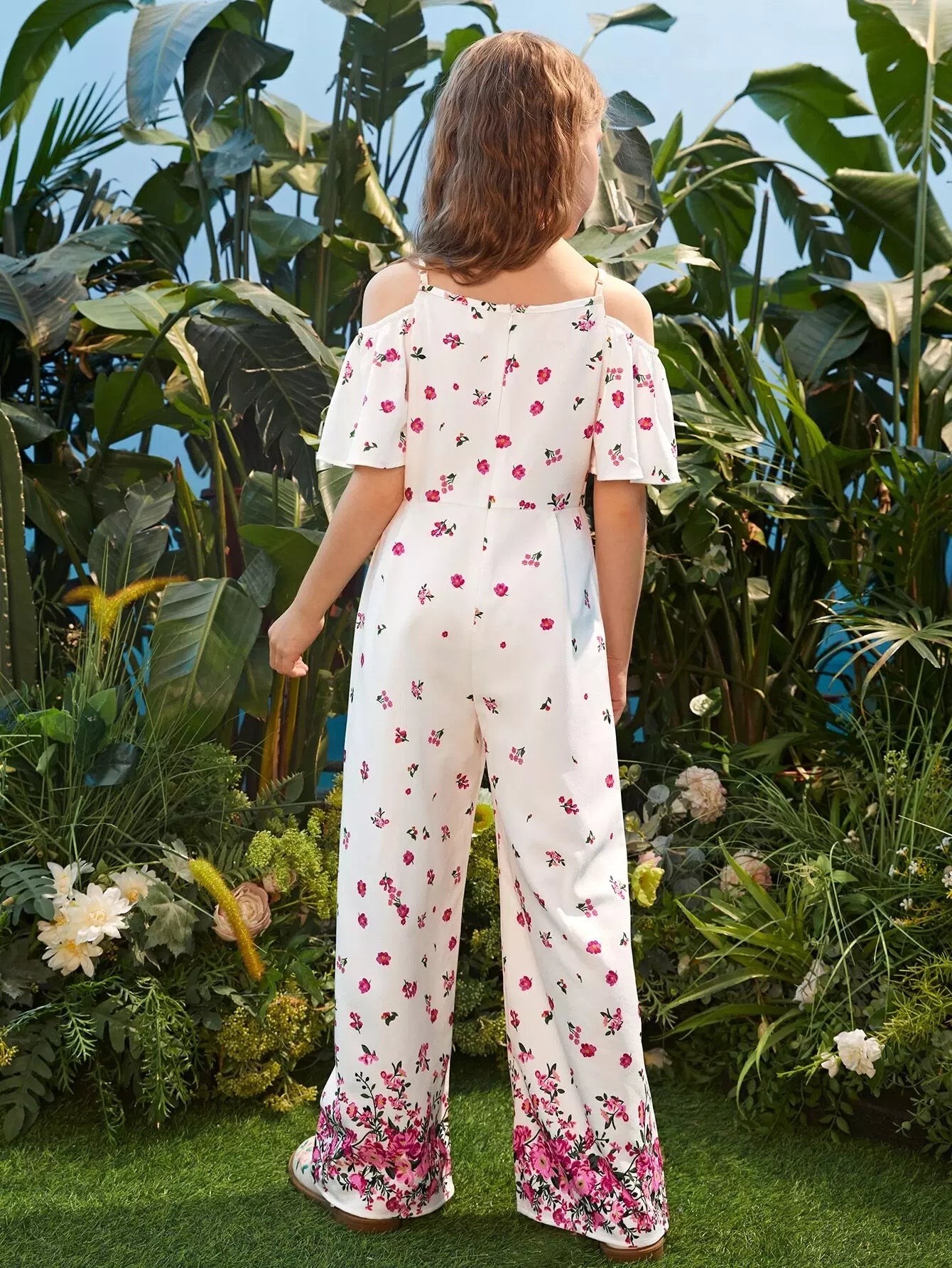 Girls Floral Print Cold Shoulder Zip Back Jumpsuit