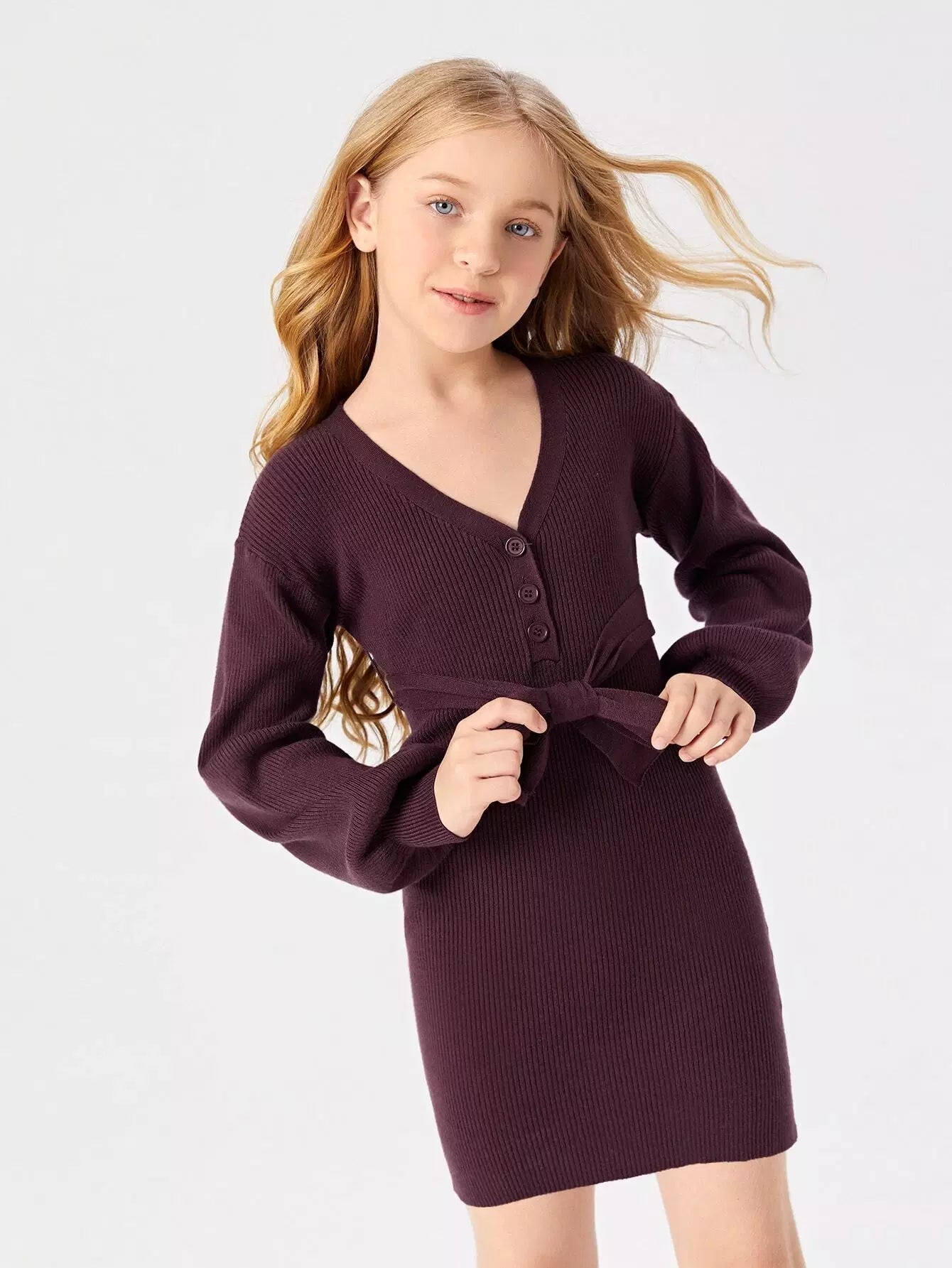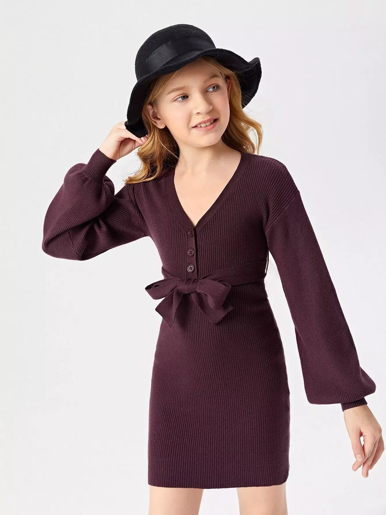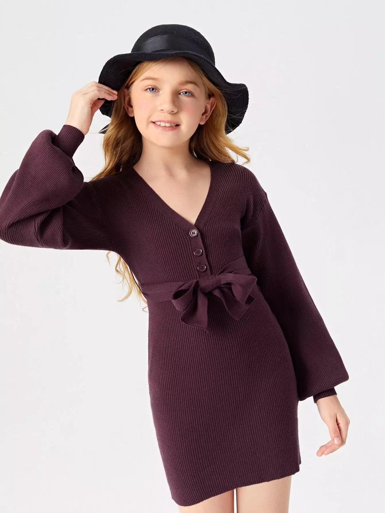 Girls V Neck Button Front Bishop Sleeve Sweater Dress Without Belt