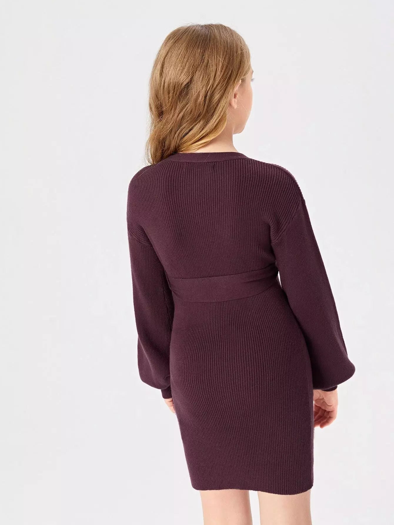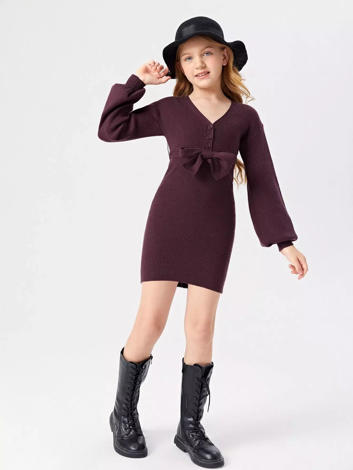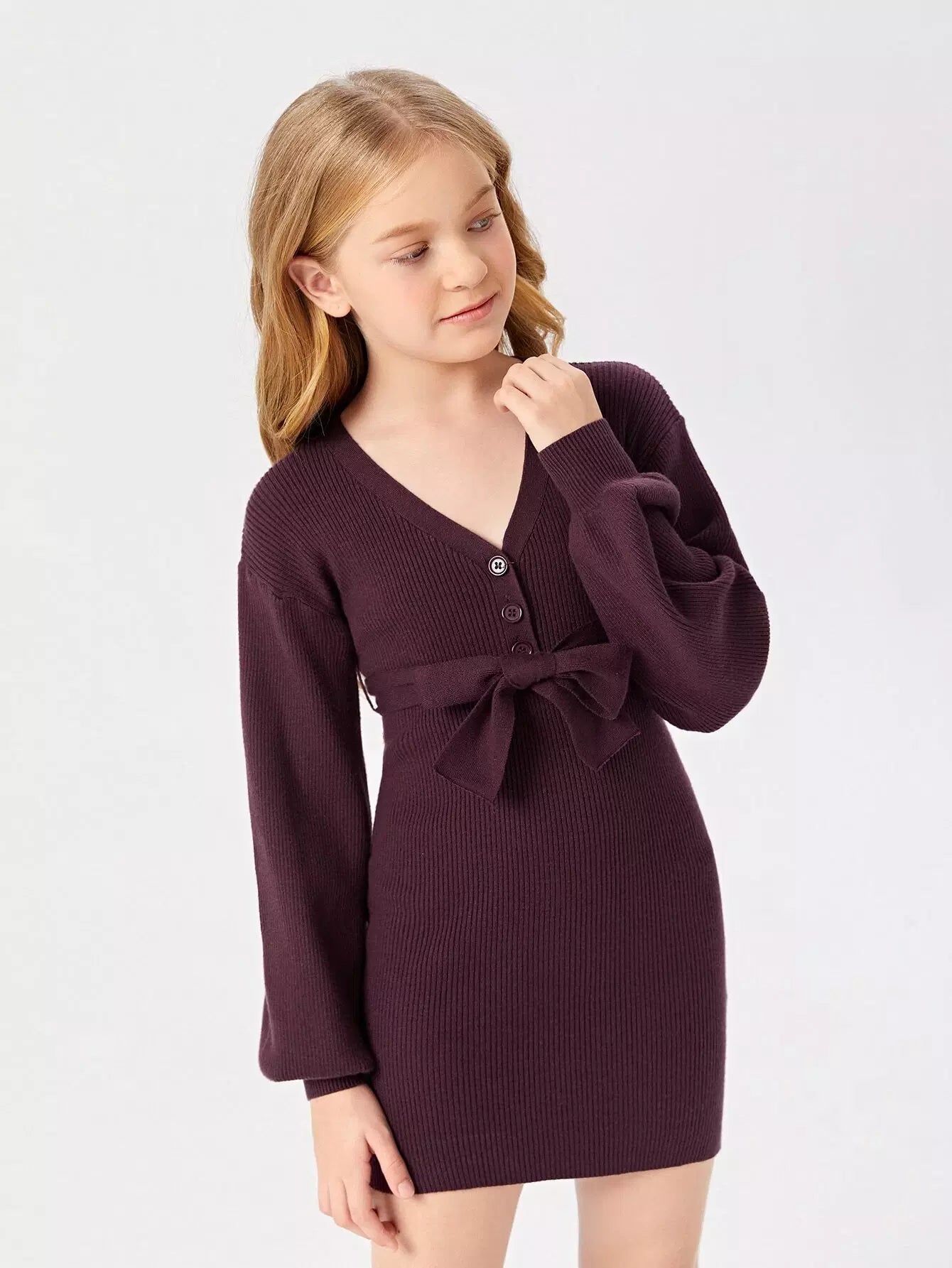 Girls V Neck Button Front Bishop Sleeve Sweater Dress Without Belt