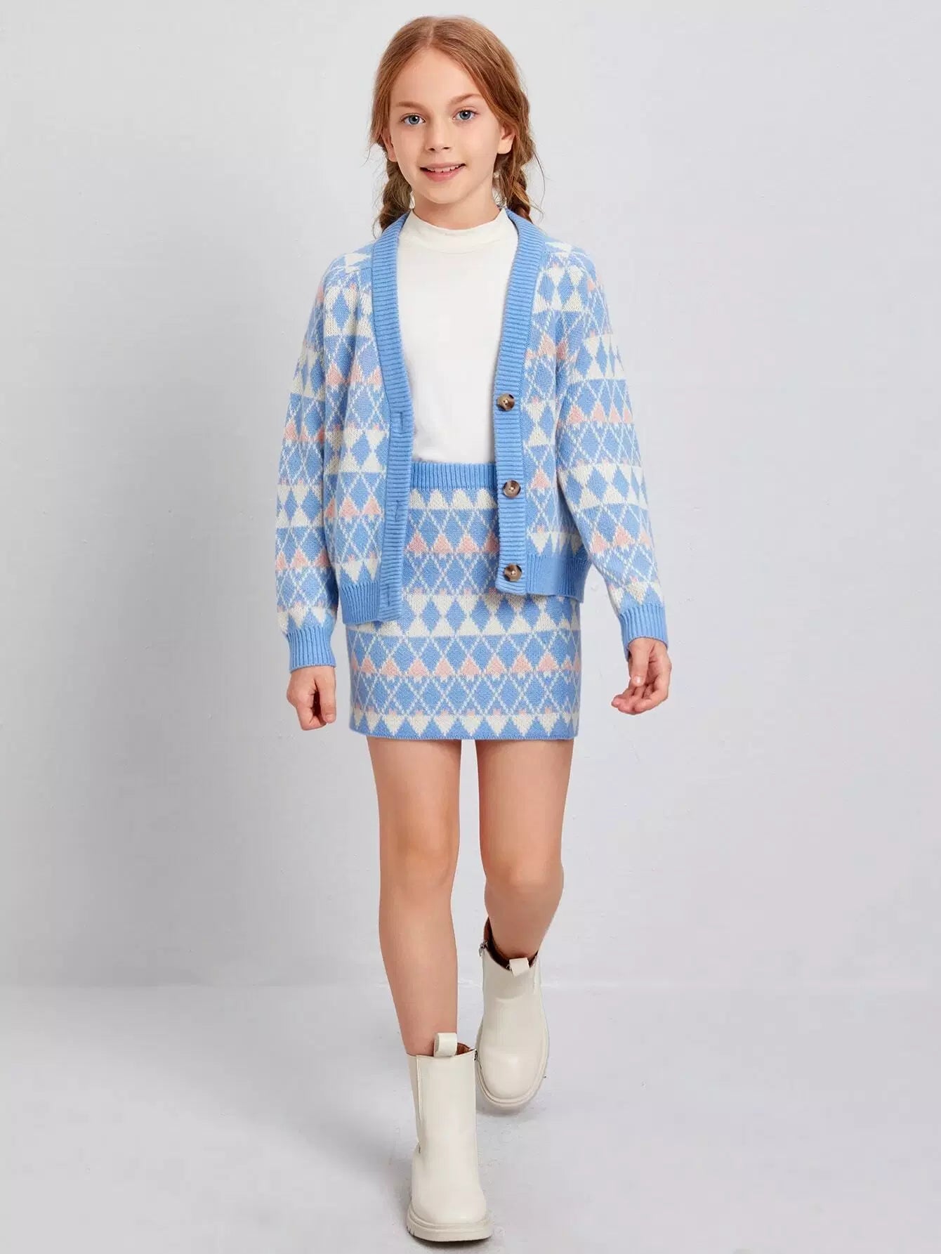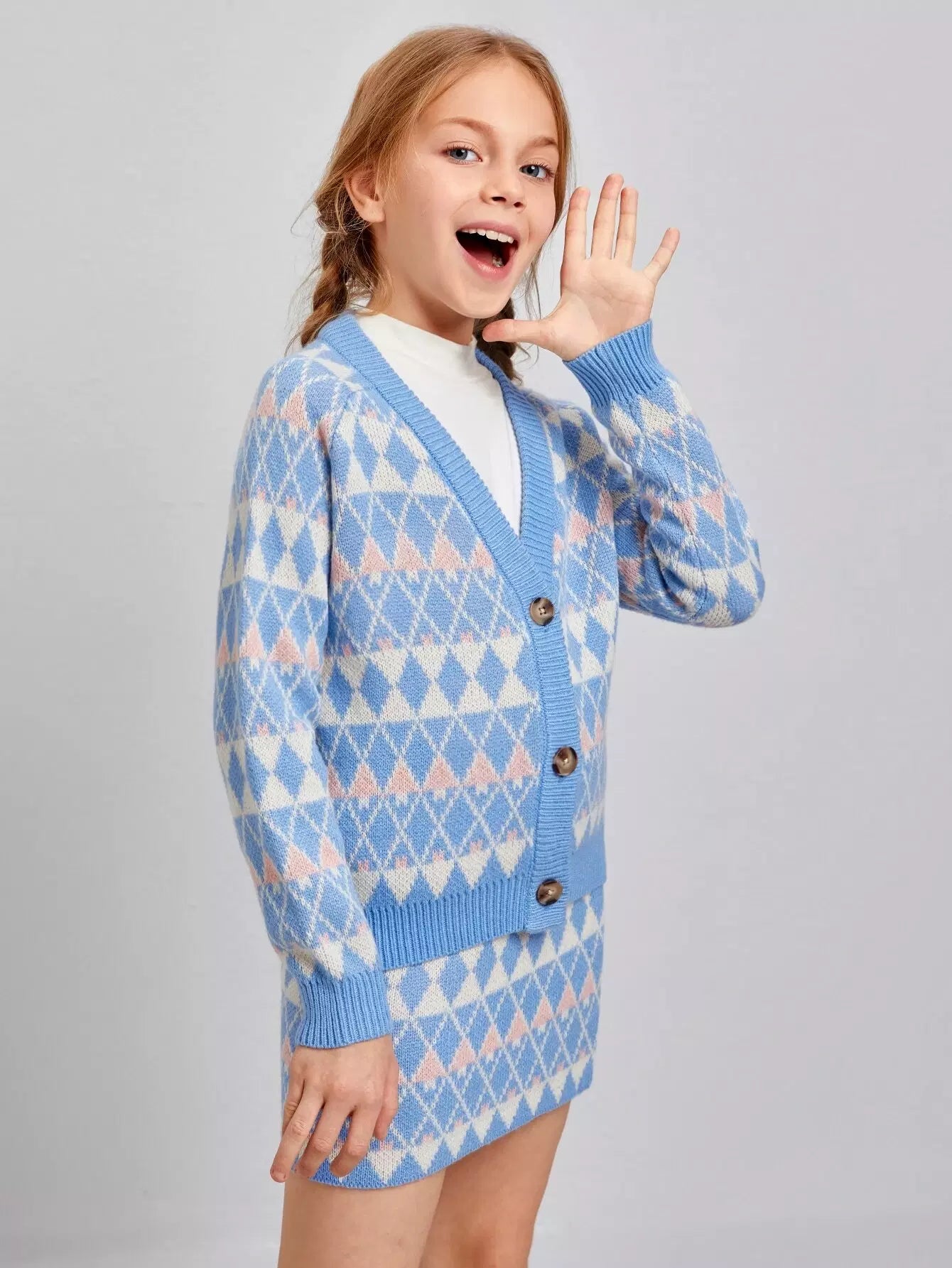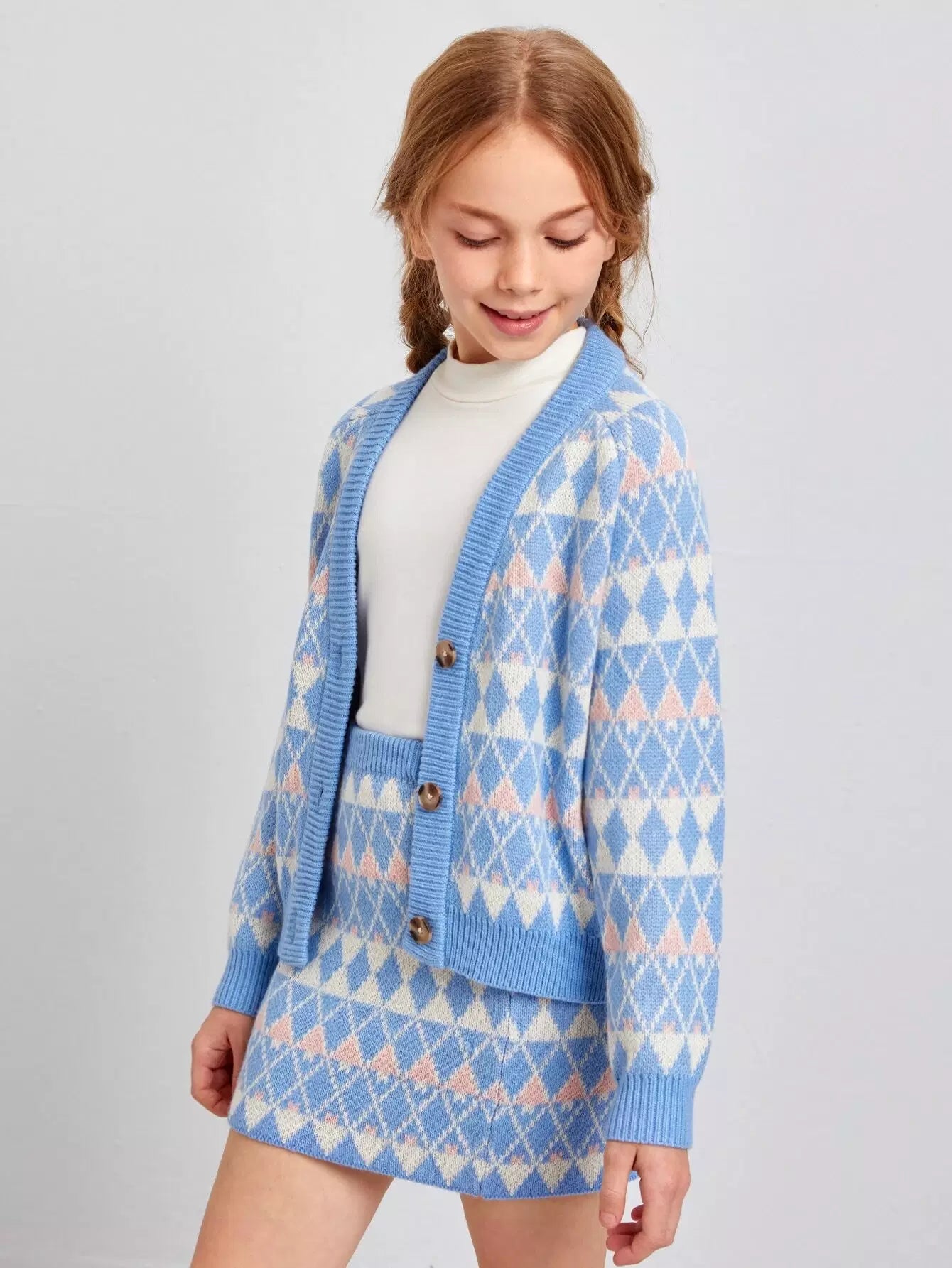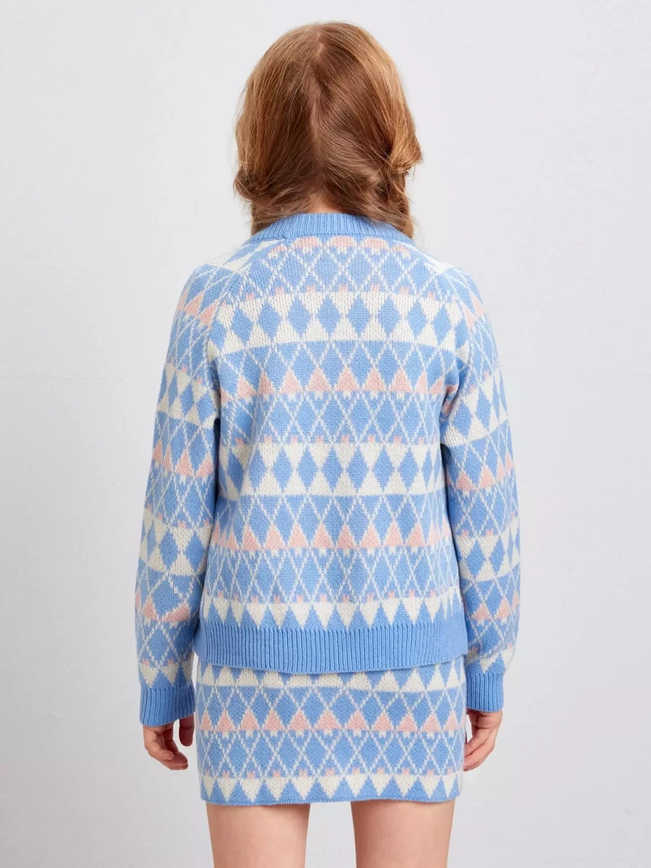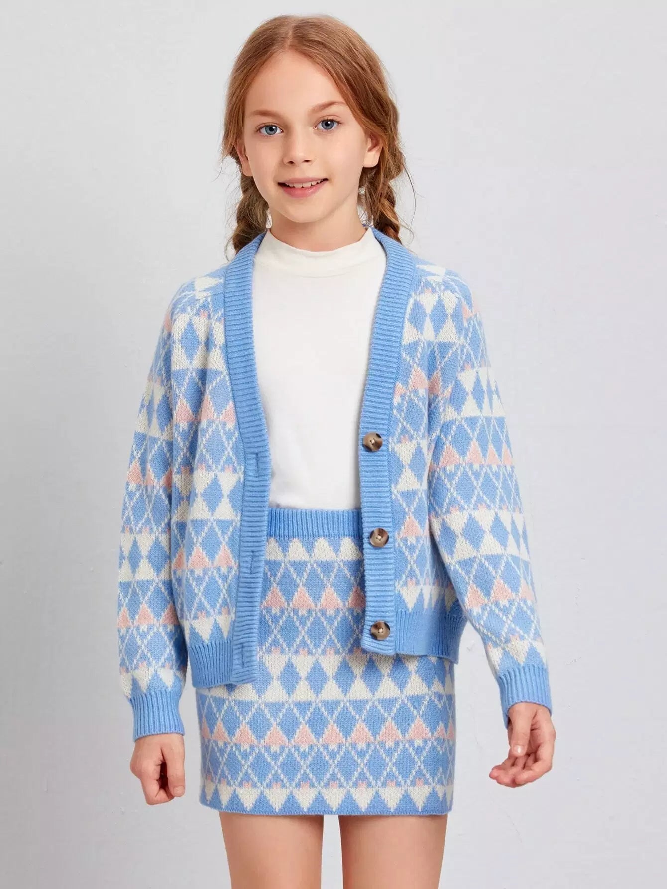 Girls Raglan Sleeve Argyle Pattern Cardigan & Skirt Set