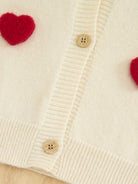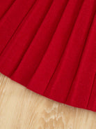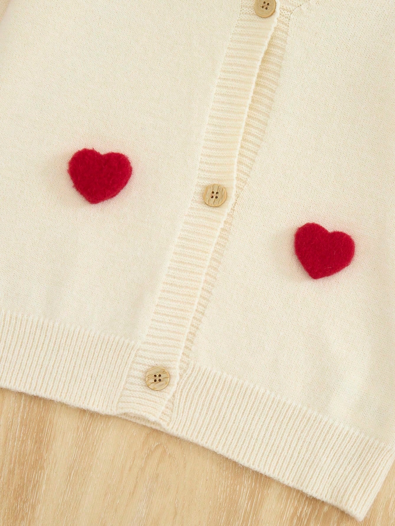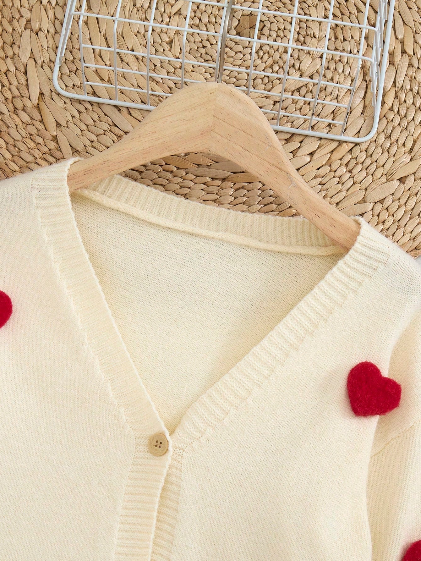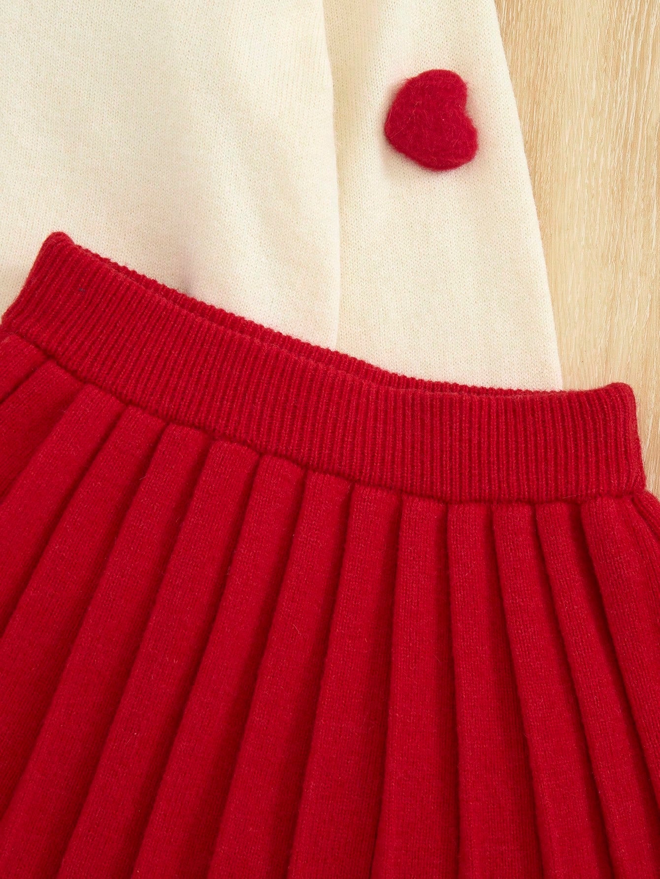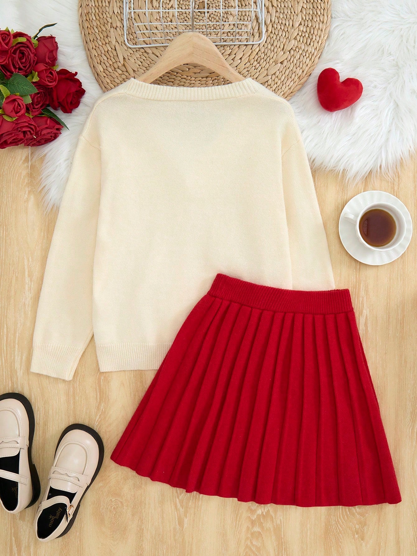 Tween Girls 2pcs Korean Style V-Neck Heart Patch Long Sleeve Cardigan & Red Pleated Mini Skirt Set, Autumn