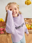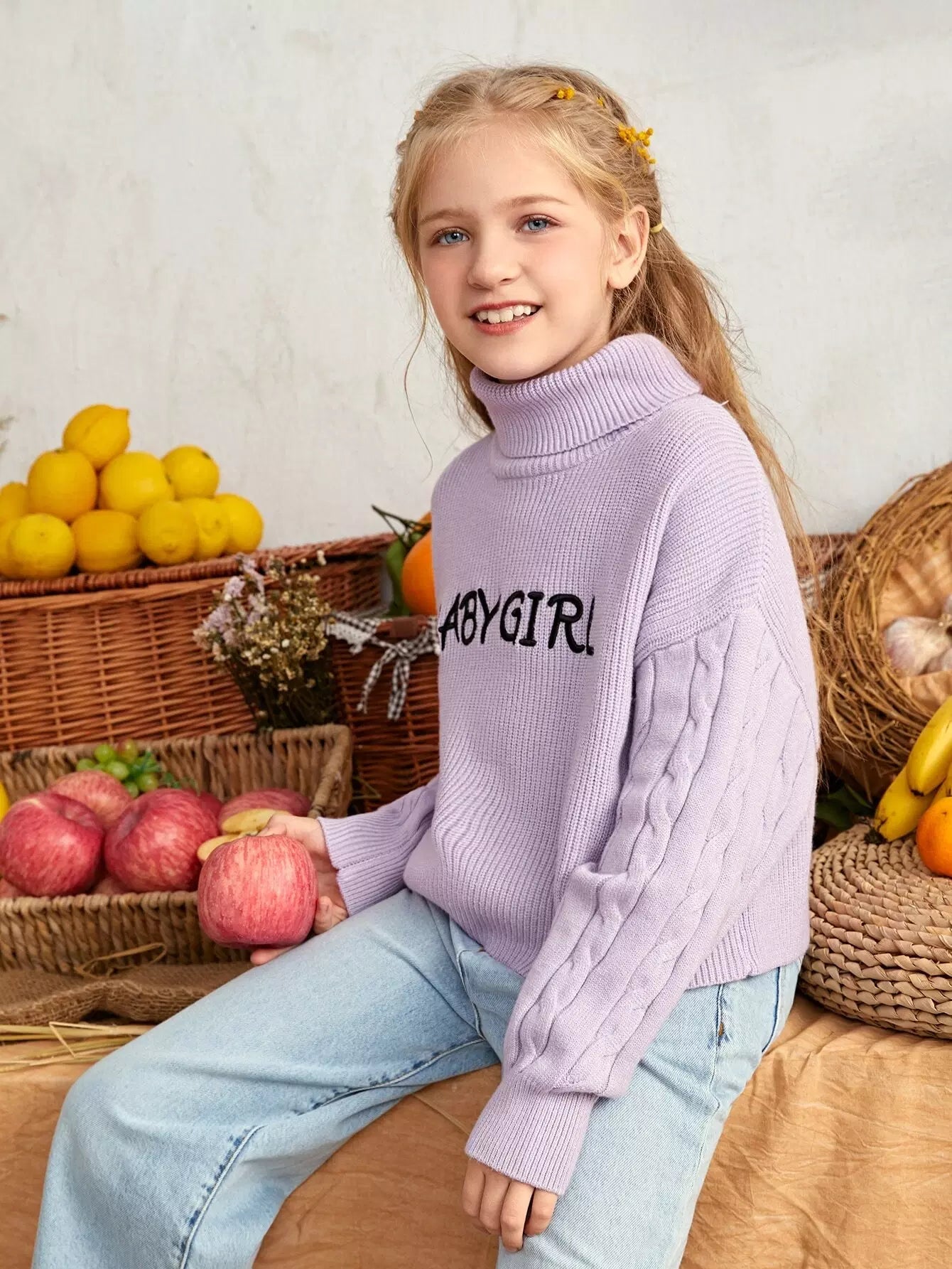 Girls Rolled Neck Letter Embroidered Cable Knit Sleeve Sweater