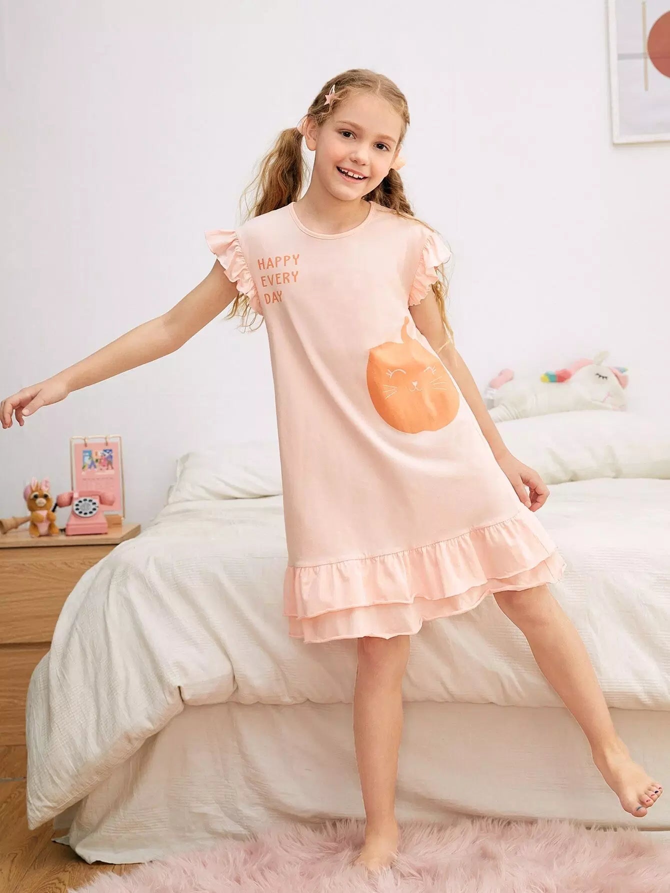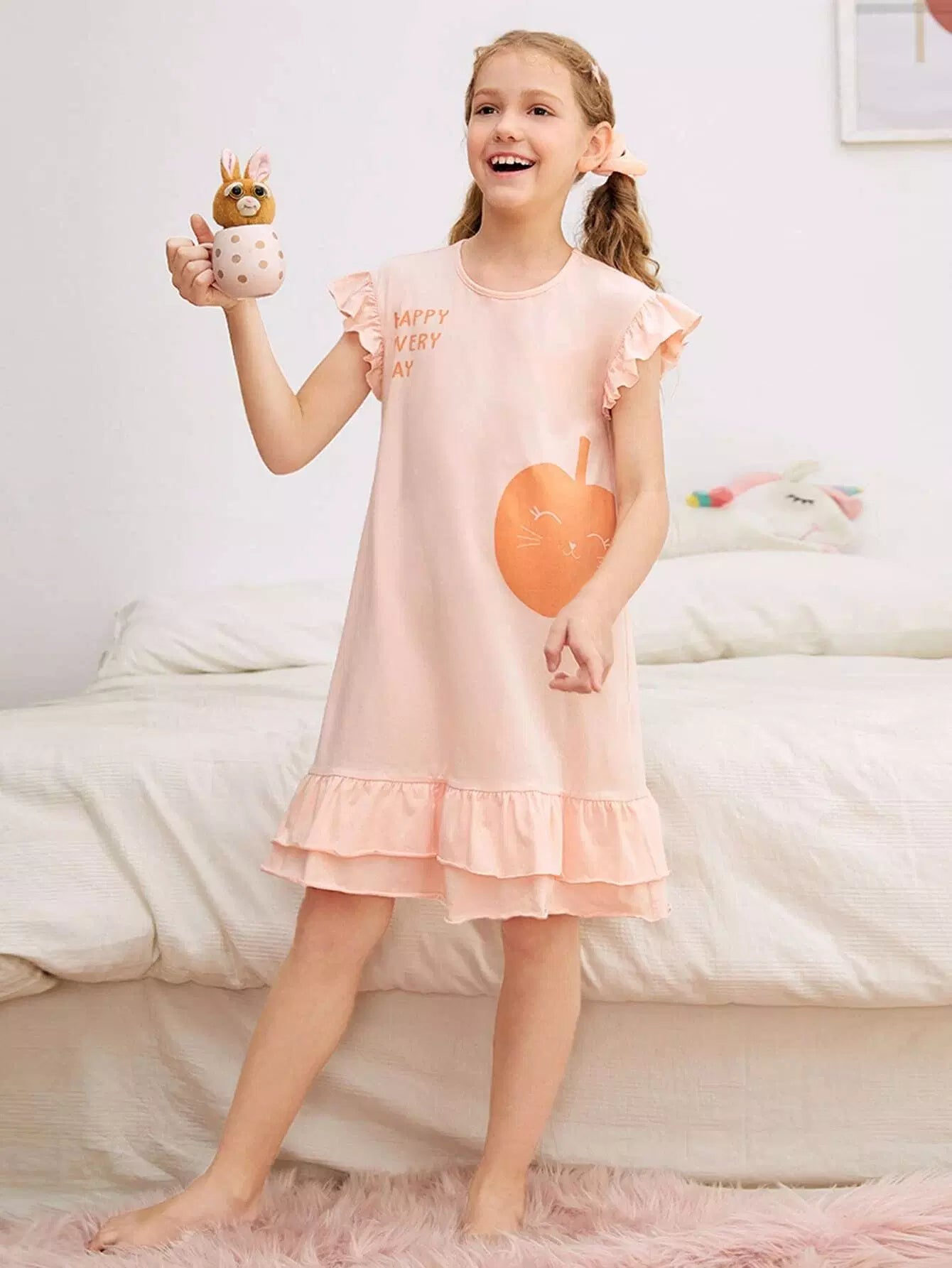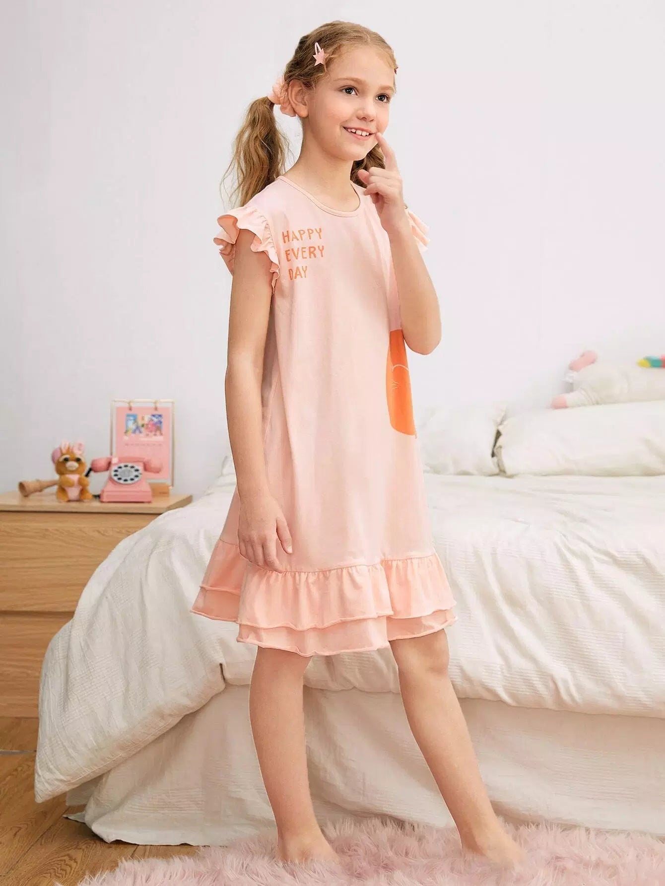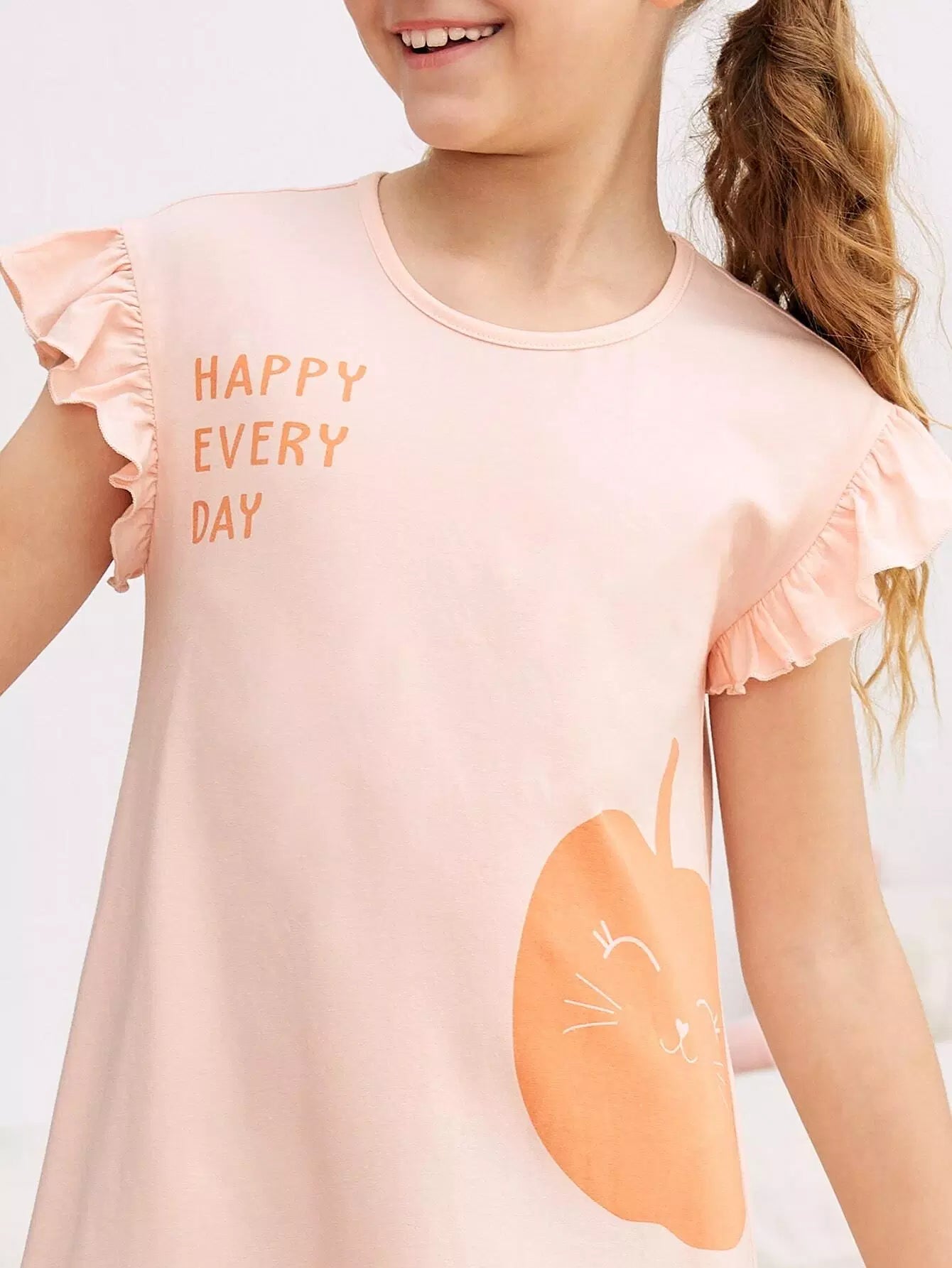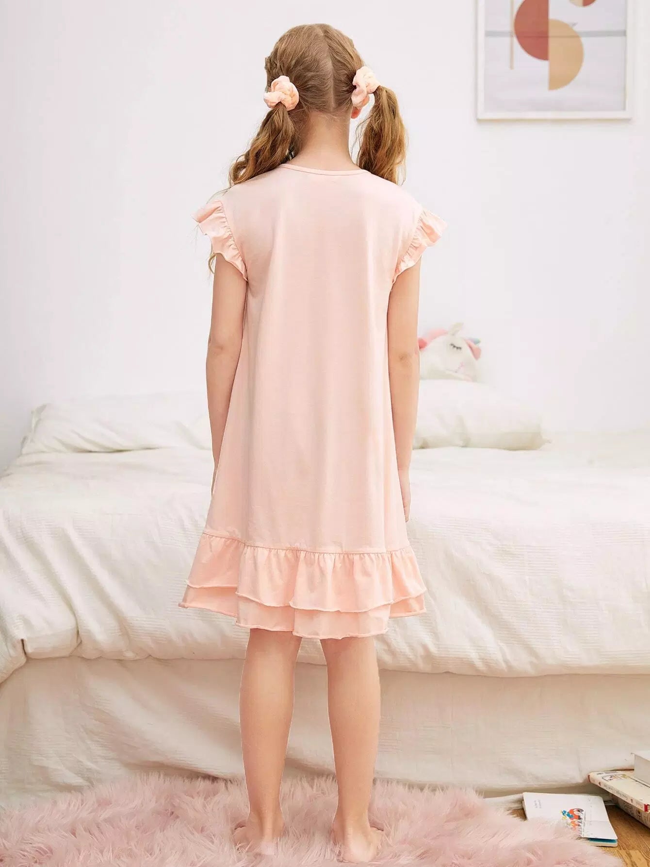 Girls Ruffle Trim Slogan & Cartoon Graphic Nightdress