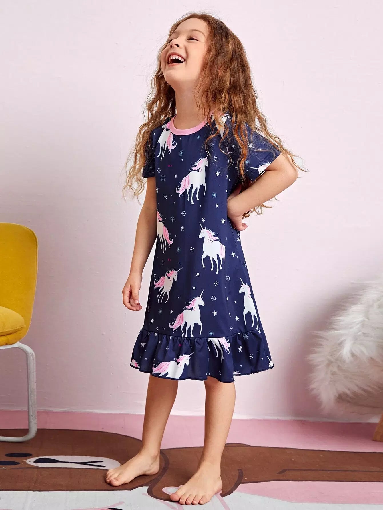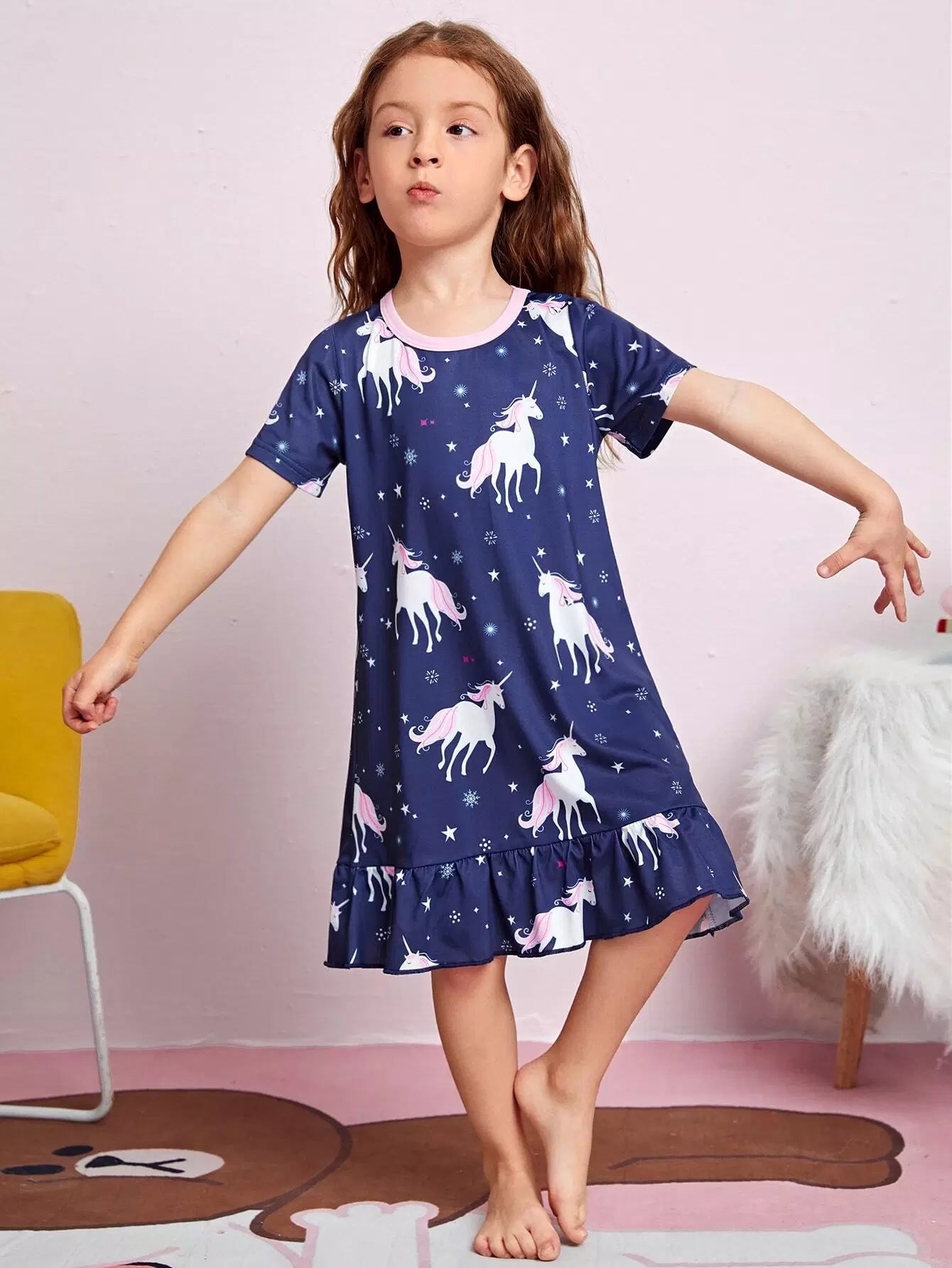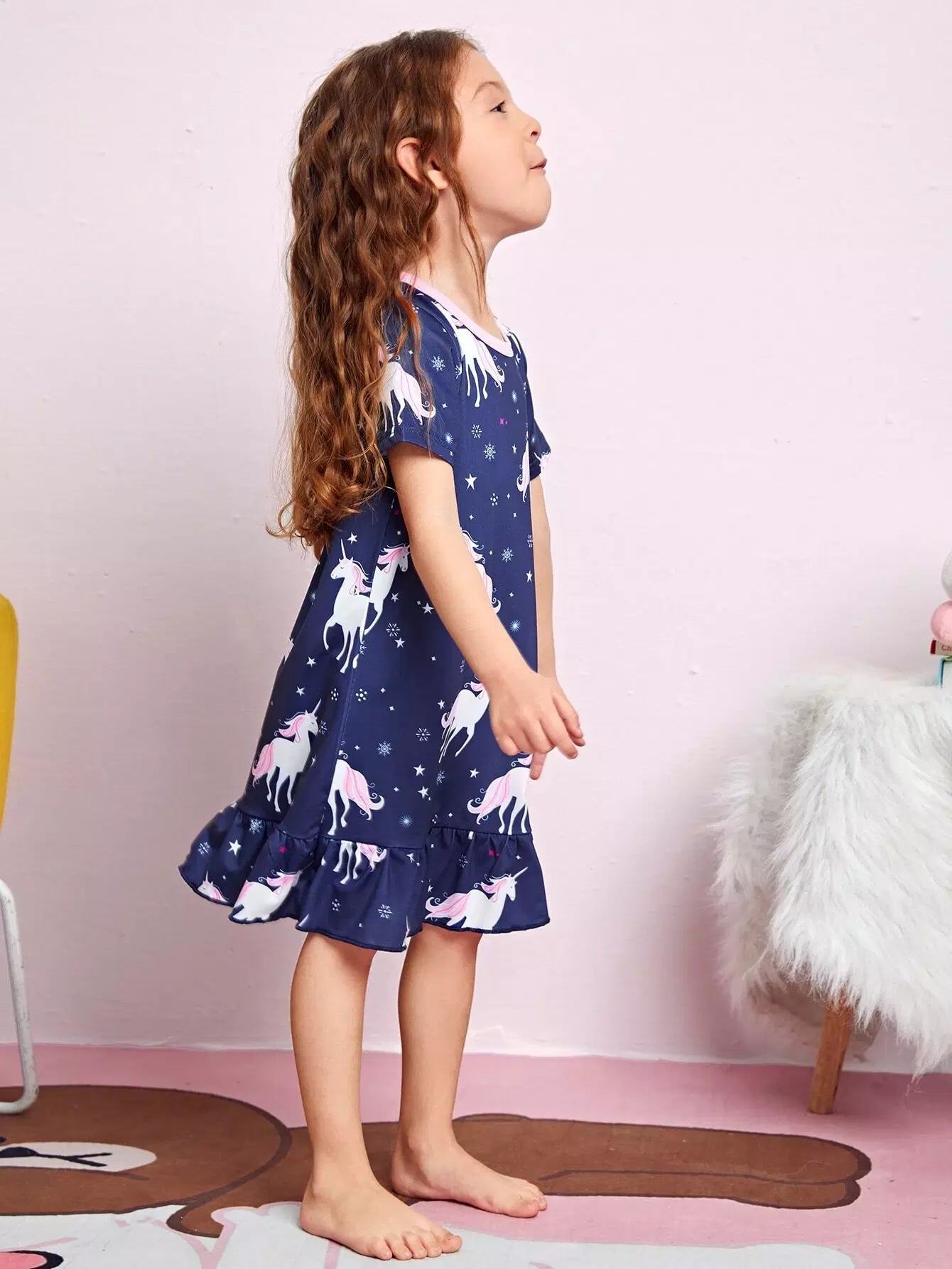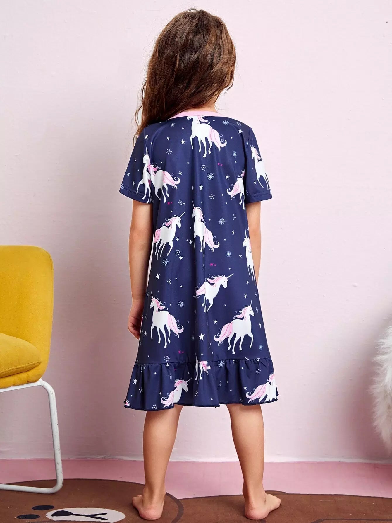 Kids - Toddler Girls Snowflake & Unicorn Print Ruffle Hem Sleep Dress