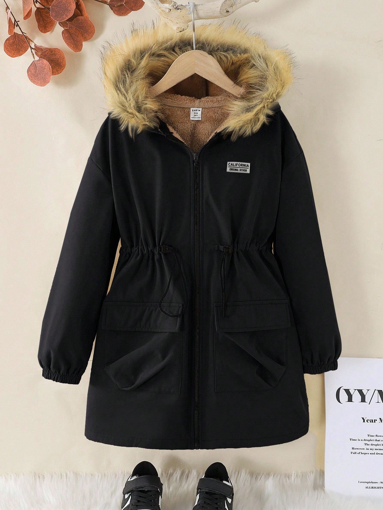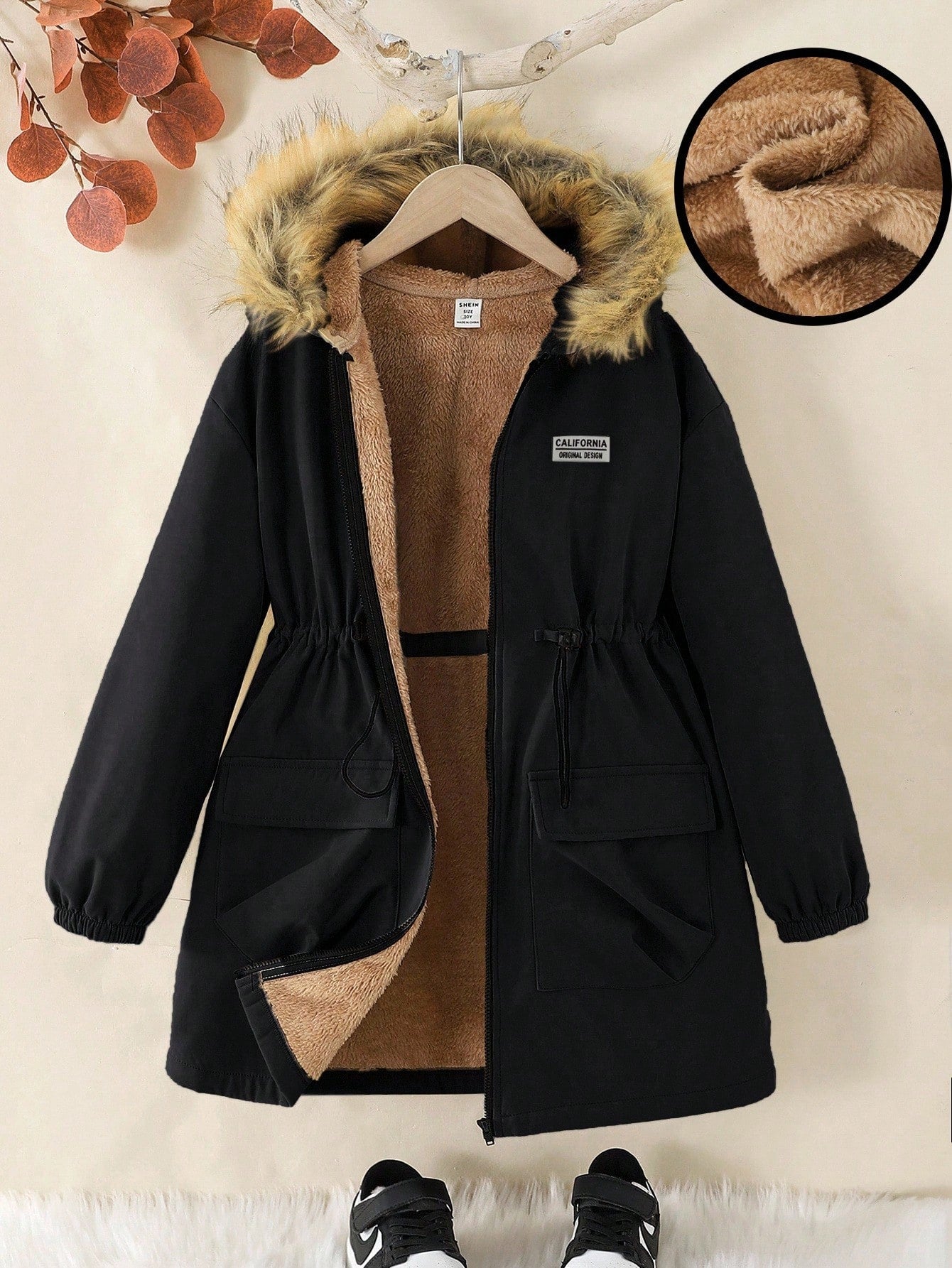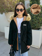 Tween Girls Casual Streetwear Warm Thermal Lined Cinched Waist Loose Mid-Length Hooded Jacket Outwear